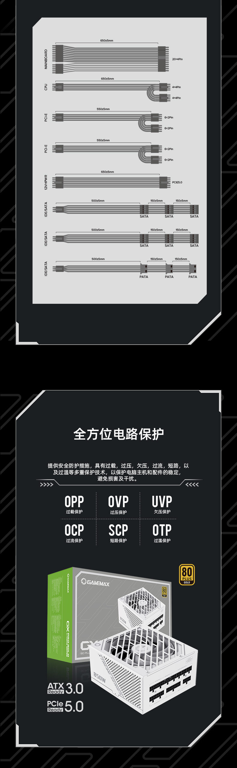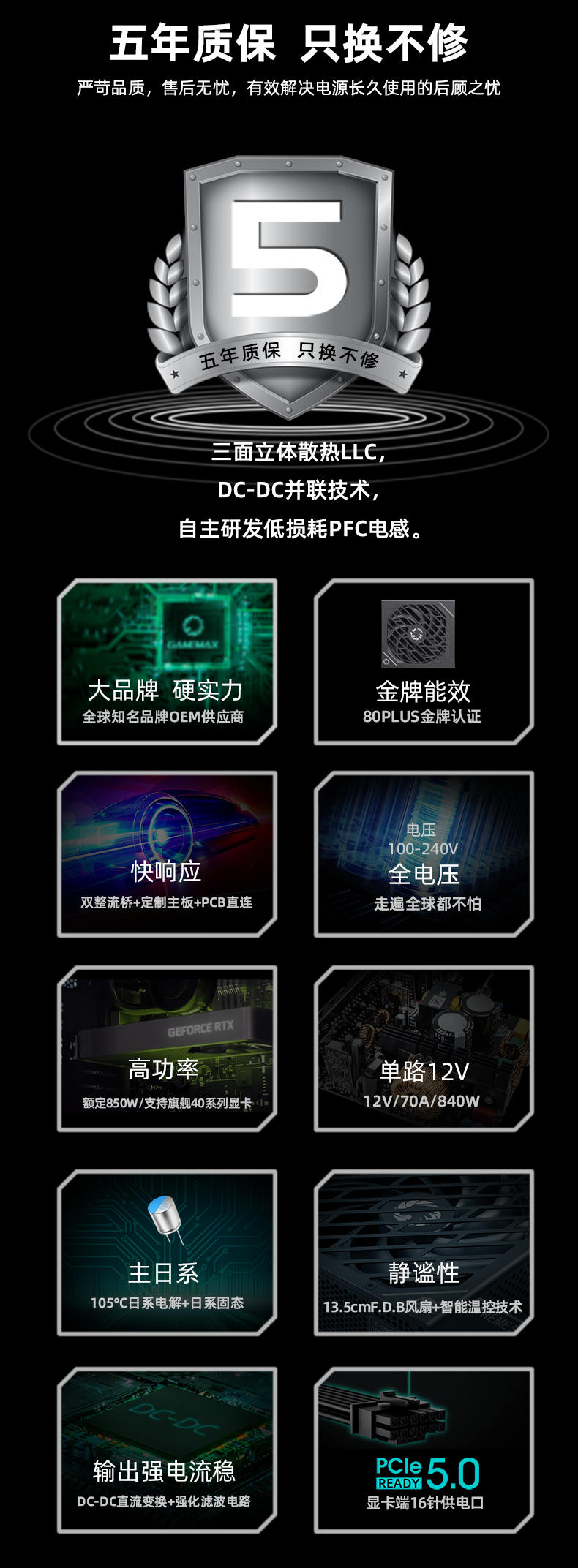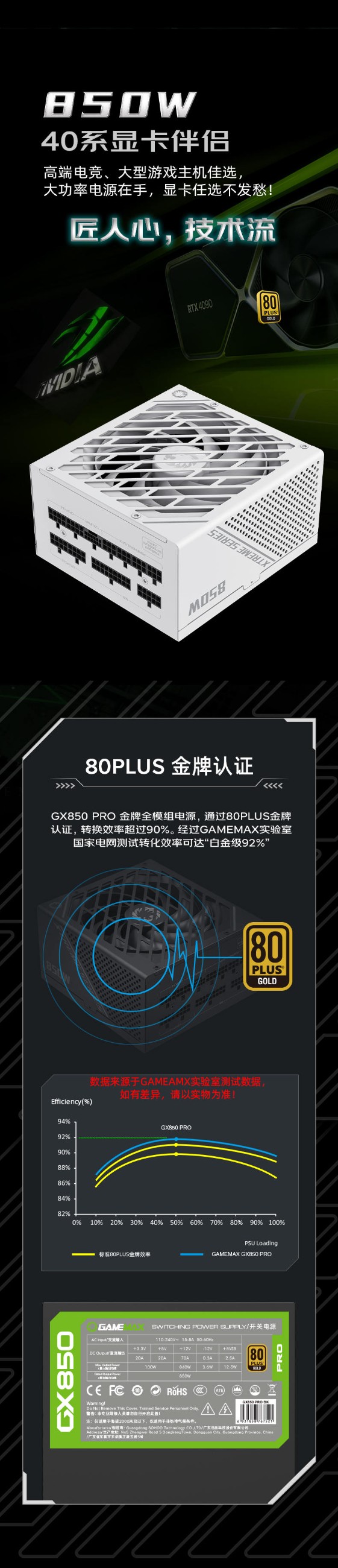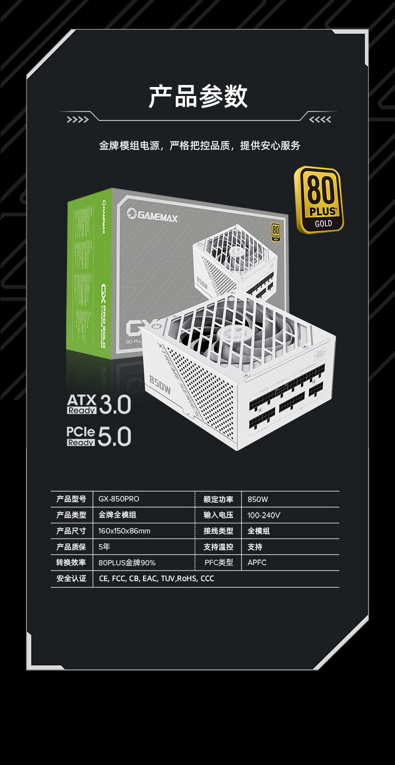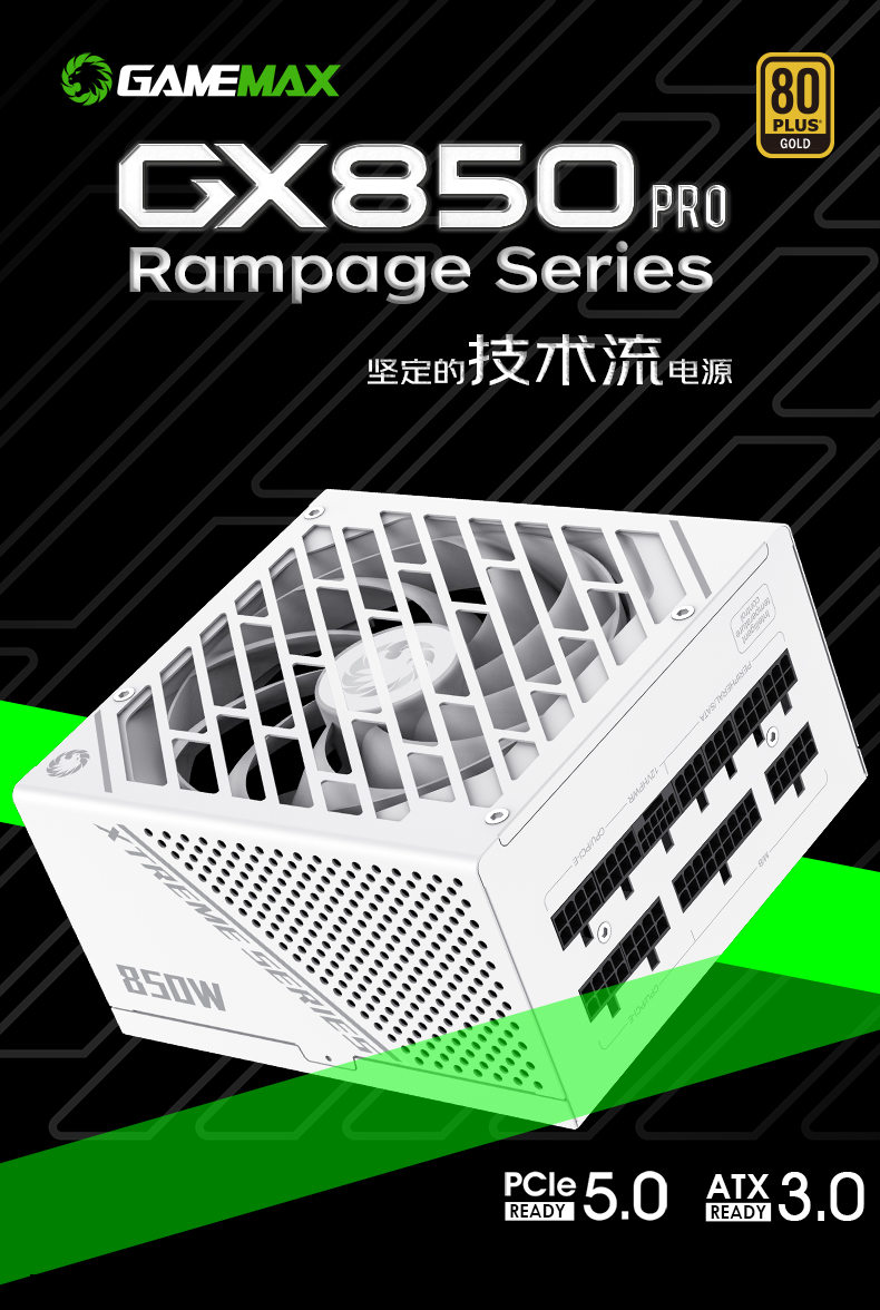 GAMEMAX凌雲GX-850W专业版技术流日系电容ATX3.0电源(可编程LLC/双联DC-DC/数控APFC/13.5涡轮轴流扇PCIe5.0)