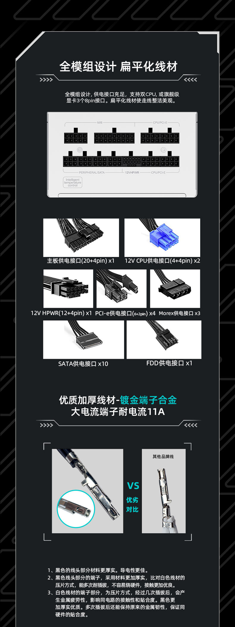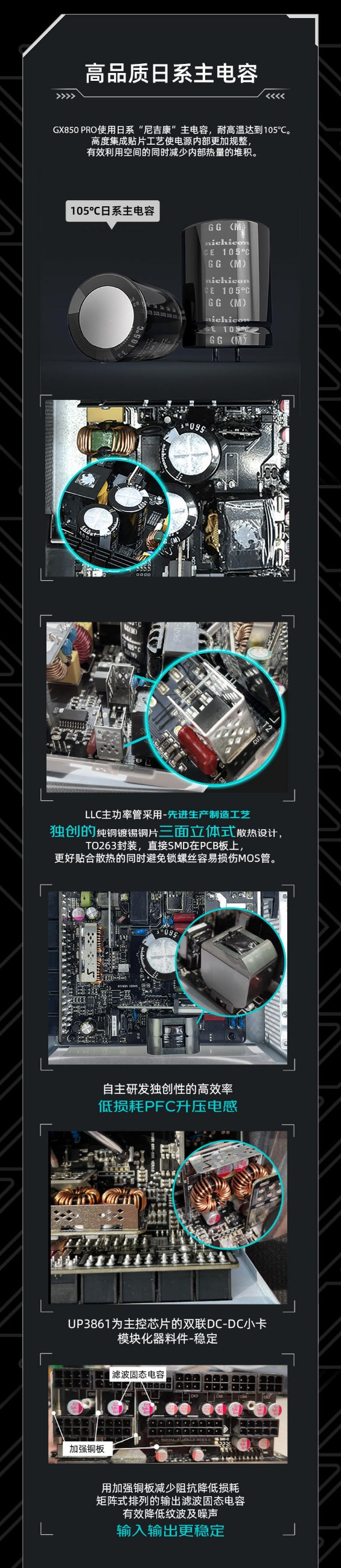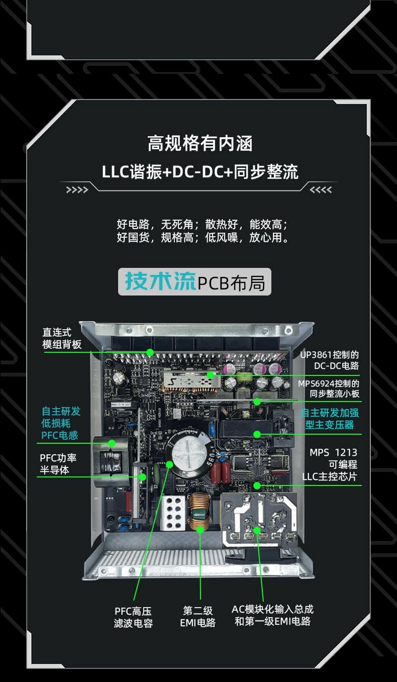 ?模组电源接口输入,矩阵式排列的输出滤波固态电容有效降低纹波及噪声,用加强铜板减少阻抗降低损耗。
