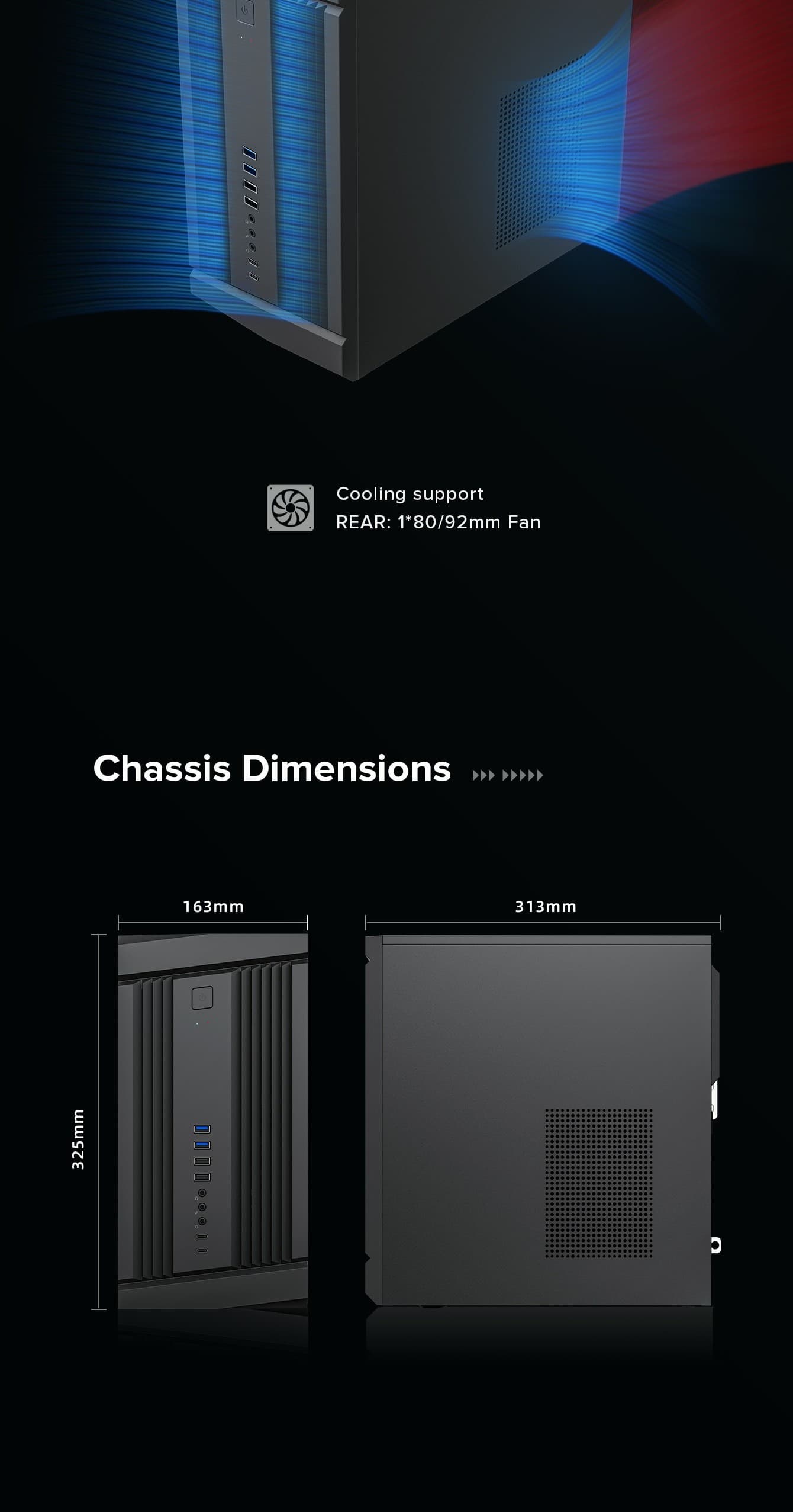 | Dimensions | Chassis | (L)285*(W)163*(H)320mm |