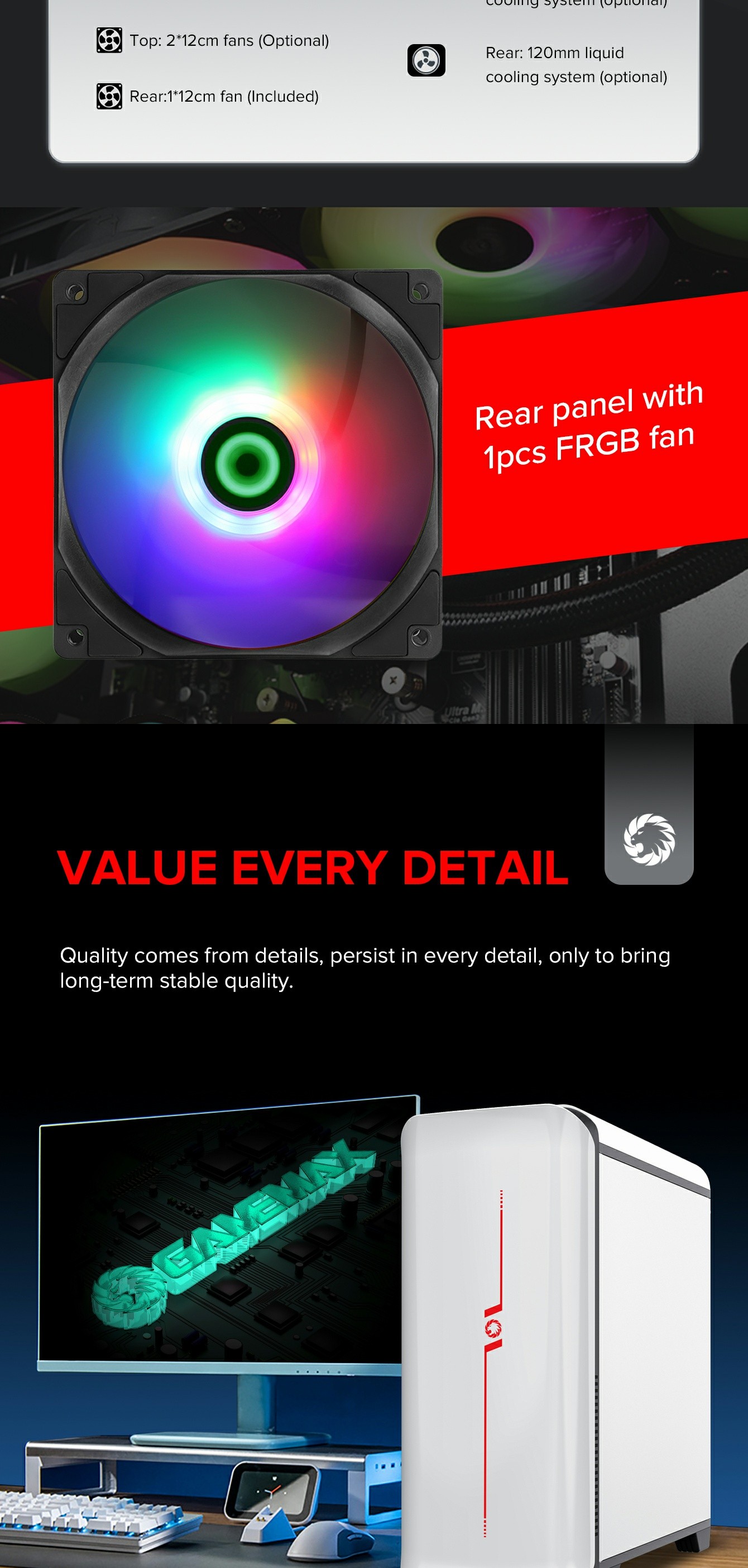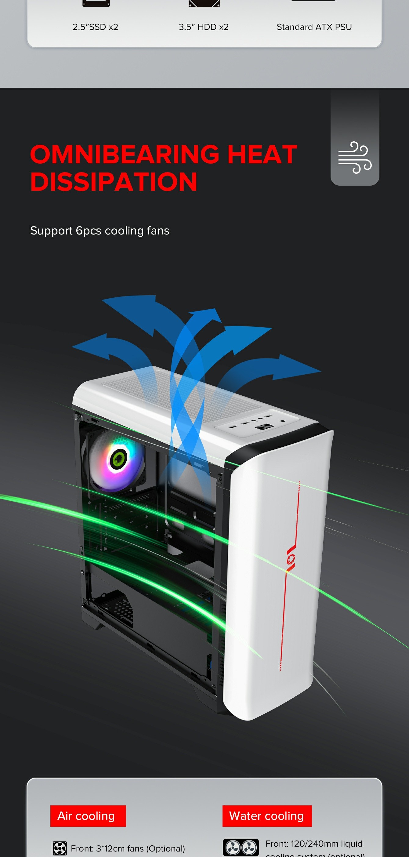 The cooling system allows for up to 6 x 120mm fans, or 3 x 120mm fans and a 240mm water cooling radiator.