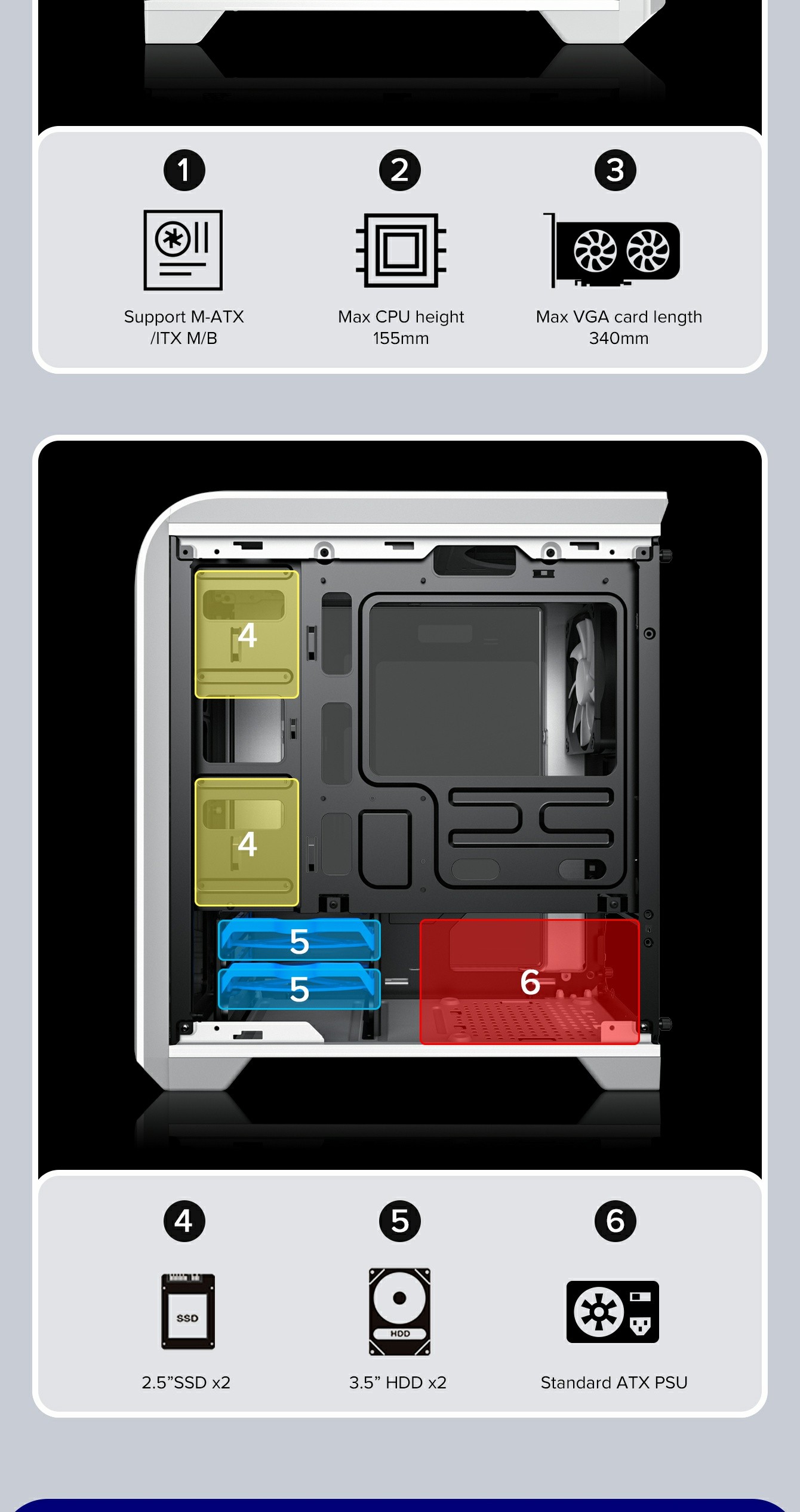 supporting Micro ATX and Mini iTX motherboards, and up to 4xHDDs 2x2.5 &2x3.5 or 4x2.5
