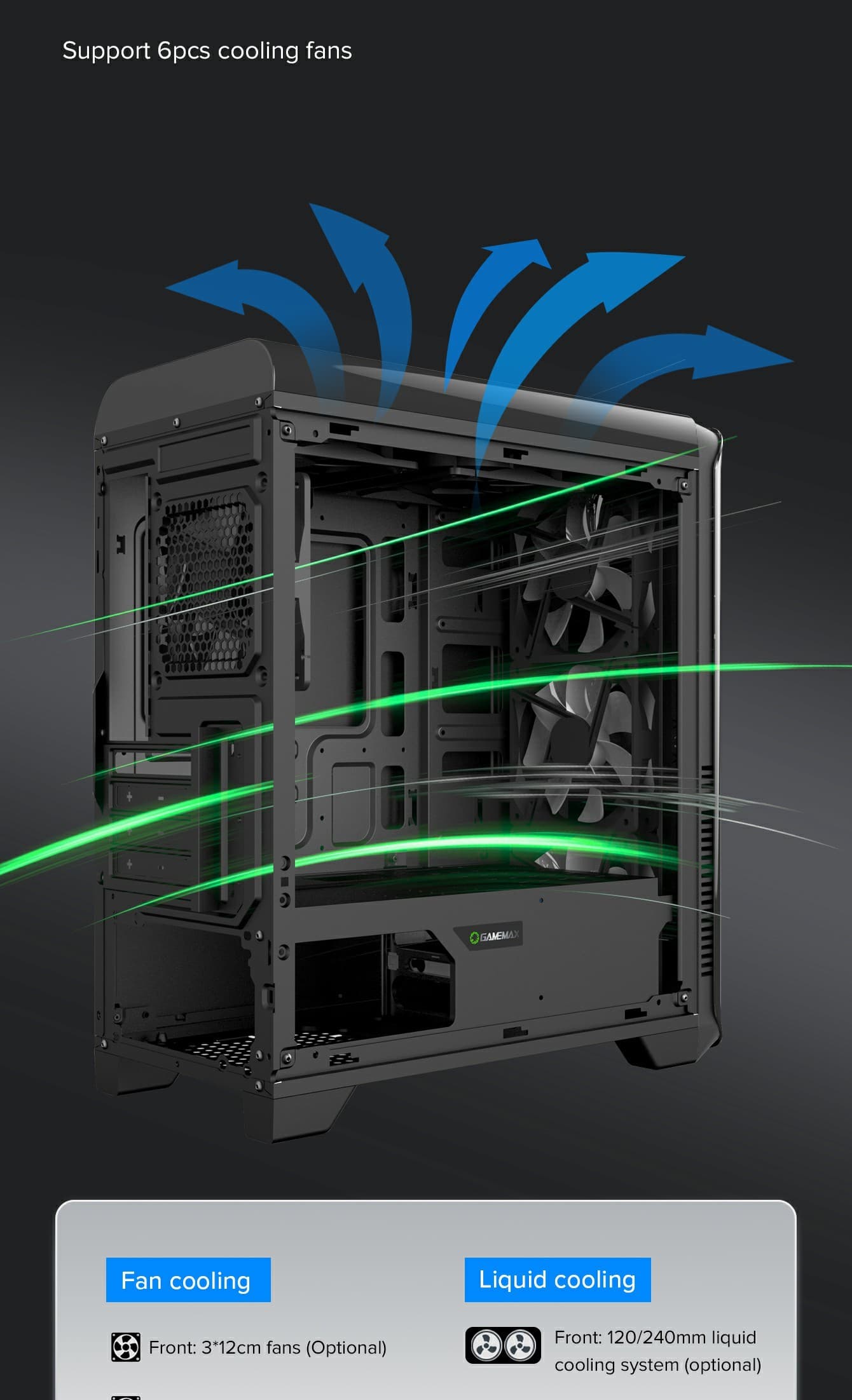 Water cooling support - 240mm watercooling support or 3 x 120mm fan cooling on front