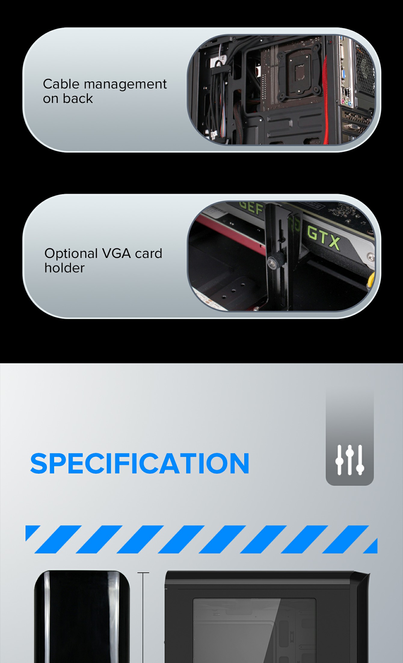 GPU card Support - Optional VGA holder,for reduce loose connection during transportation.