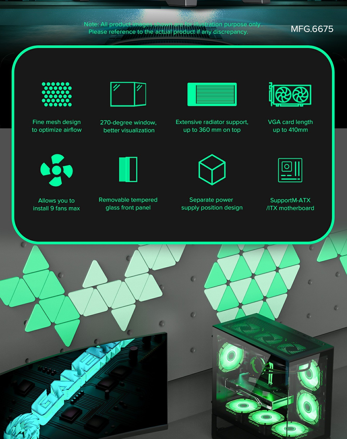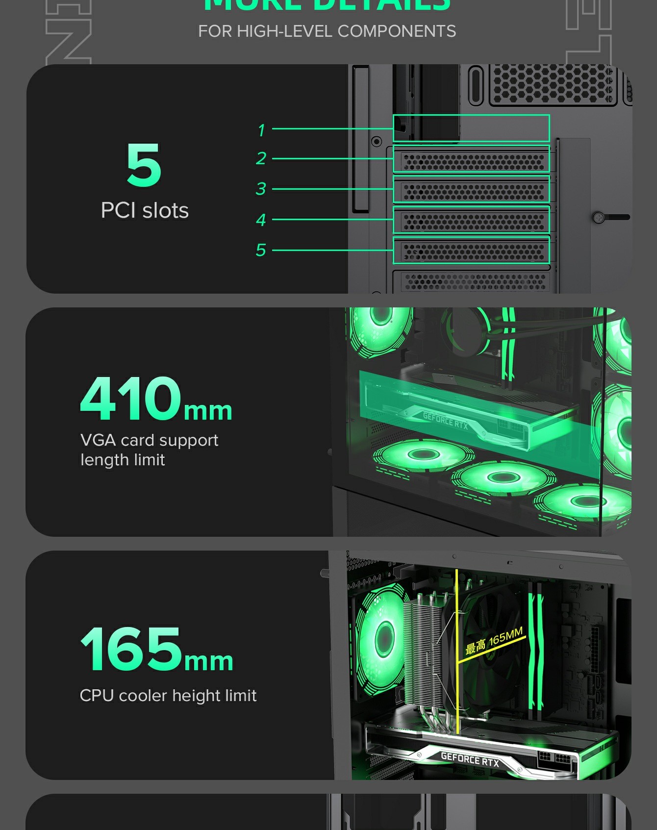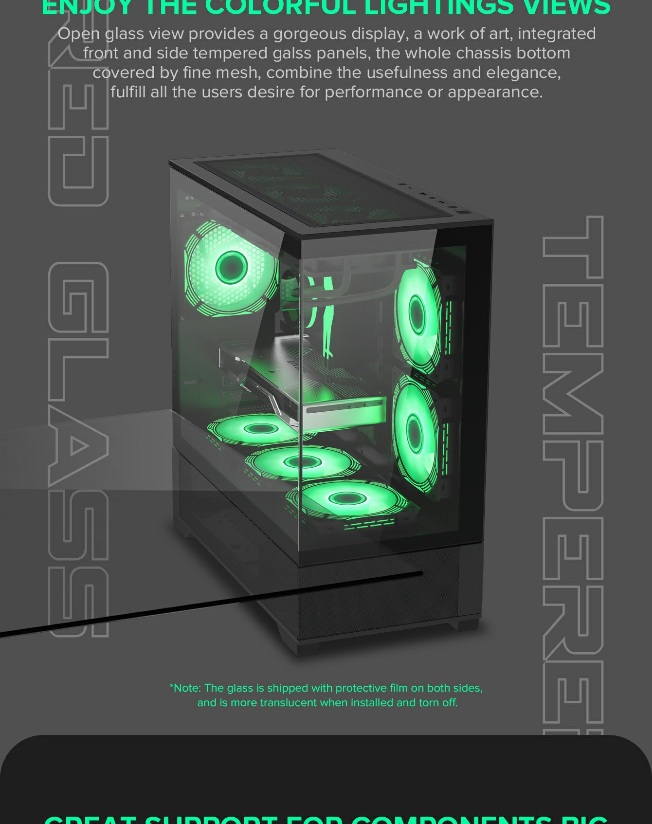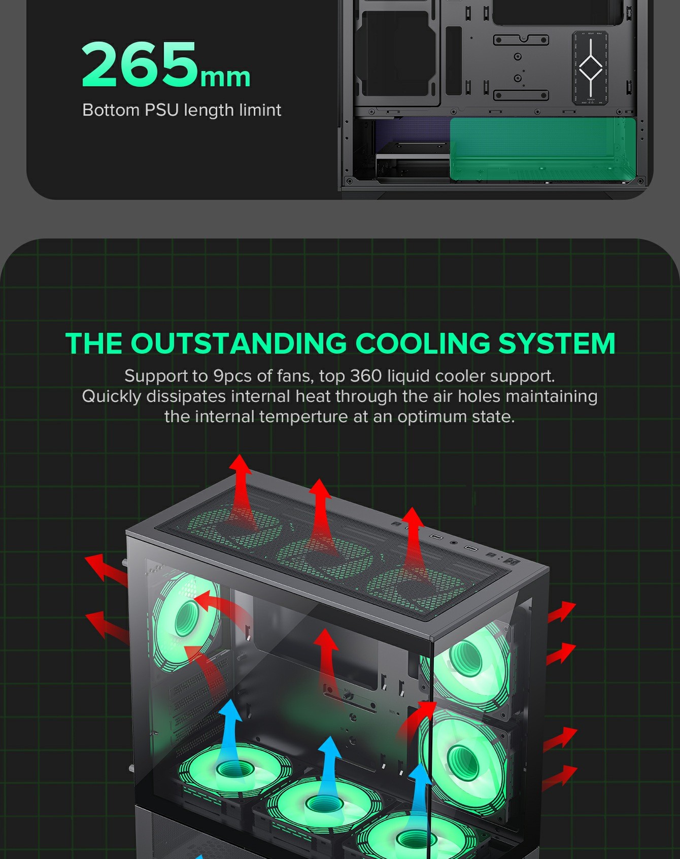 | PSU Cover | 3x120mm (Reverse fan blade)(Fan optional) | |