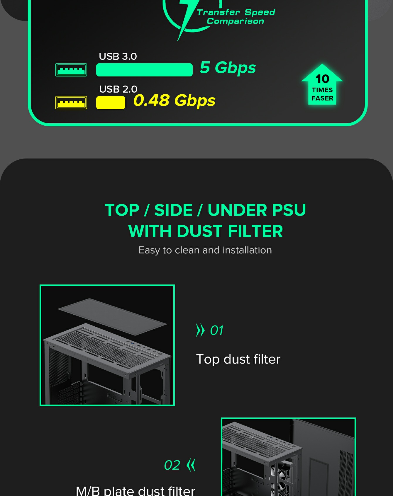 | Dust Cover | Bottom, right side panel and top cover with dust filter | |