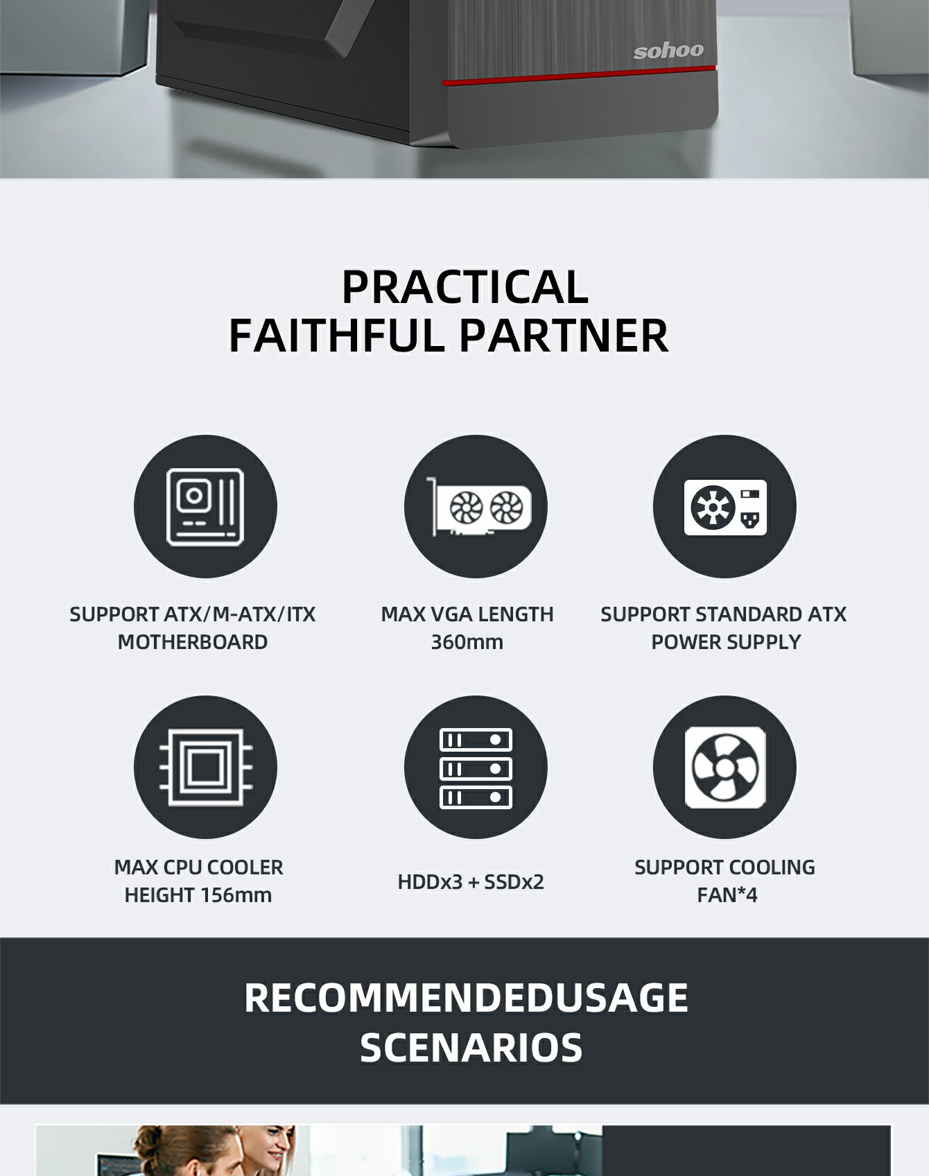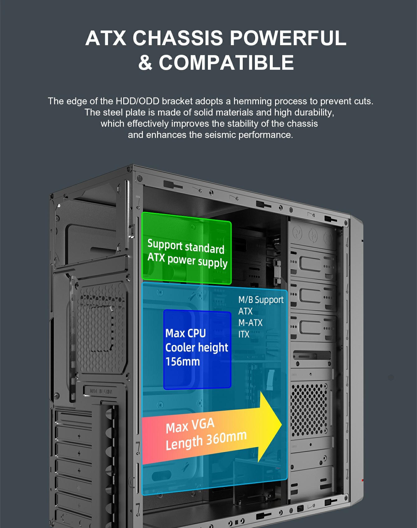 The Chassis is compatible with Standard ATX, Micro ATX, and Mini ITX motherboards.