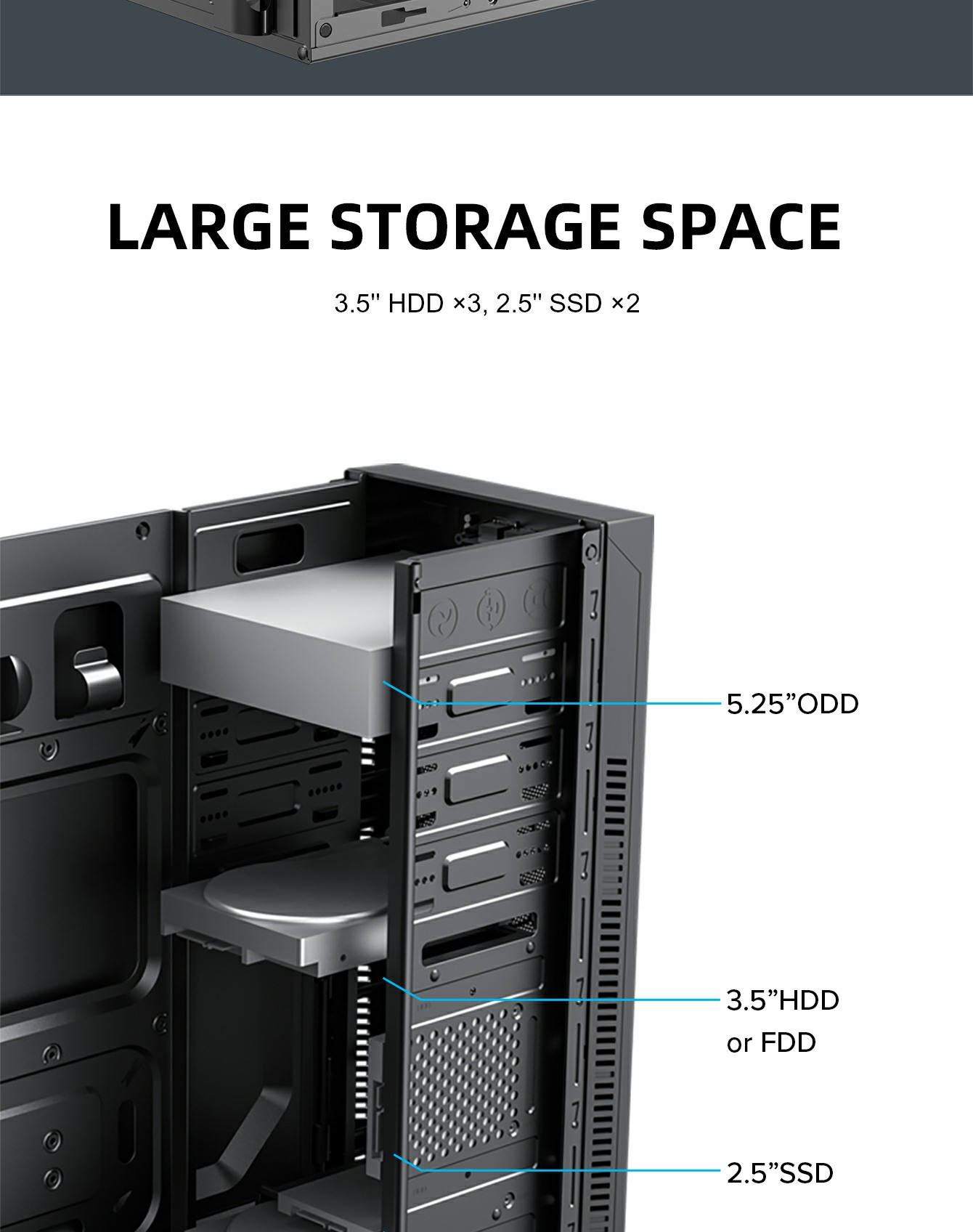 The chassis fully supports up to 5 x HDDs (2 x 2.5, 4 x 3.5 (1 x shared)