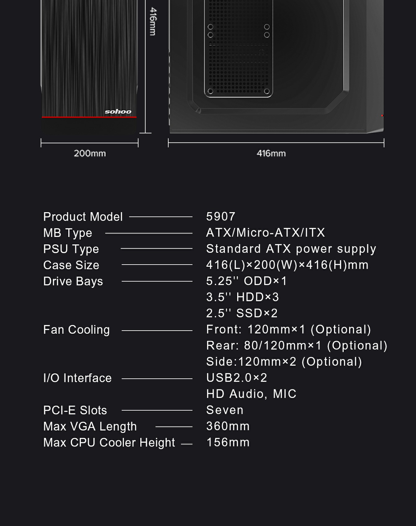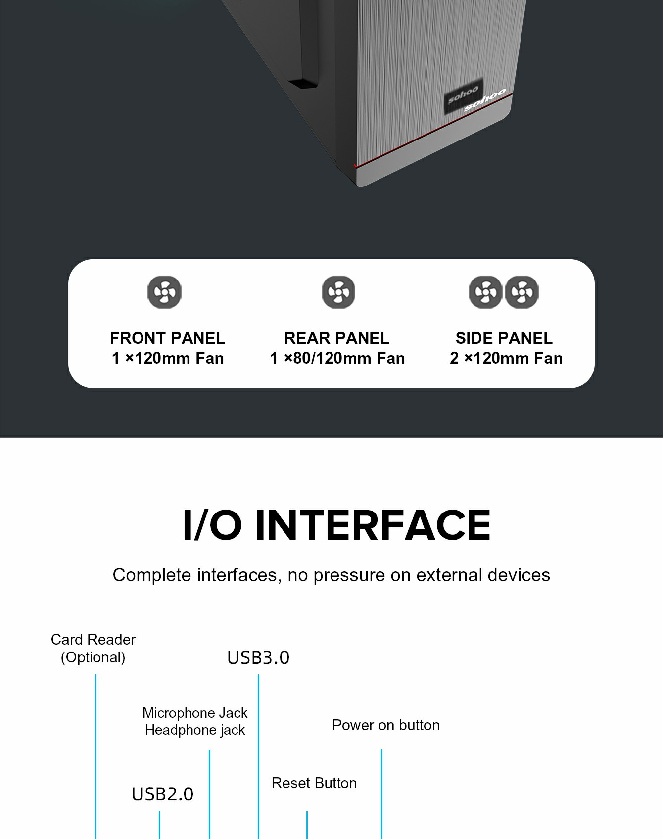 The cooling system on the chassis allows for up to 3 x 120mm fans (comes with 1 x 80mm rear fan)