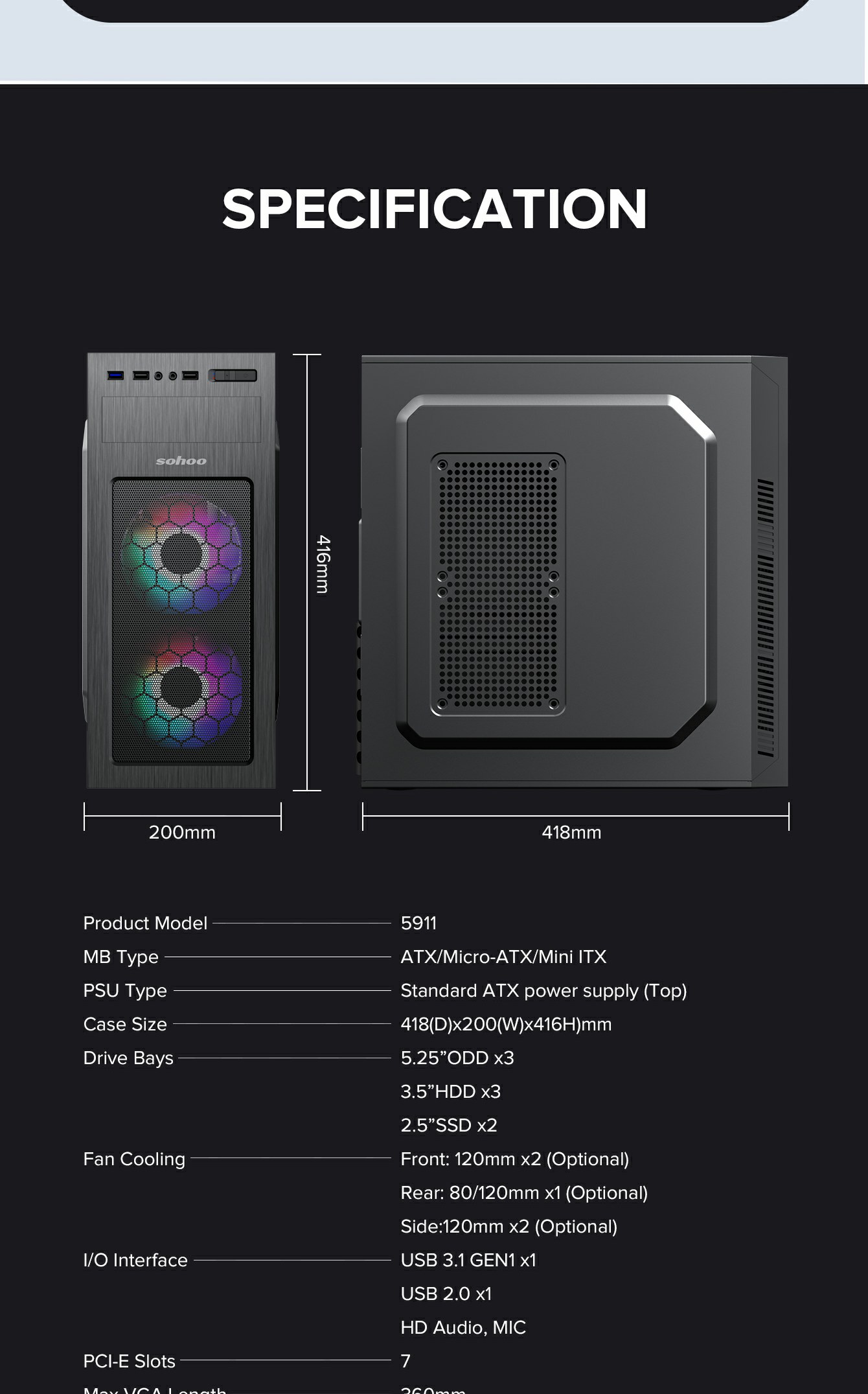 Cooling Side:Space for 2 x 120mm fans(Optional)