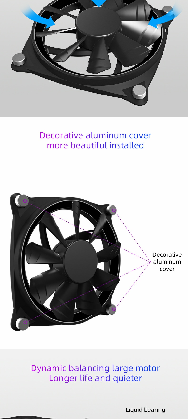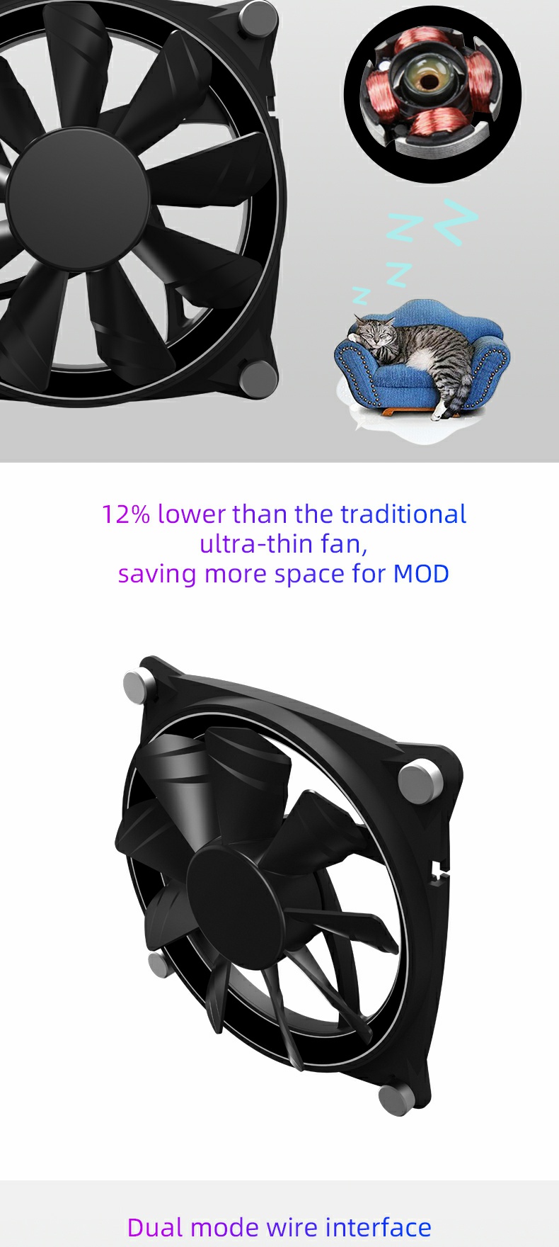 5. The sickle type design is matched with the floating fan blade, which increases the air intake side and can also enter the wind. The traditional fan can only enter the wind from the front. Refer to the edge of the “Owl” fan frame for improvement by patents