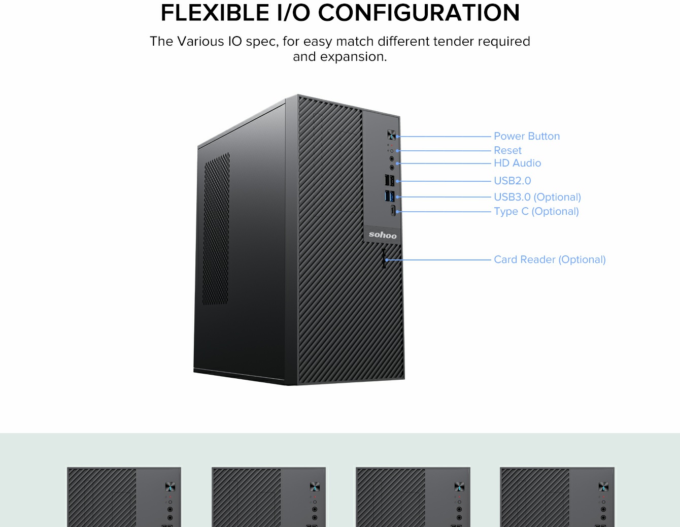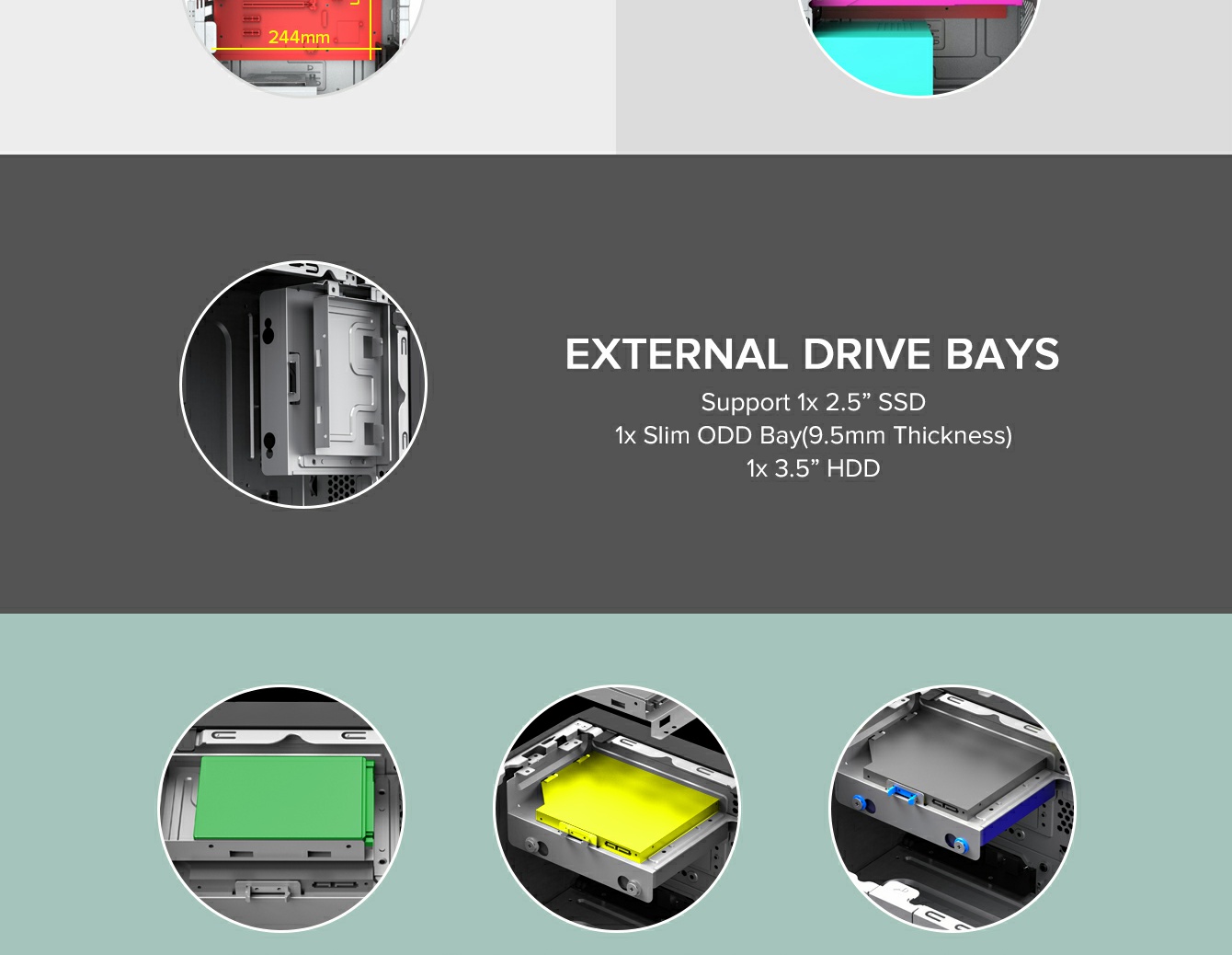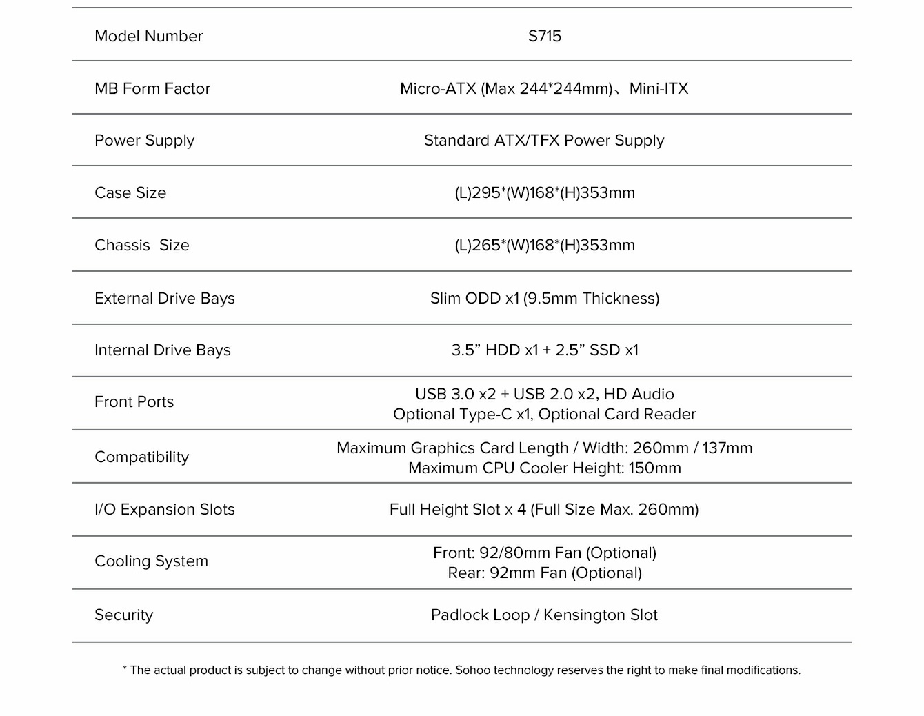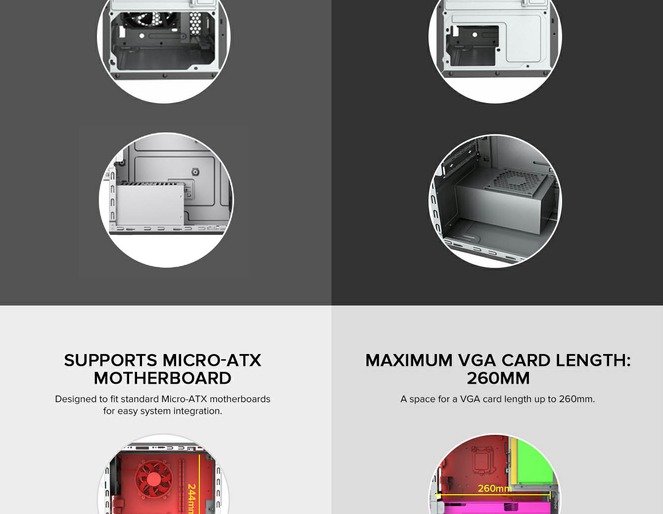 | Motherboard Type : | MATX M/B (Max 244*244mm)/Mini ITX M/B (if use 244*244mm motherboard, the case should be without card-reader on front panel ) |