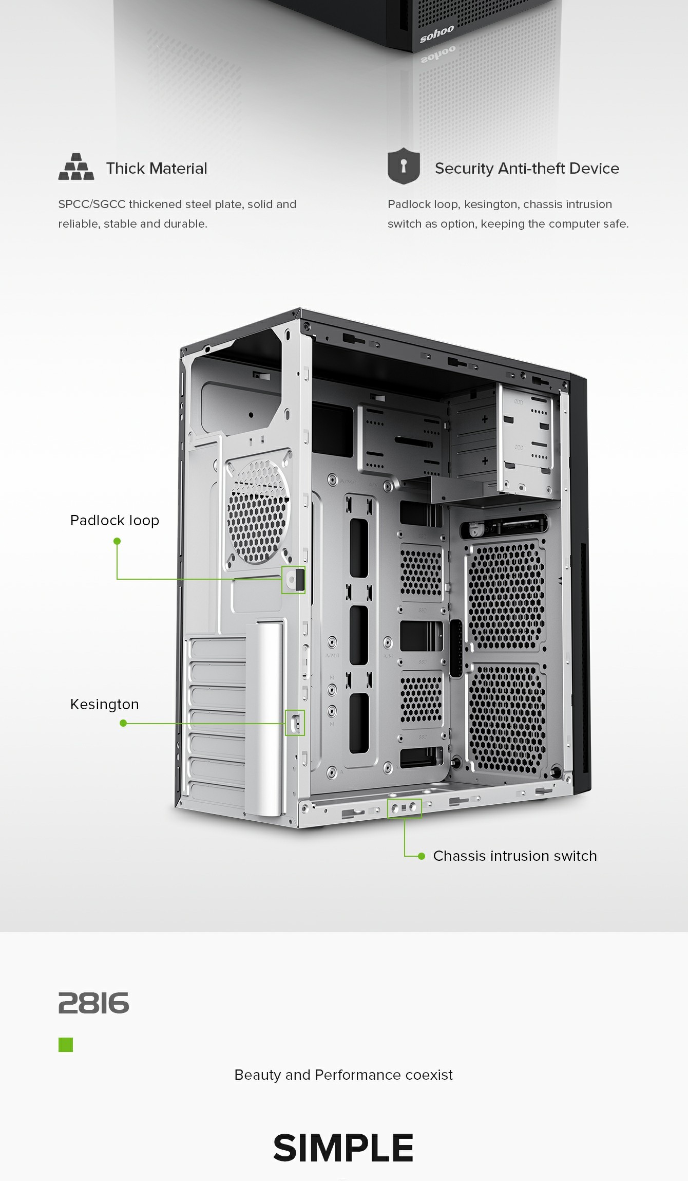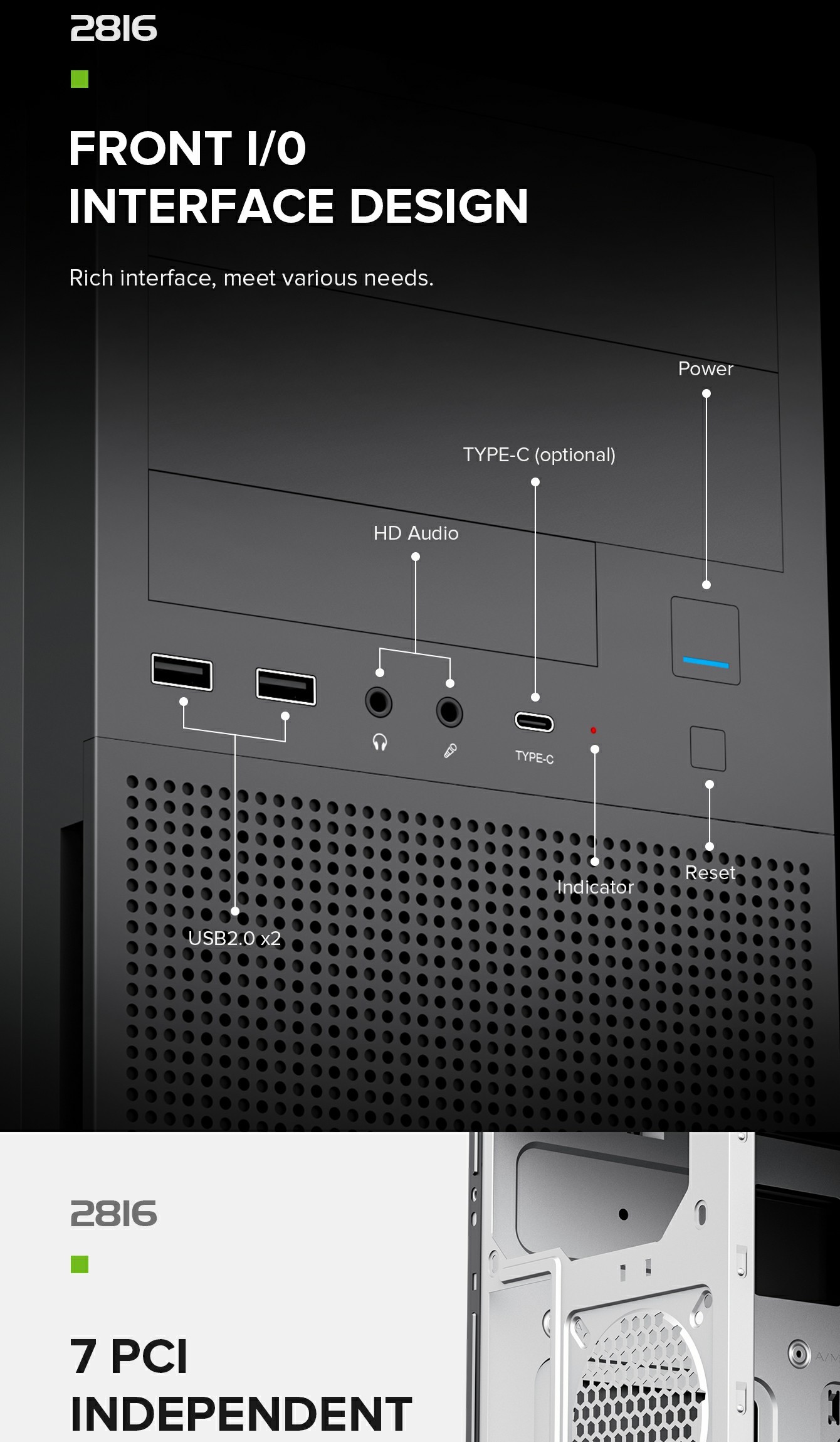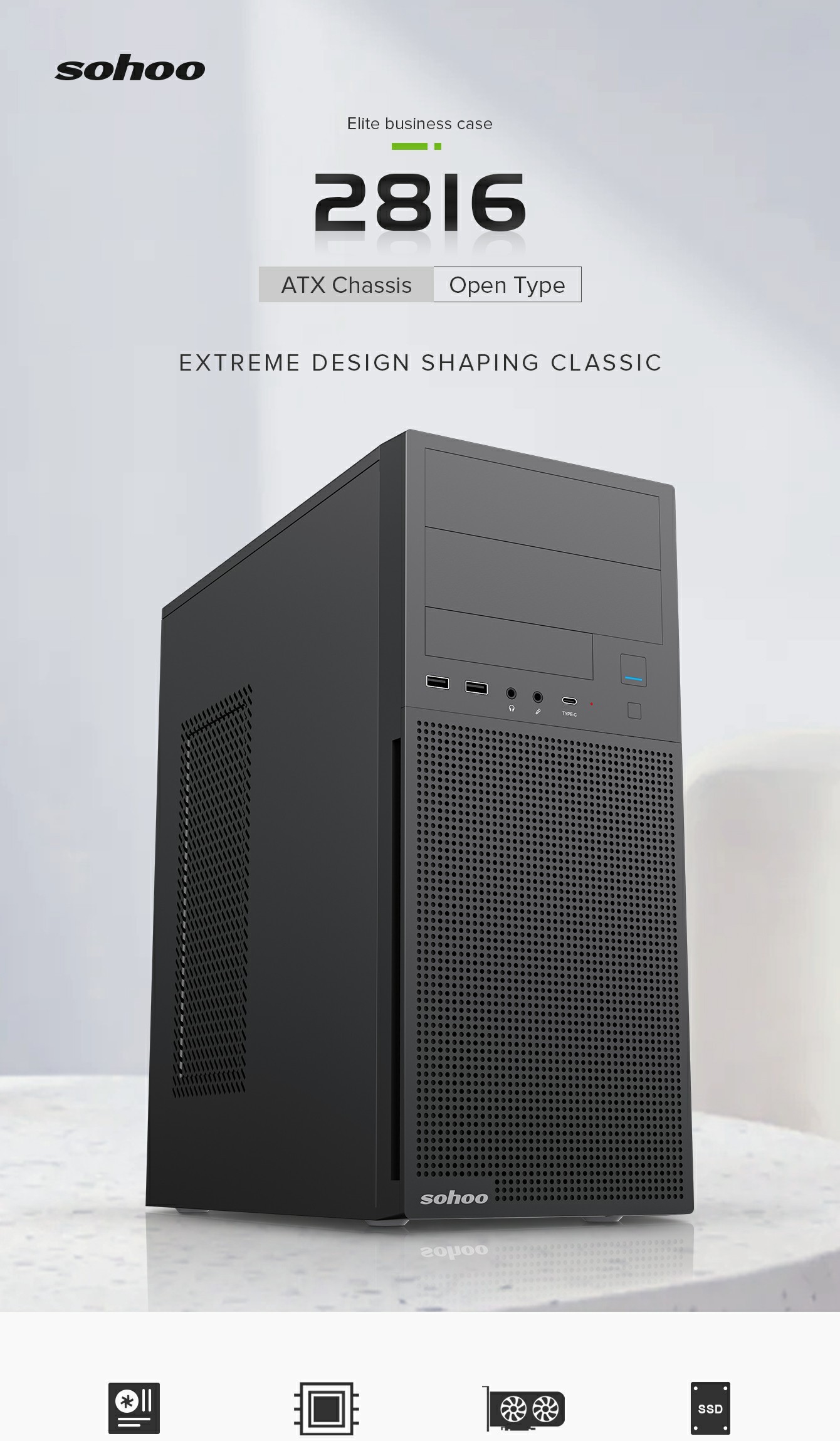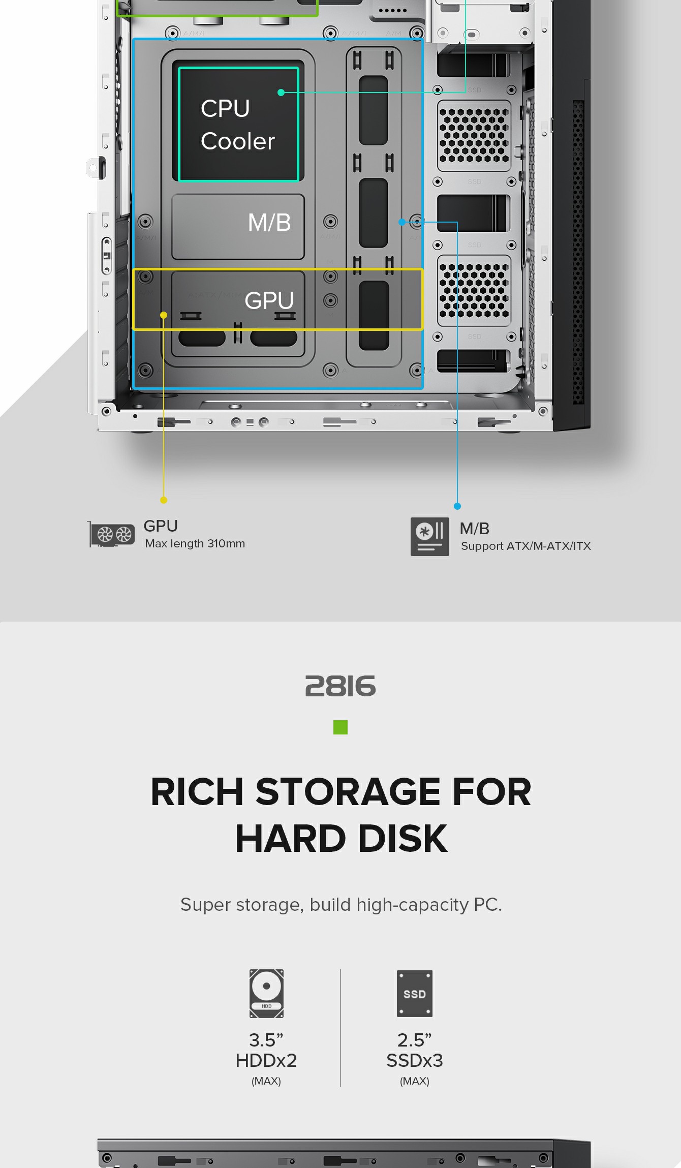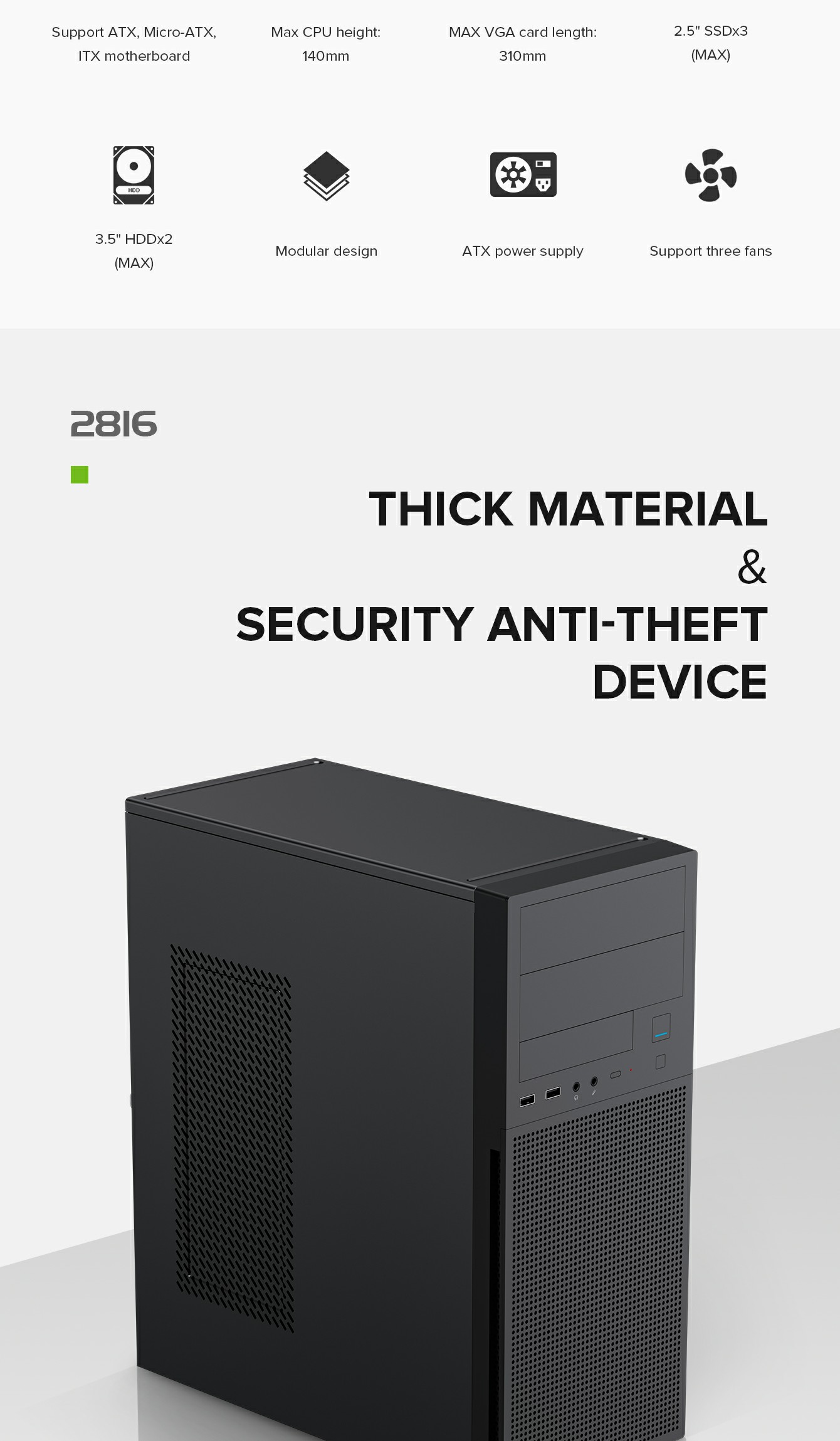 2816 is One of the Smallest ATX Computer cases, with an upgraded featured Chassis Design, 2x12cm fan potion to provide multi-cooling options for the PC system