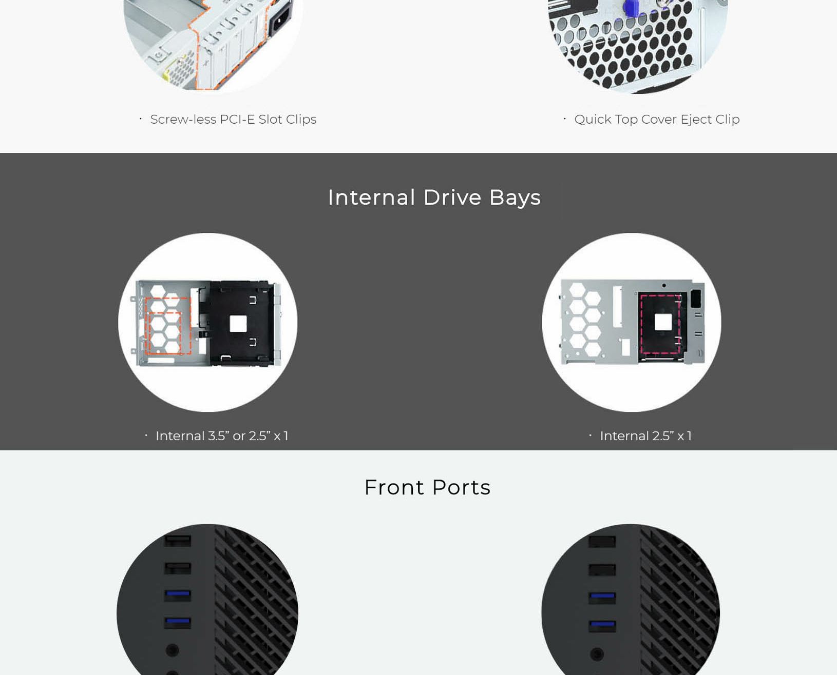 | Internal Drive Bays | 3.5“ or 2.5“ HDDx 1, 2.5“HDD x 1 |