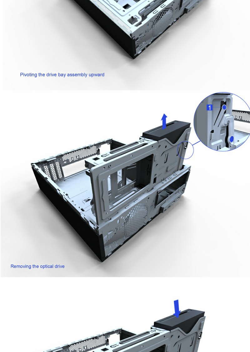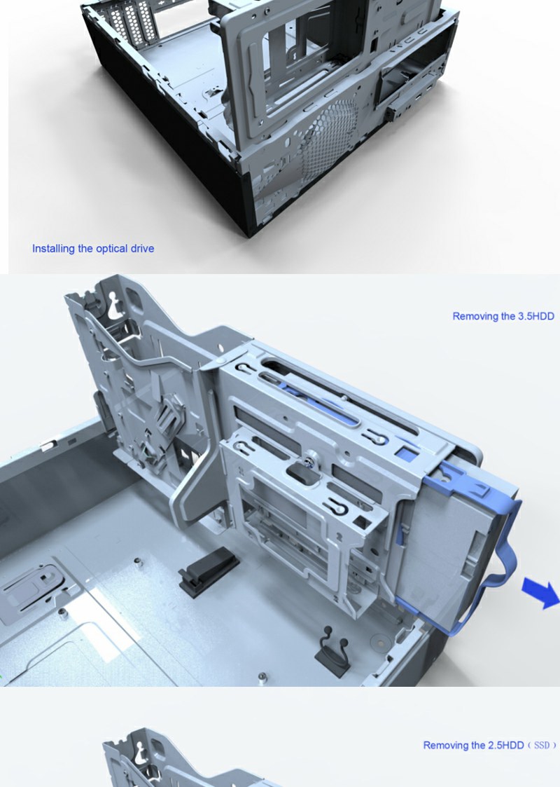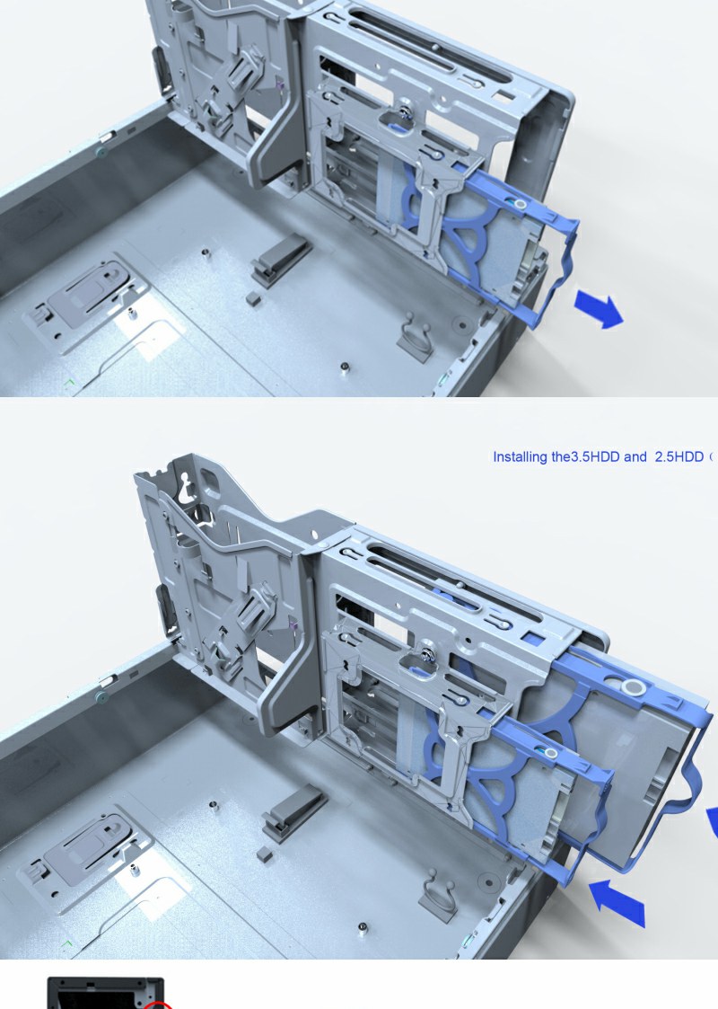 ODD/HDD housing system for fast installation with minimal effort.