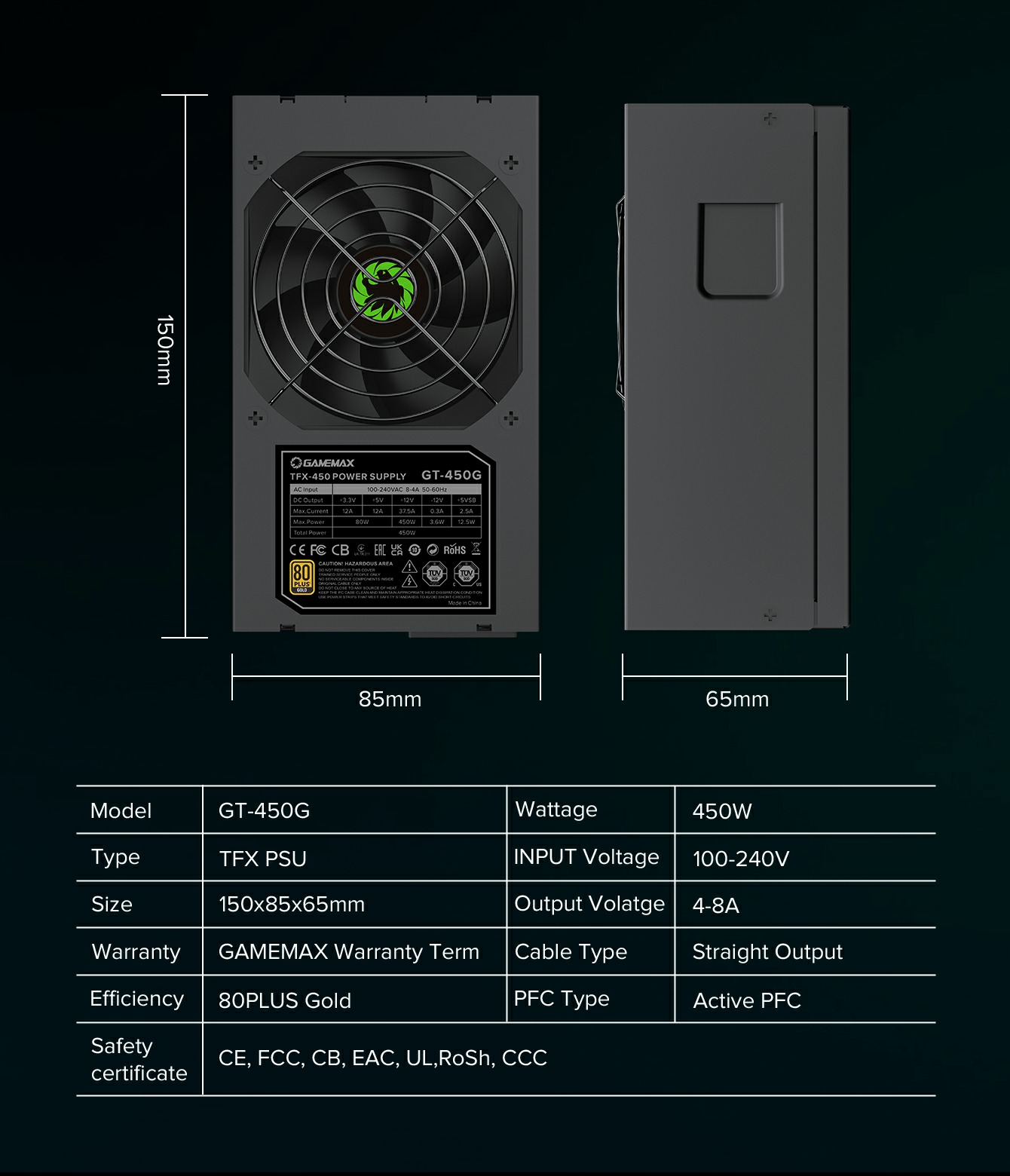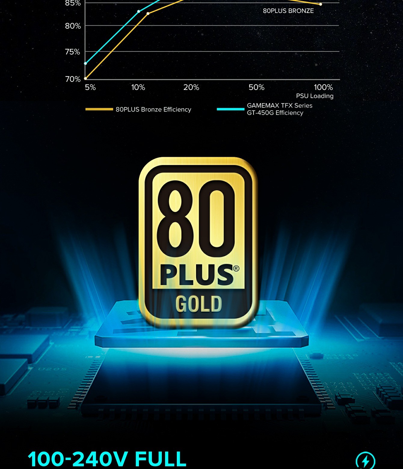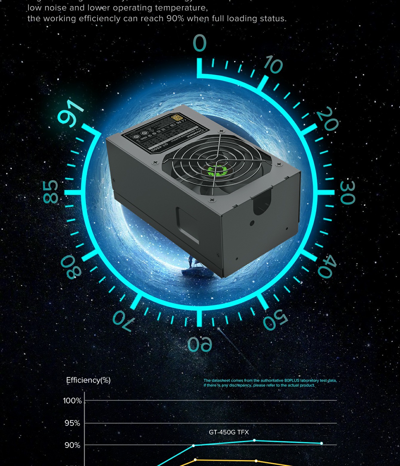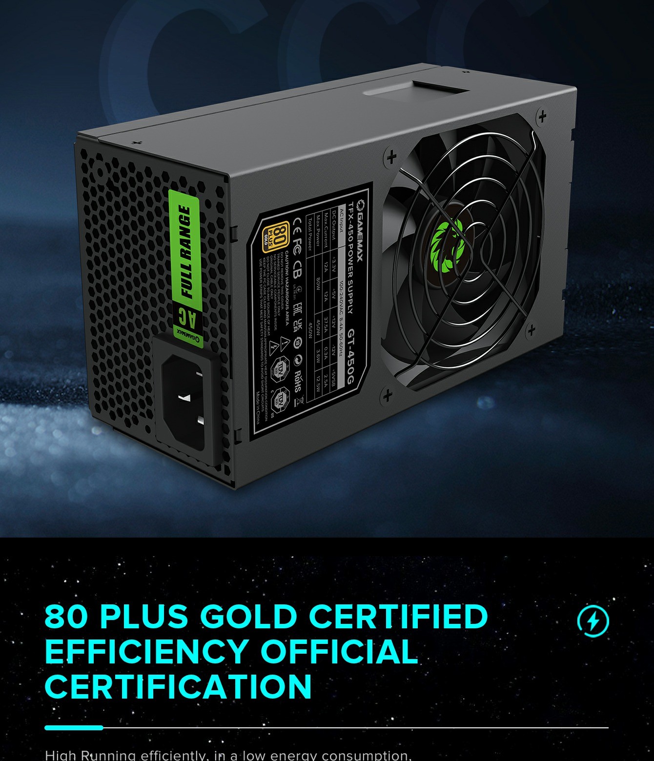 TFX 450 Gold, is certified for 80 PLUS Gold, this active PFC unit runs at a max of 90% efficiency,
