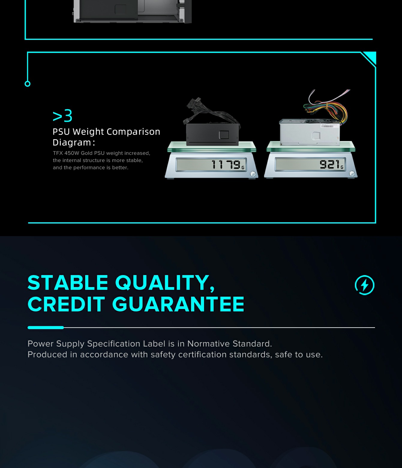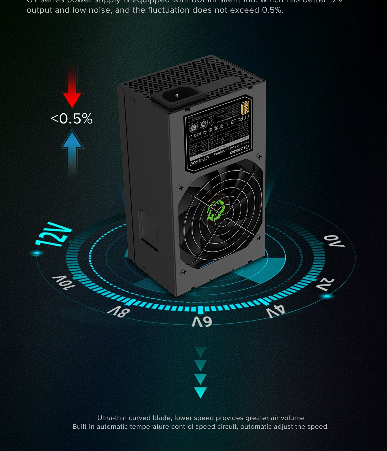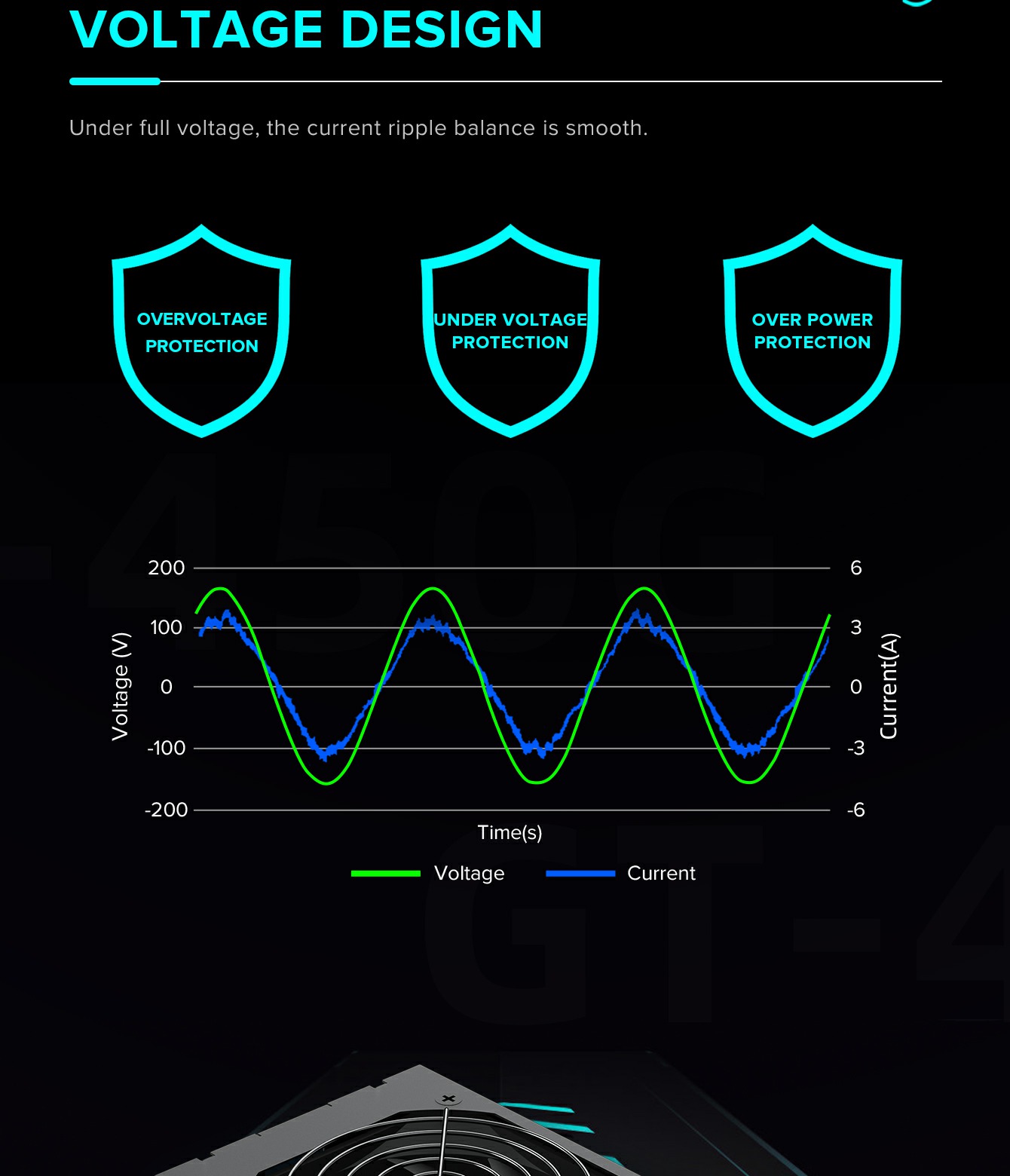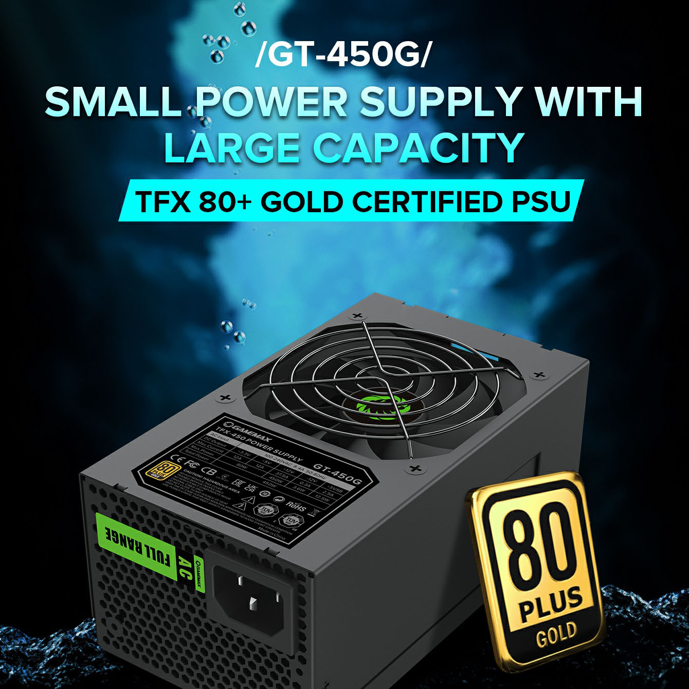 TFX 450 Gold, is certified for 80 PLUS Gold, this active PFC unit runs at a max of 90% efficiency,