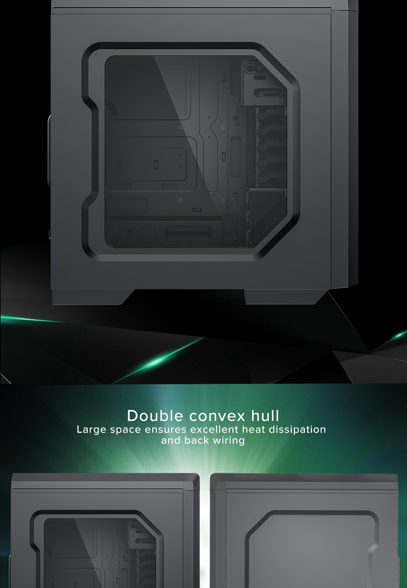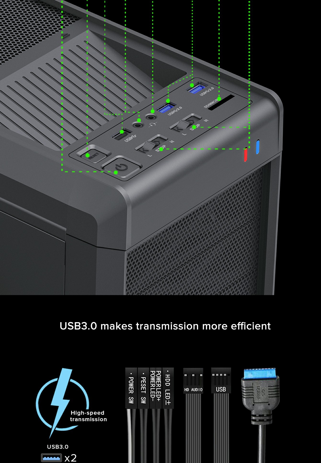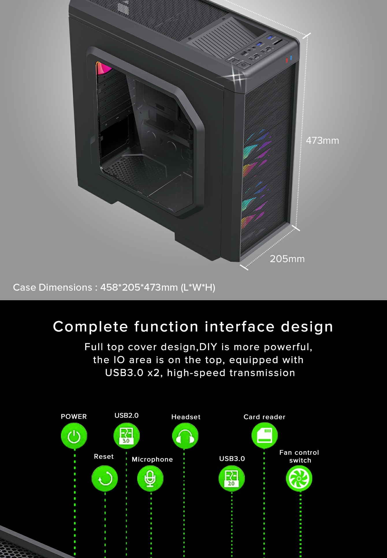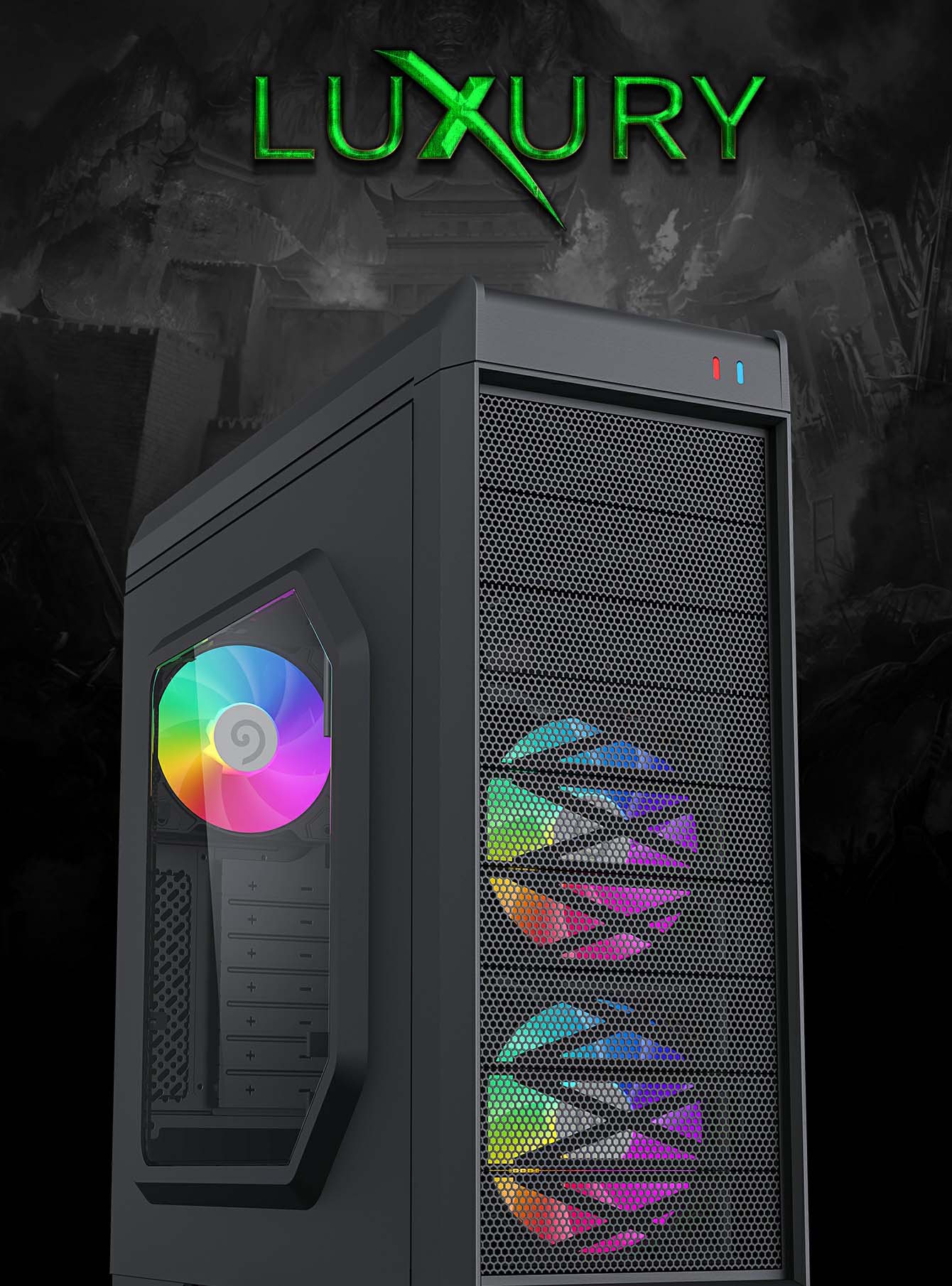Midi tower ATX workstation, Gaming case, Multi-HDD/SDD positions, front metal mesh for improved air-flow, make system stability during overclocking working.