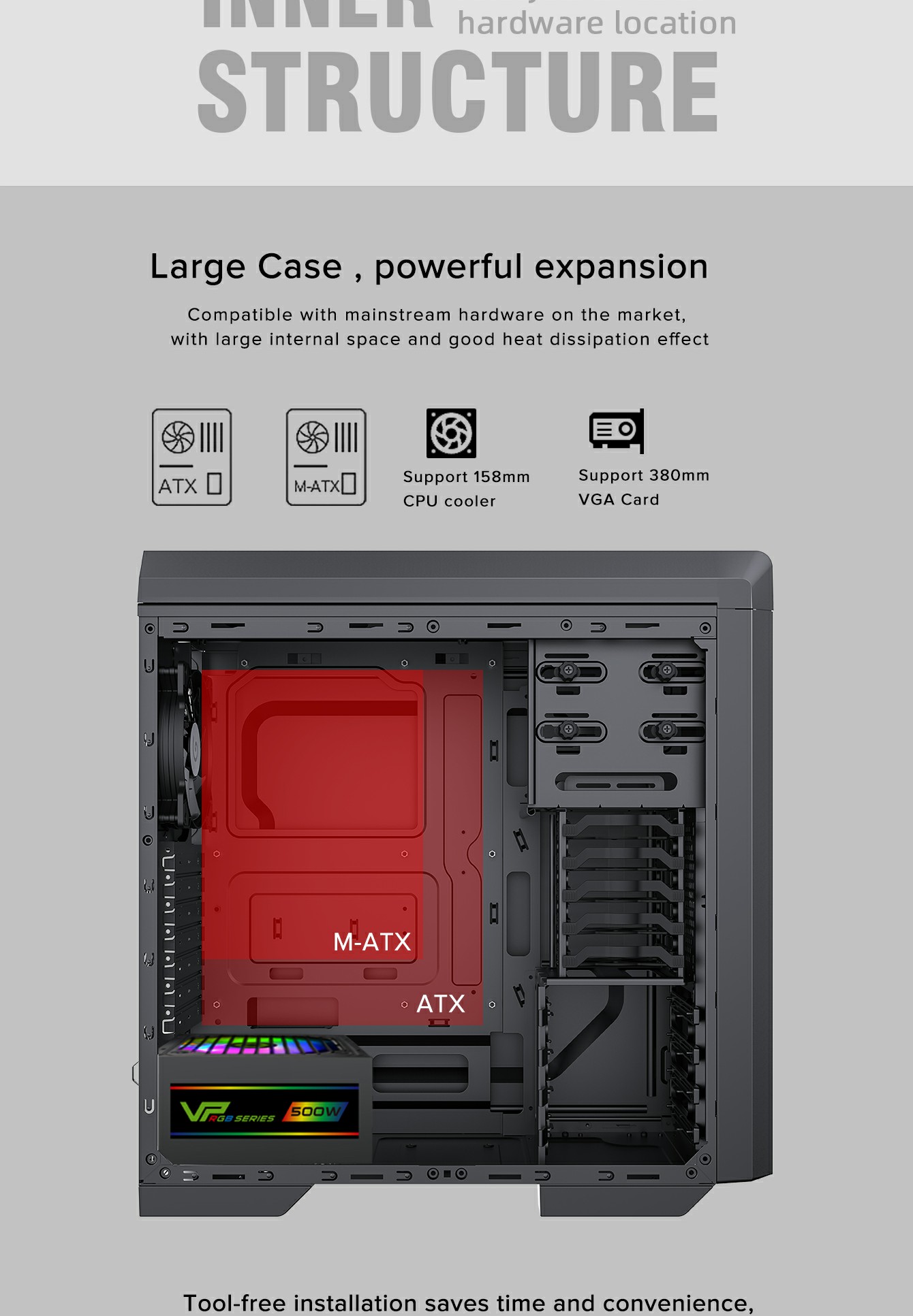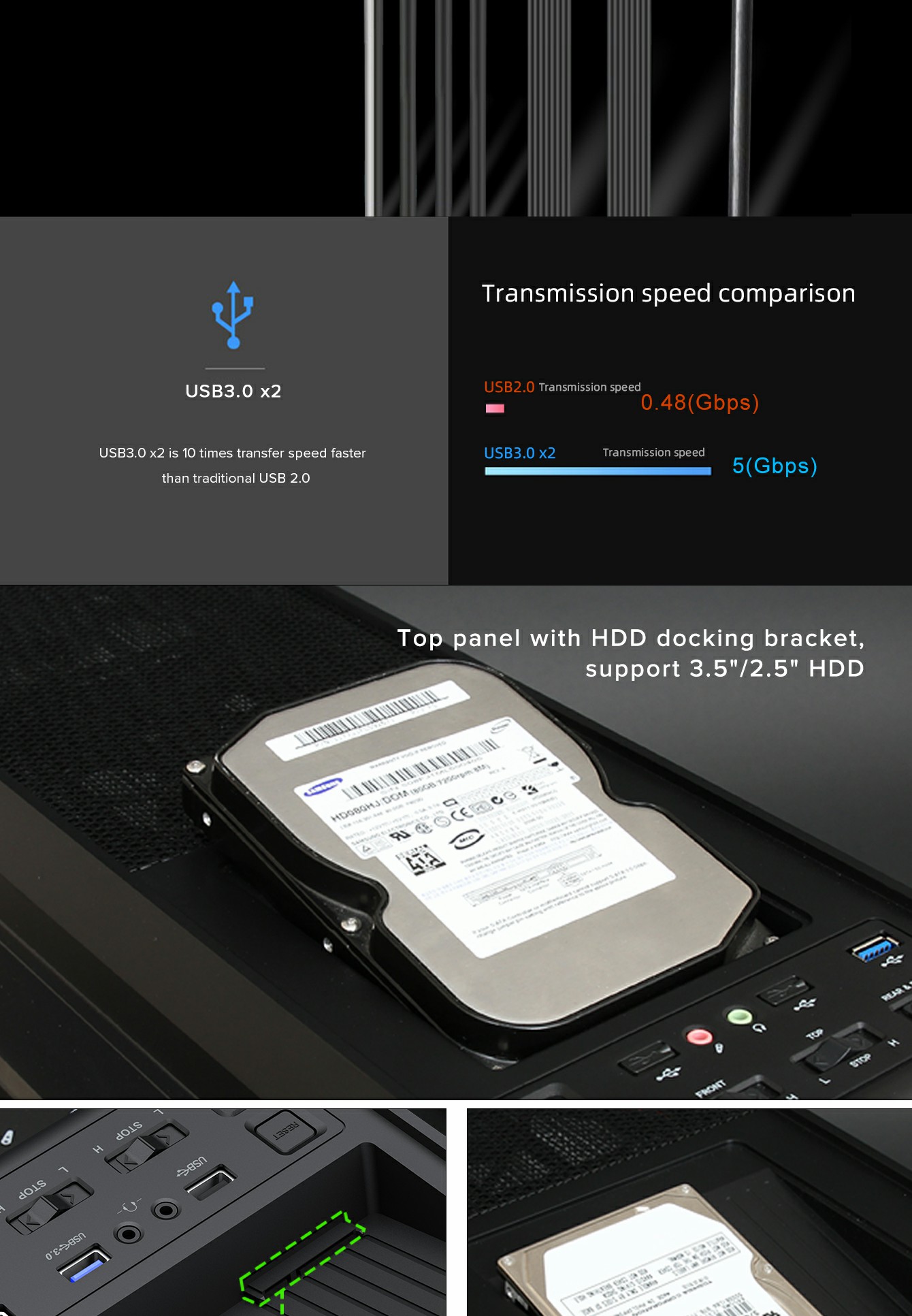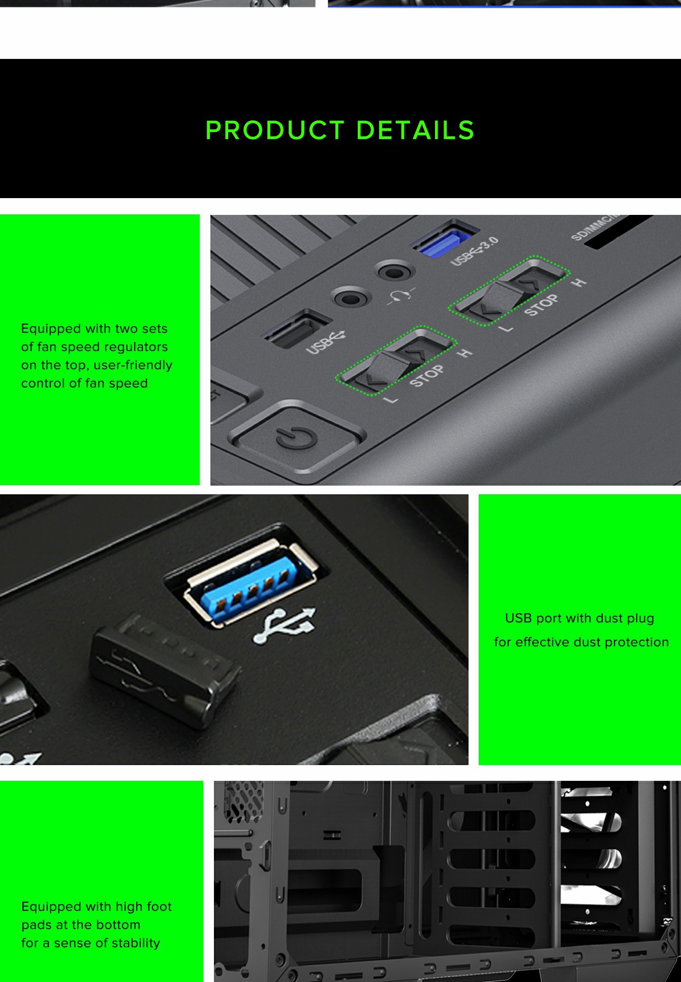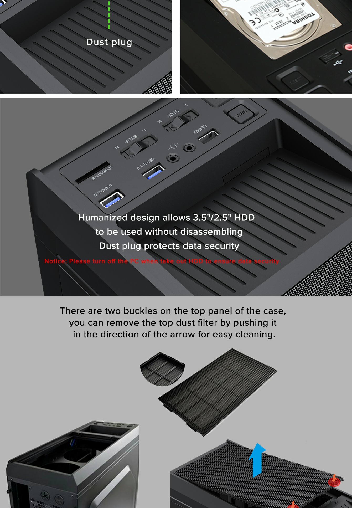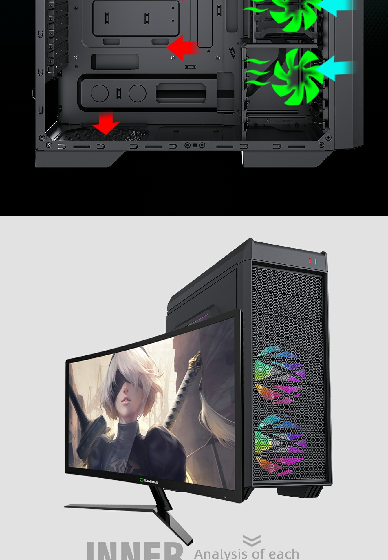 Midi tower ATX workstation, Gaming case, Multi-HDD/SDD positions, front metal mesh for improved air-flow, make system stability during overclocking working.