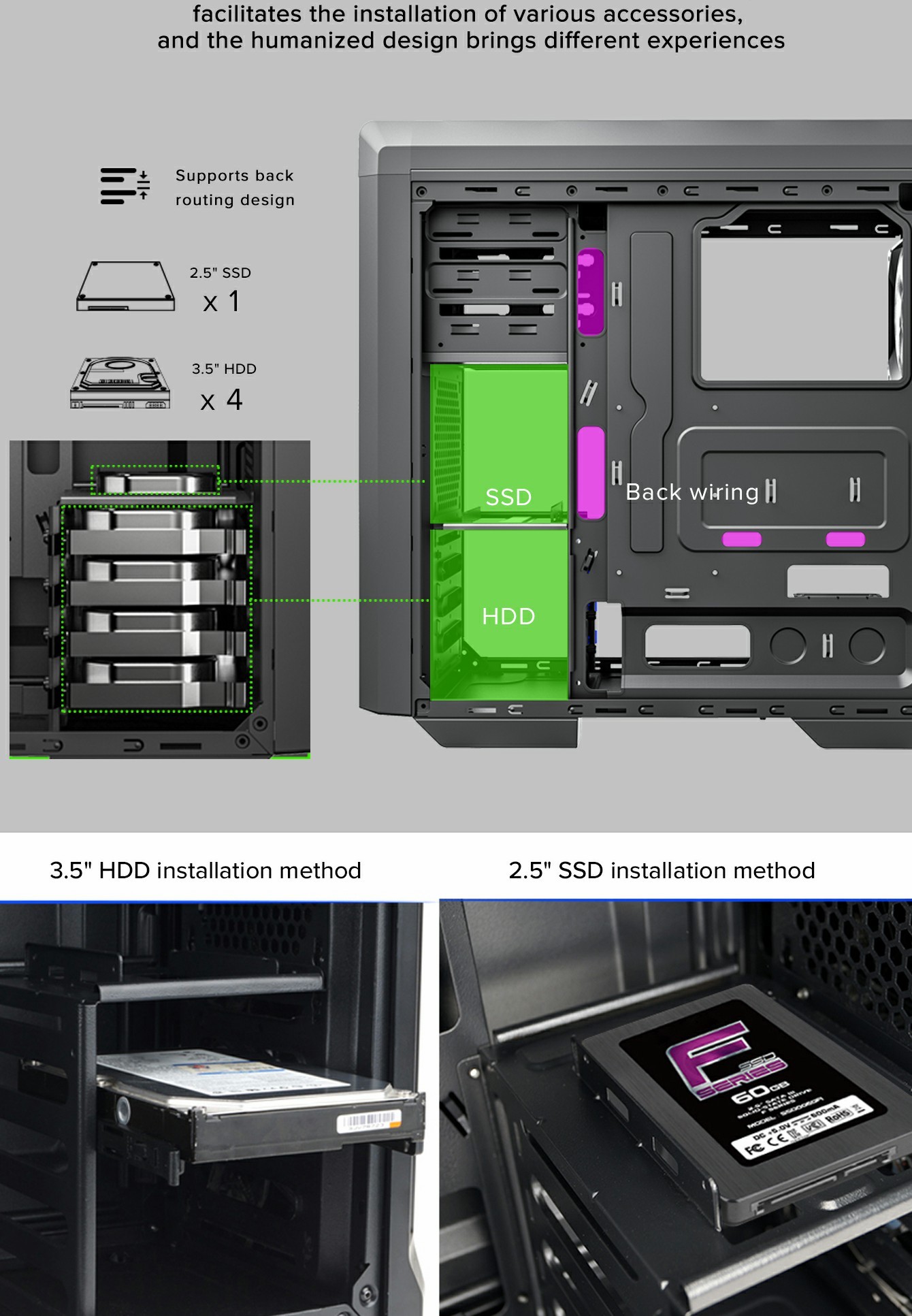Tool-free - 4 tool-free HDD brackets and 5x2.5 brackets