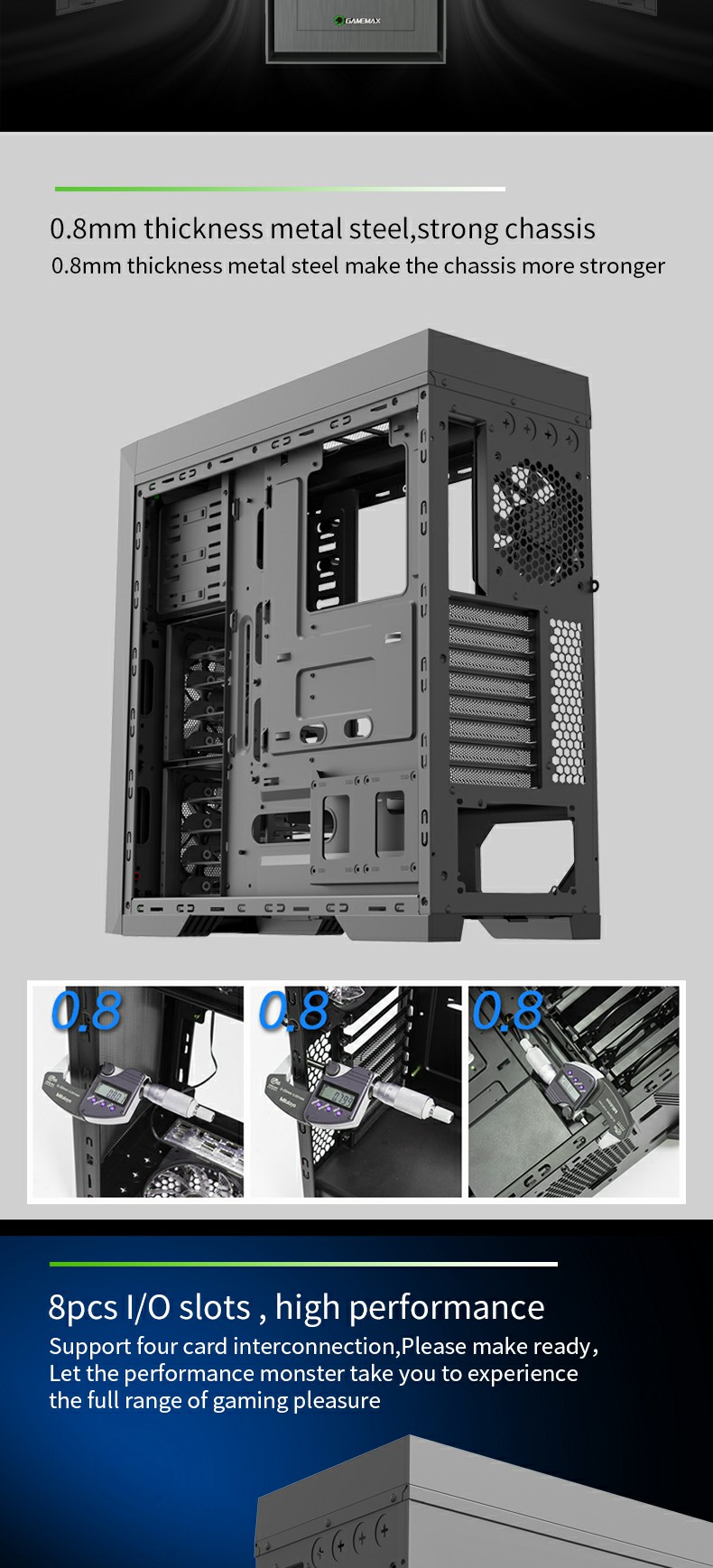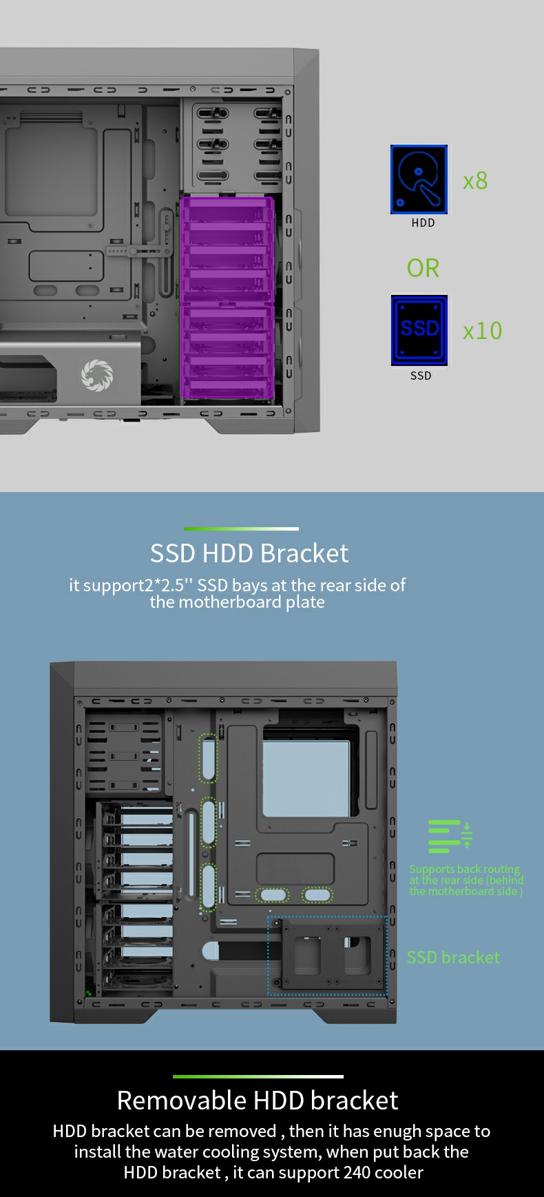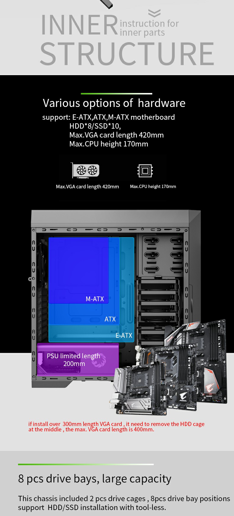 Rolled edges ensure safety and with total 8+2 sets of tool-free HDDs easy to assemble, an additional 2x SSD on the back of the motherboard. Supports 430mm VGA card and 165mm height of CPU cooler.