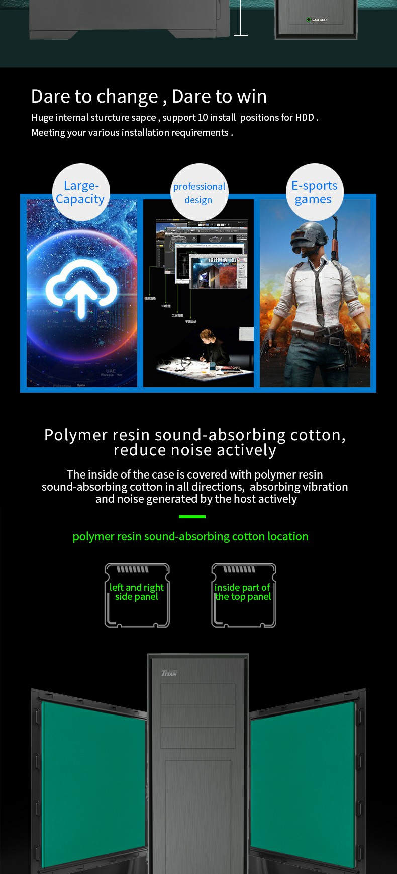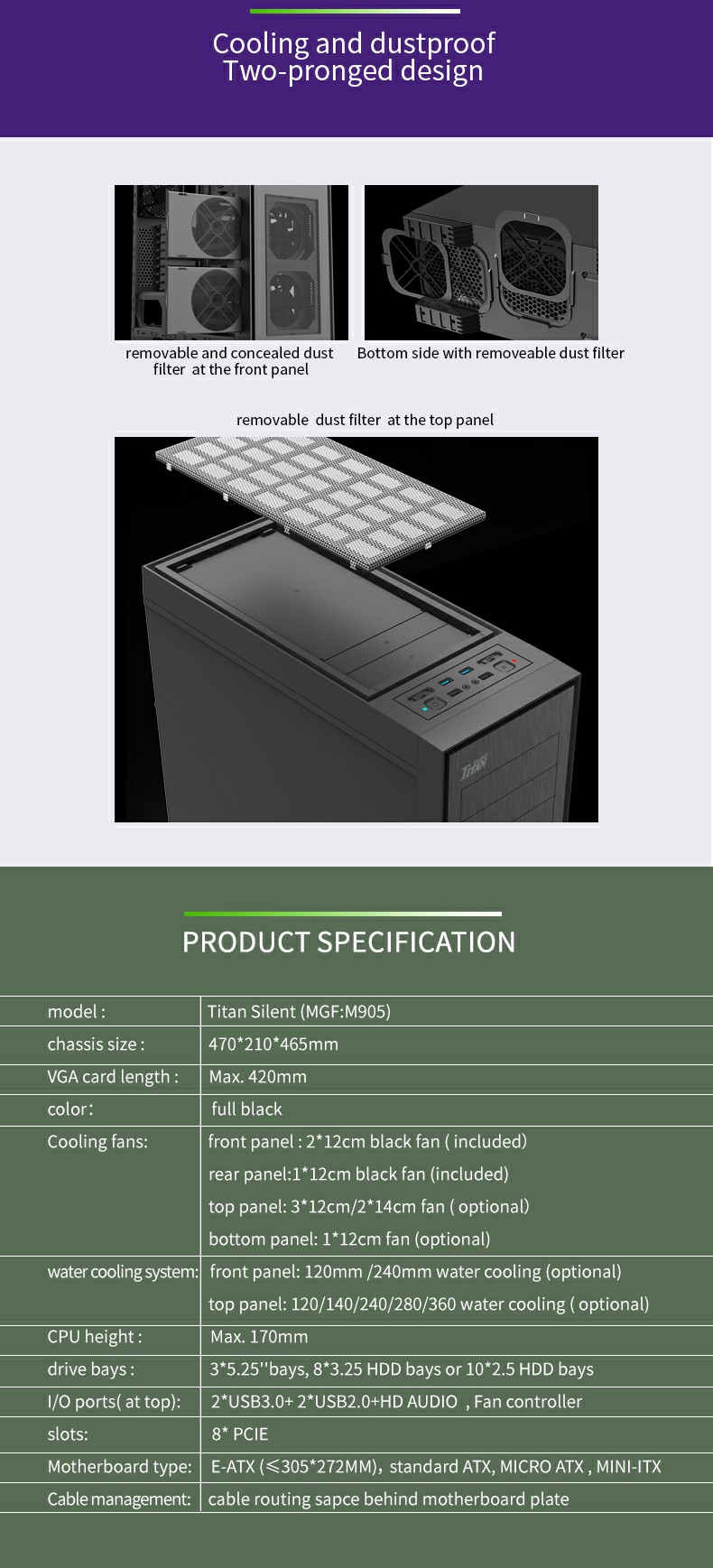 The Titan Silent M905S also supports E-ATX(305*272mm) motherboard board as a PC server tower, and important that the Master case can install a total of 10 x HDDs to make your PC in Raid 3 or Raid 5 Drives