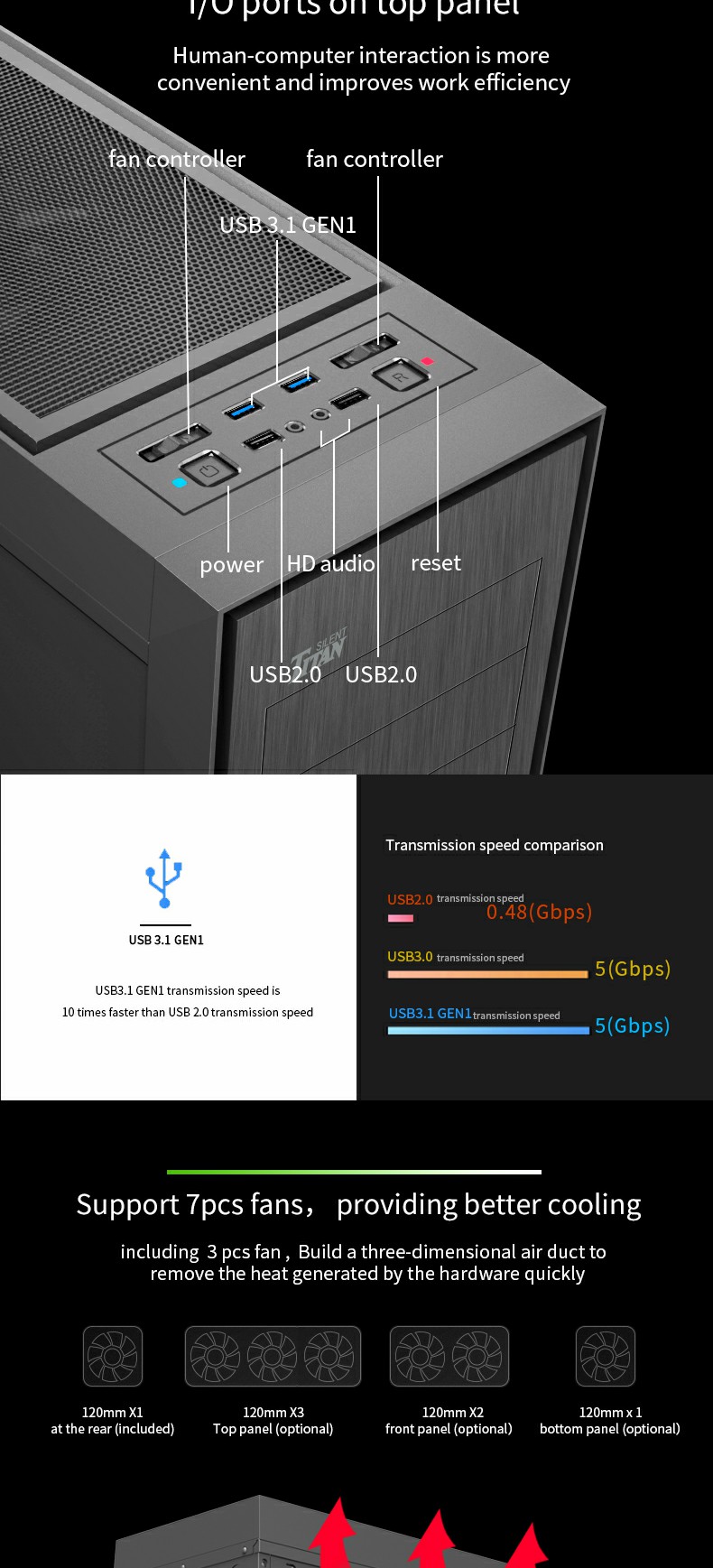 9905x Black full tower Silent Case with a powerful cooling system, and 10xHDDs fix position, along with 3x12cm silent fans pre-installed which speed of the fan can be controlled via the top button. The fan speed can be freely controlled, and it is with HD Audio, 2 x USB 2.0 & 2 x USB 3.0 located on the top giving the user easy access