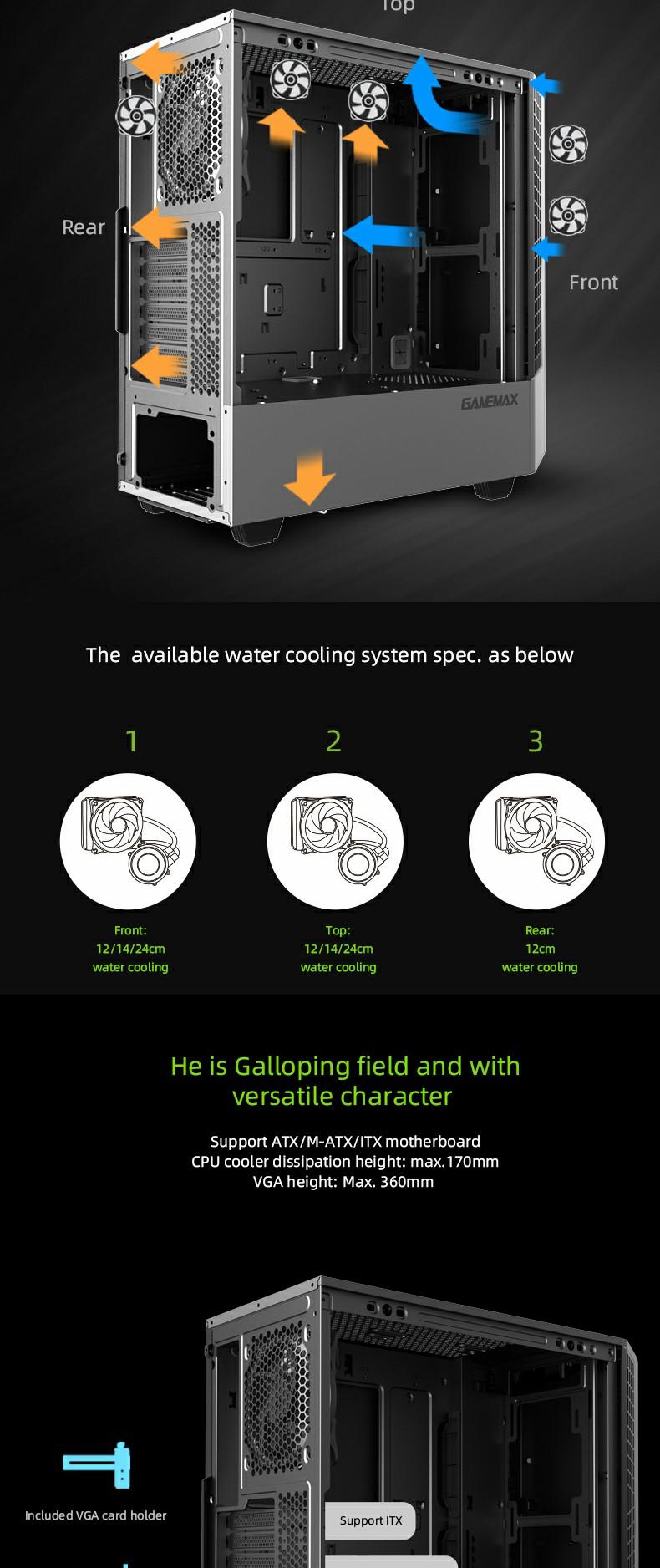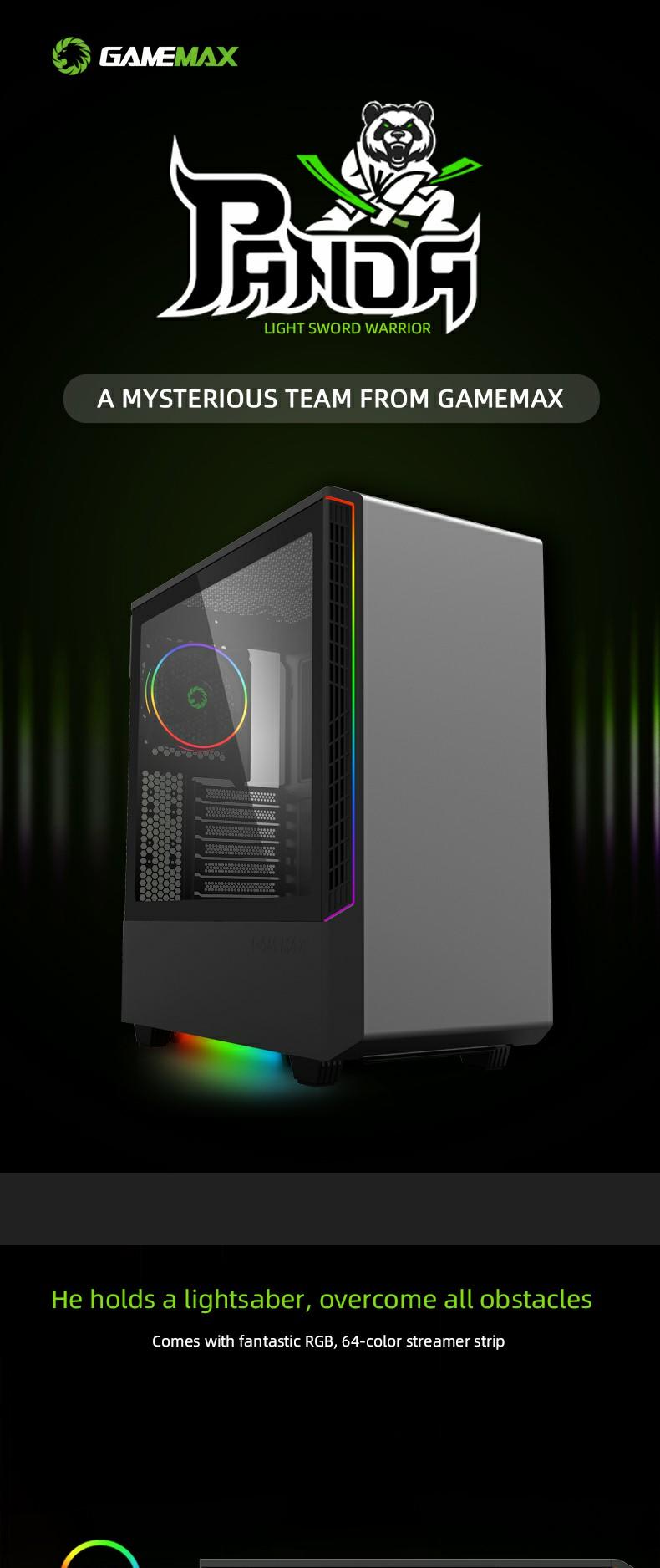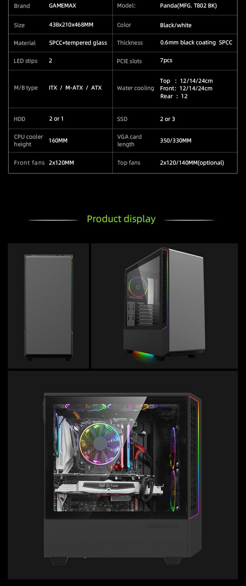 Includes 3x ARGB LED strips and 1xPCS ARGB 12cm Rainbow fan pre-installed to enhance the aesthetics of your build as seen through the 8002's stunning tempered glass panel.also Panda model has optional vertical graphic card holder to provide flexible installed position.