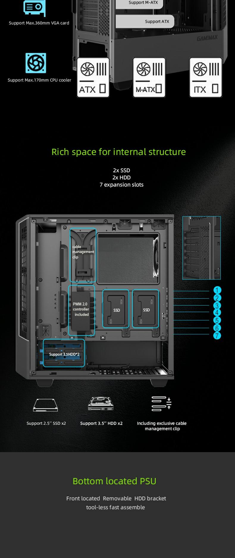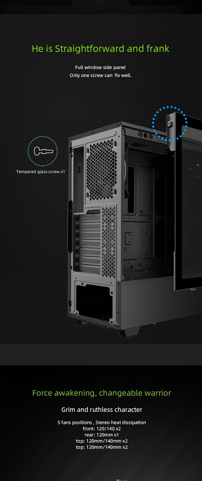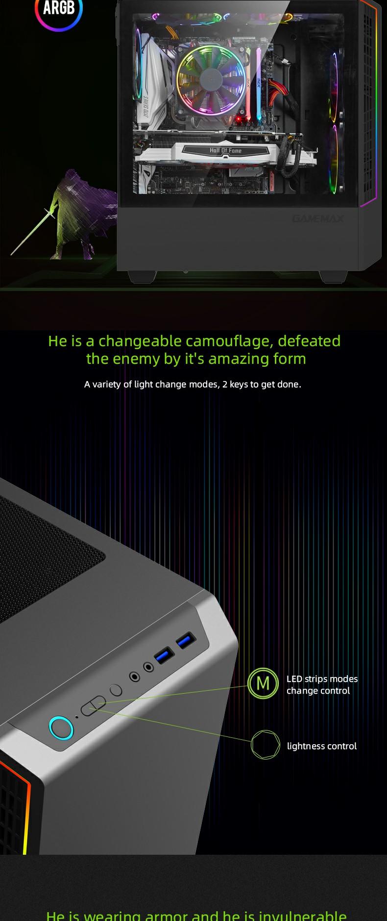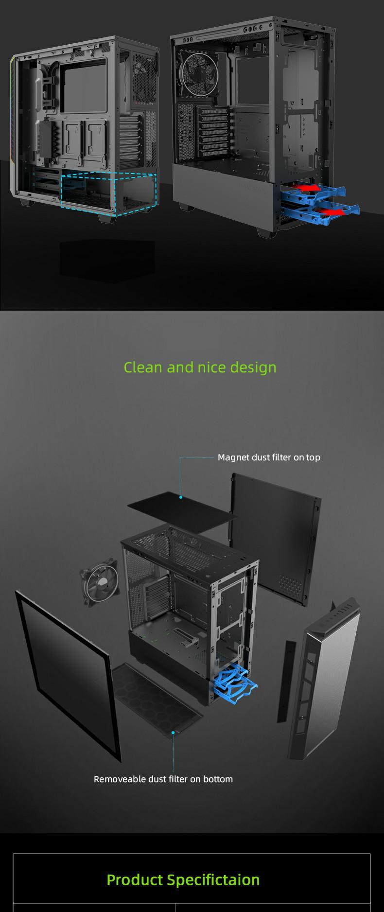 The 8002 compact mid-tower case features a unique one-pcs screw easy open glass side window, and along with top and bottom ARGB strips.