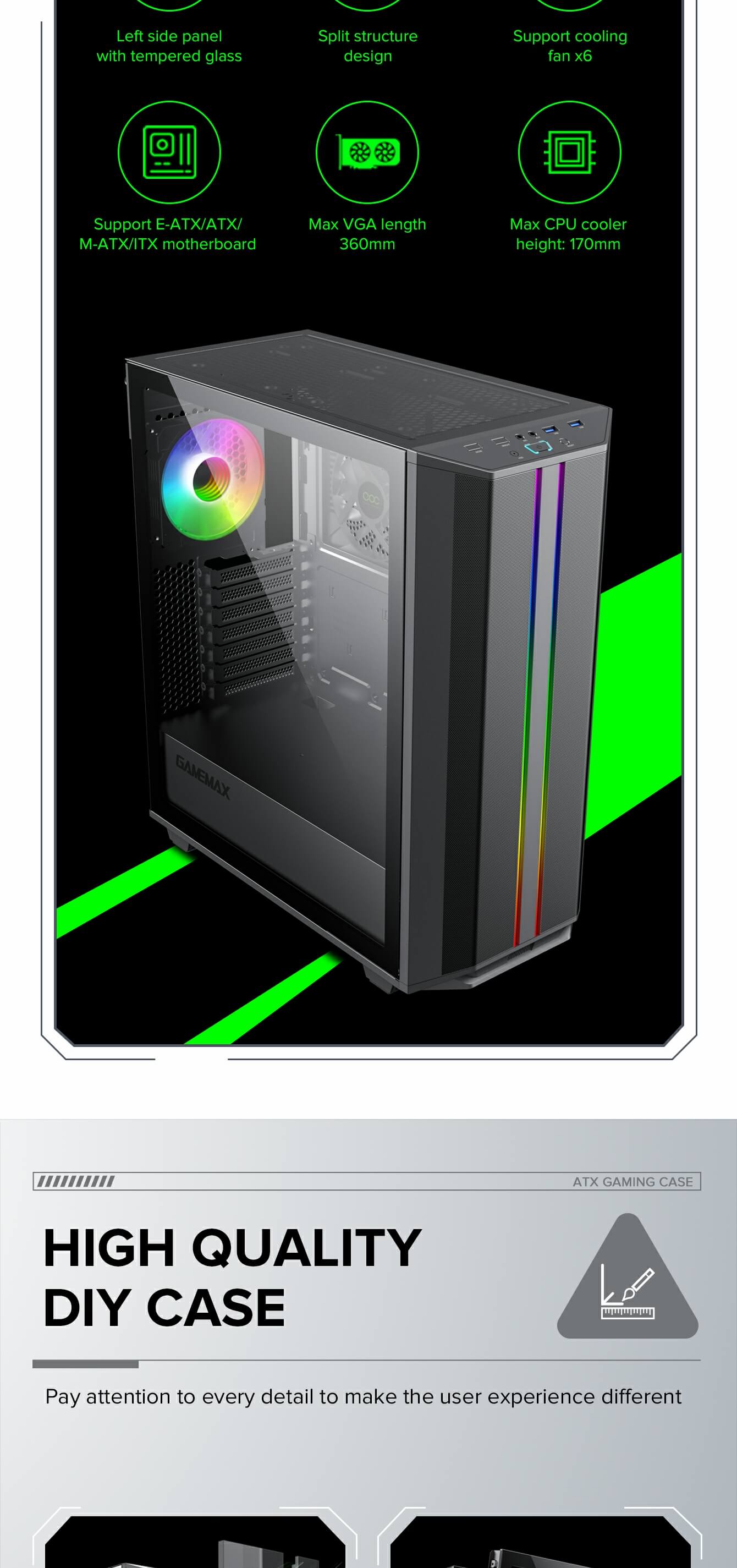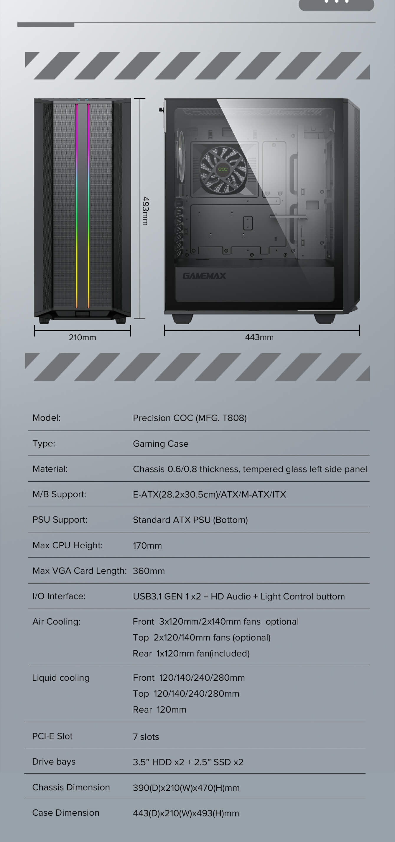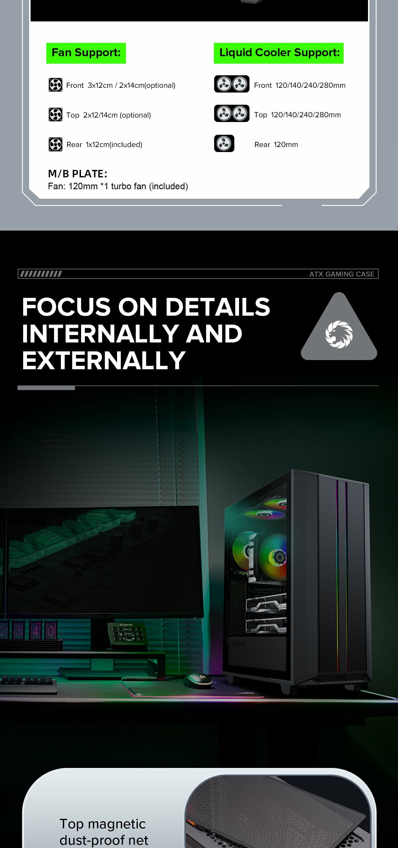 8008 mid-tower gaming chassis, excellent performance,The upgraded detachable top plate solves the common problems of ordinary chassis on the market, satisfies the rapid installation and maintenance of your computer hardware, and improves the ease of installation of hardware accessories It is more convenient to install the radiator and fan.