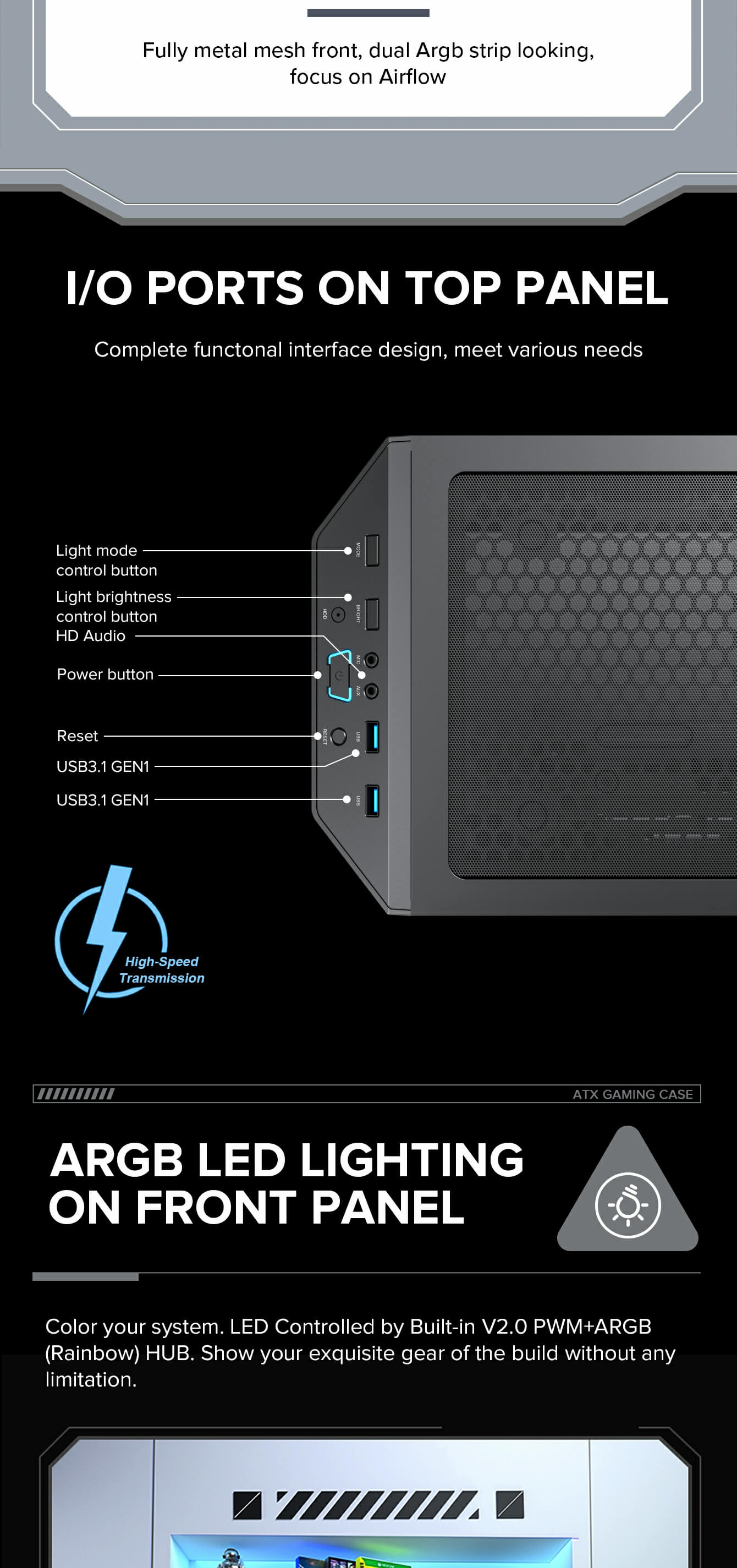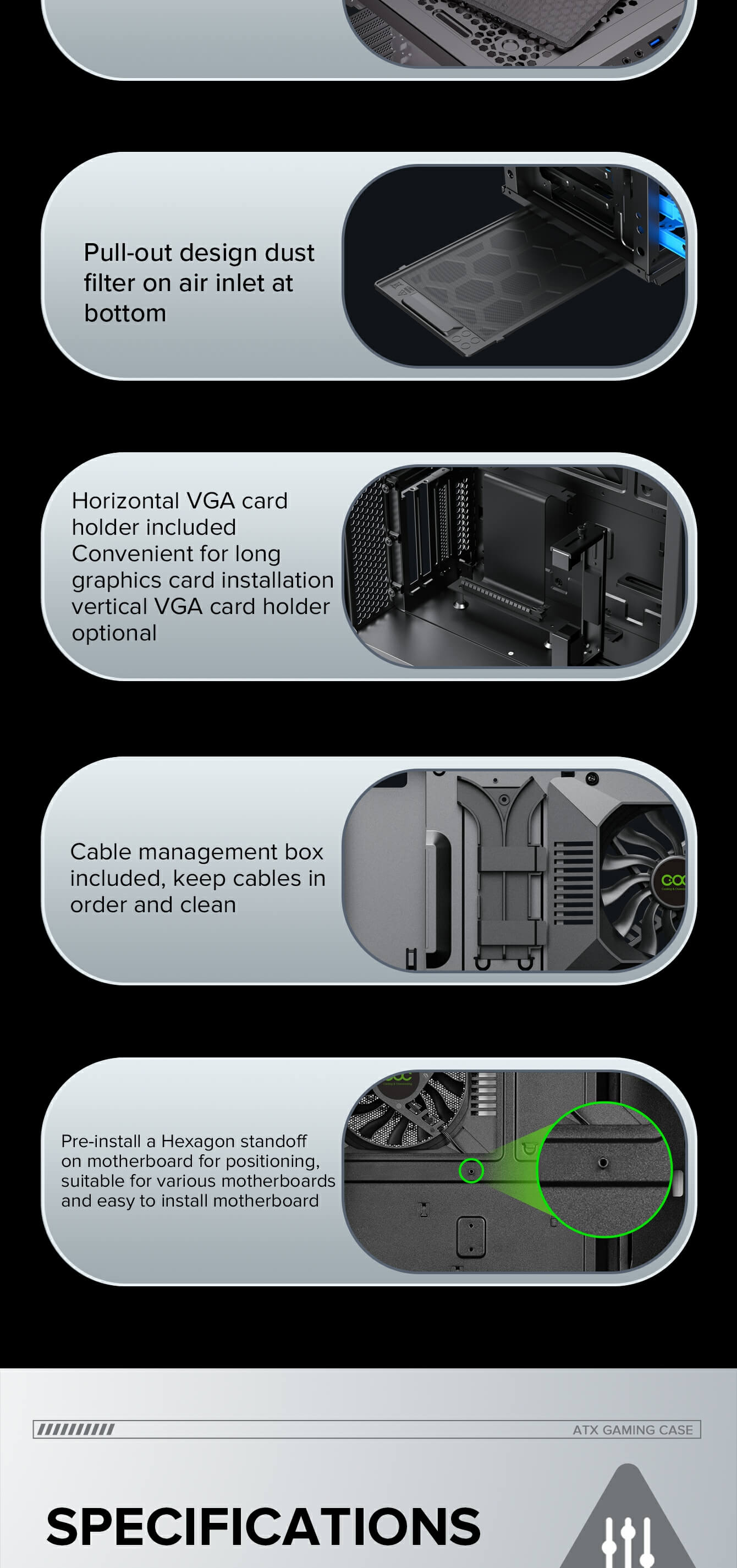 The all-metal mesh front panel is designed in one piece, and the dust-proof hole design is fully covered, focusing on the cooling airflow. Large space inside the chassis, supporting high-end graphics cards and large radiators