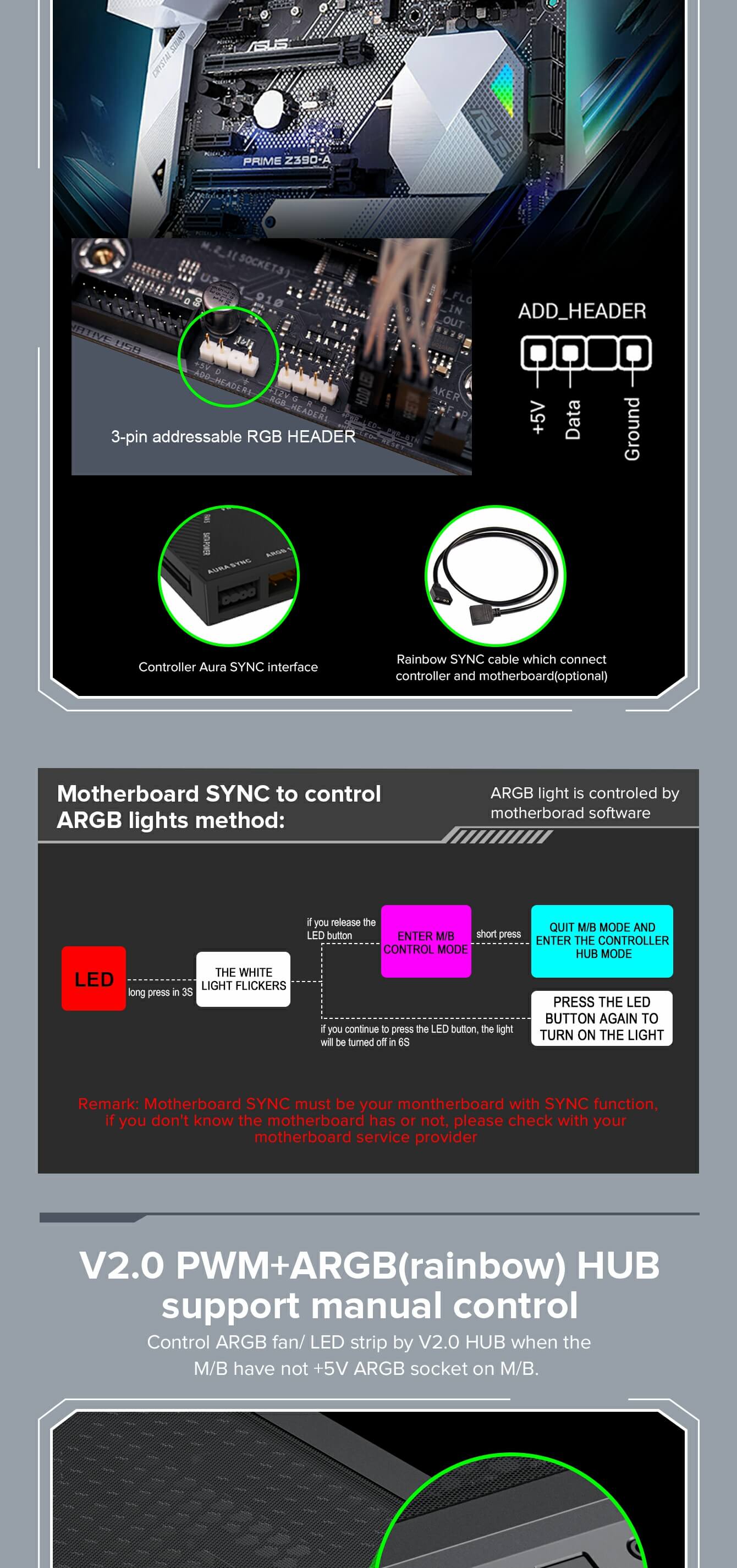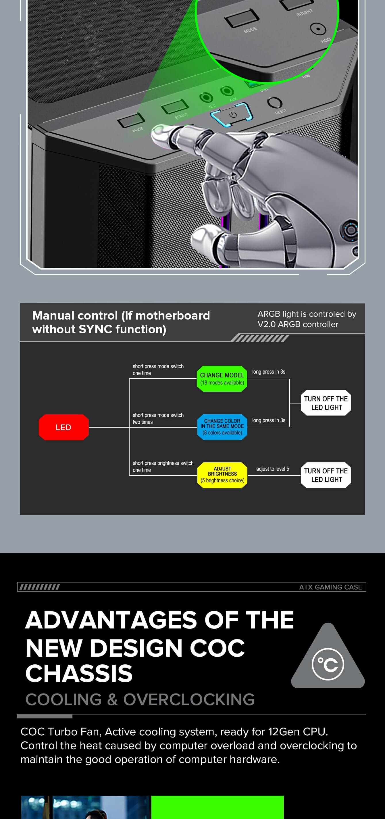 Dual ARGB light bar appearance, with ARGB HUB or motherboard ARUA synchronous interface control, provides a variety of colors and modes to personalize the appearance