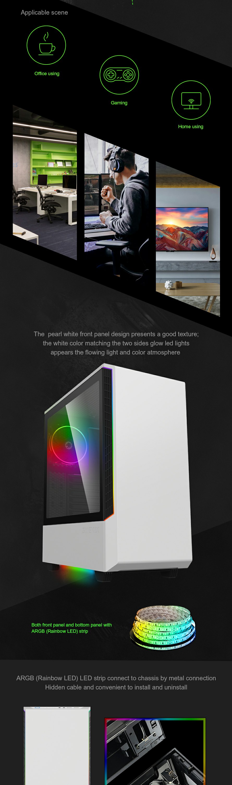 The 8002 compact mid-tower case features a unique one-pcs screw easy open glass side window, and along with top and bottom ARGB strips.