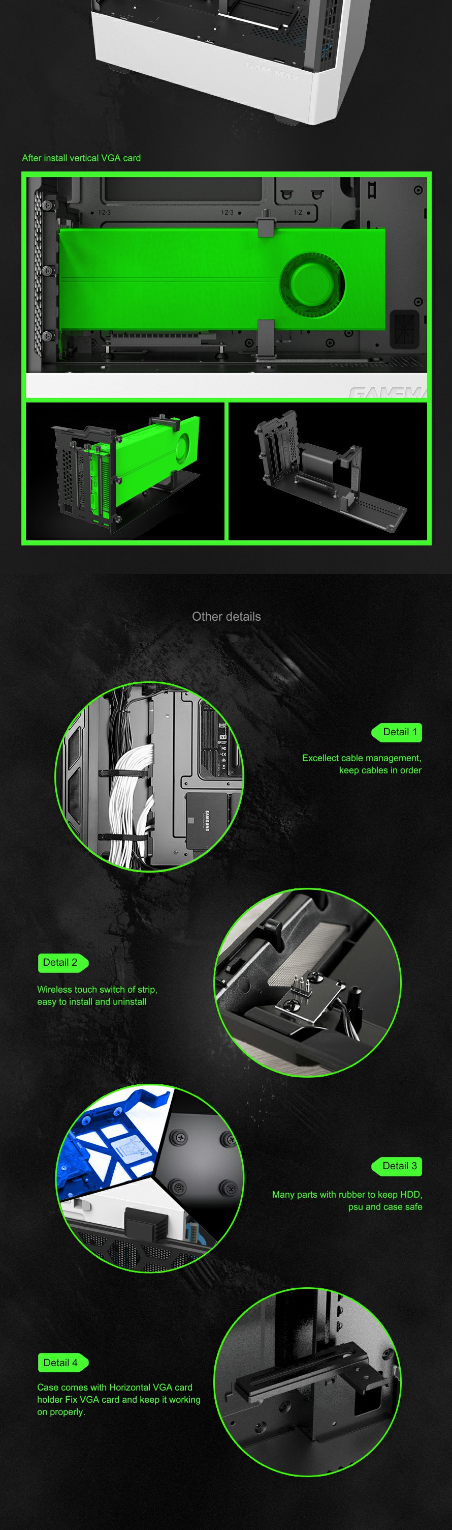 Includes 3x ARGB LED strips and 1xPCS ARGB 12cm Rainbow fan pre-installed to enhance the aesthetics of your build as seen through the 8002's stunning tempered glass panel.also Panda model has optional vertical graphic card holder to provide flexible installed position.