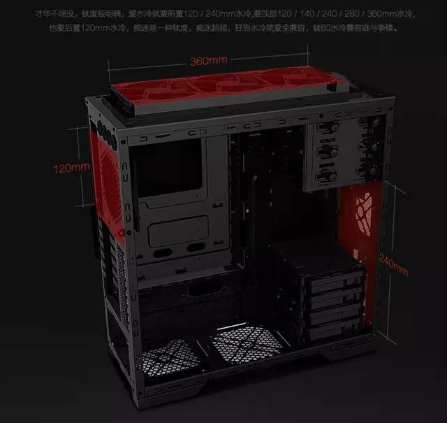 我们先来看一看钛60机箱的五金结构,这款机箱的设计特色是水冷与模组,而且基于全塔的定位使得钛60机箱拥有了500mm长*210mm宽*530mm高的巨无霸身材,拥有足够的空间施展水冷和模组设计。在对水冷散热的支持能力上,由于采用了4个3.5/2.5英寸模组硬盘位,灵活的硬盘安装设计使得钛60机箱可以在前置面板处安装1个240mm水冷排或2个120mm水冷排,而在顶盖处则可以安装3个120mm/2个140mm/1个280mm/1个360mm多种规格的水冷排。在当前水冷散热日益流行的趋势下,钛60机箱可以说在今后相当长一段时期内都可以满足玩家们组建高端水冷散热系统、打造个性化水冷PC的需求。