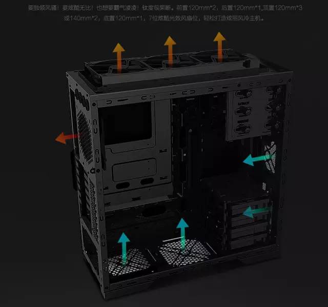 当然,除了强大的水冷散热支持外,钛60机箱在风冷散热上也十分给力。机箱支持2个12cm前置面板风扇、3个12cm或2个14cm顶盖风扇、1个后置12cm风扇和1个12cm底部风扇,最多可以同时安装7个机箱内部风扇,组建出覆盖全部硬件的高效散热风道,结合2组风扇调速器,实现效率与静音的平衡