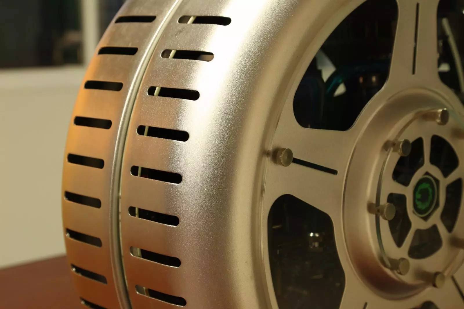 “轮身”采用现代汽车工业美学,设计了五辐条式轮辋和按圆形分布的双层梯形亚克力材质的侧头板,配合8个“螺栓”,整体圆润和谐,独树一帜。