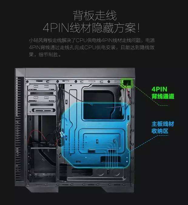 风火轮机箱虽然体积不大,但它的内部空间相当充裕,首先是主板顶部到机箱顶部的位置足够宽敞,不但方便了走线,也可以避免安装散热风扇以后与大面积的CPU塔式散热器造成冲突。