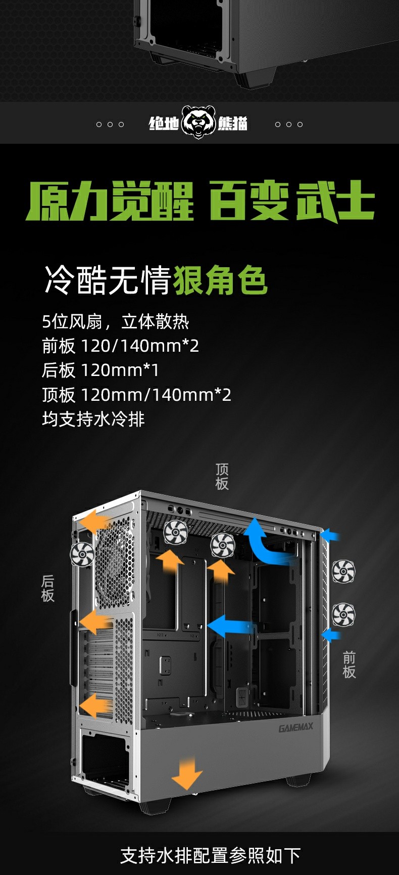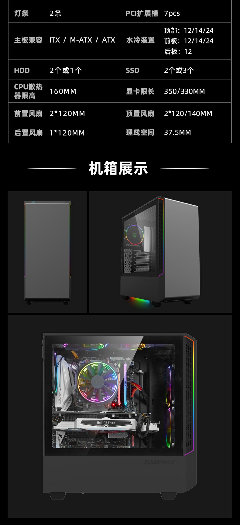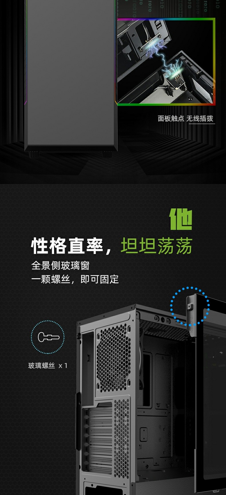 前面板ARGB灯条,凸现质感,并配置2侧进风防尘设计,使系统运行在安静高效的散热空间。