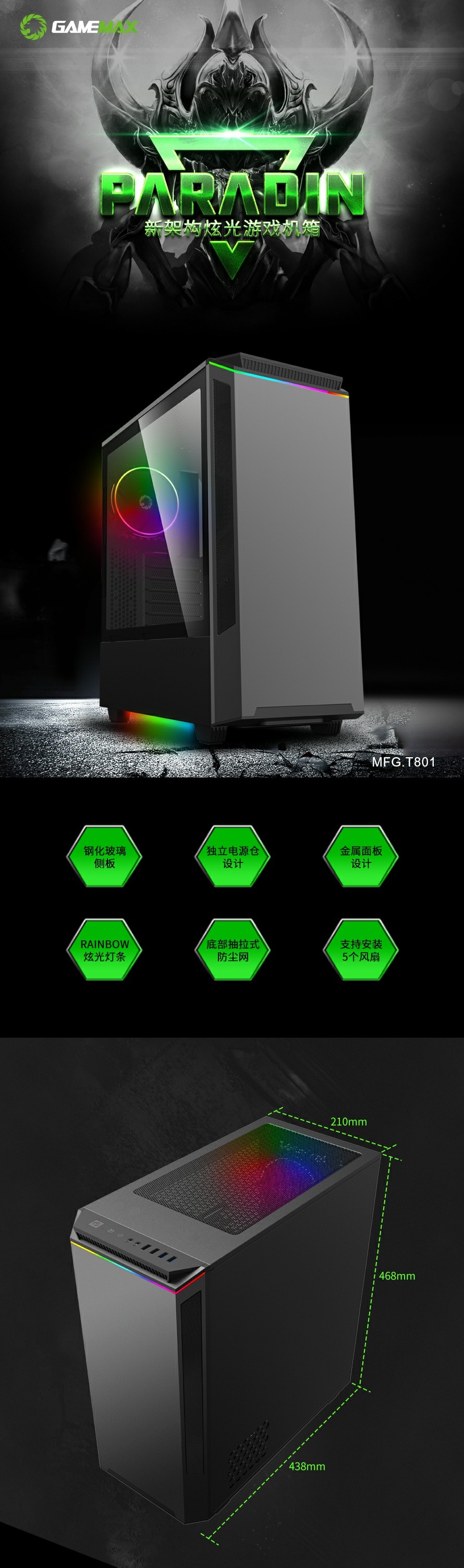 8001中塔式机箱具有独特的单颗易拧玻璃侧窗,并使用0.8mm的环保钢板。
