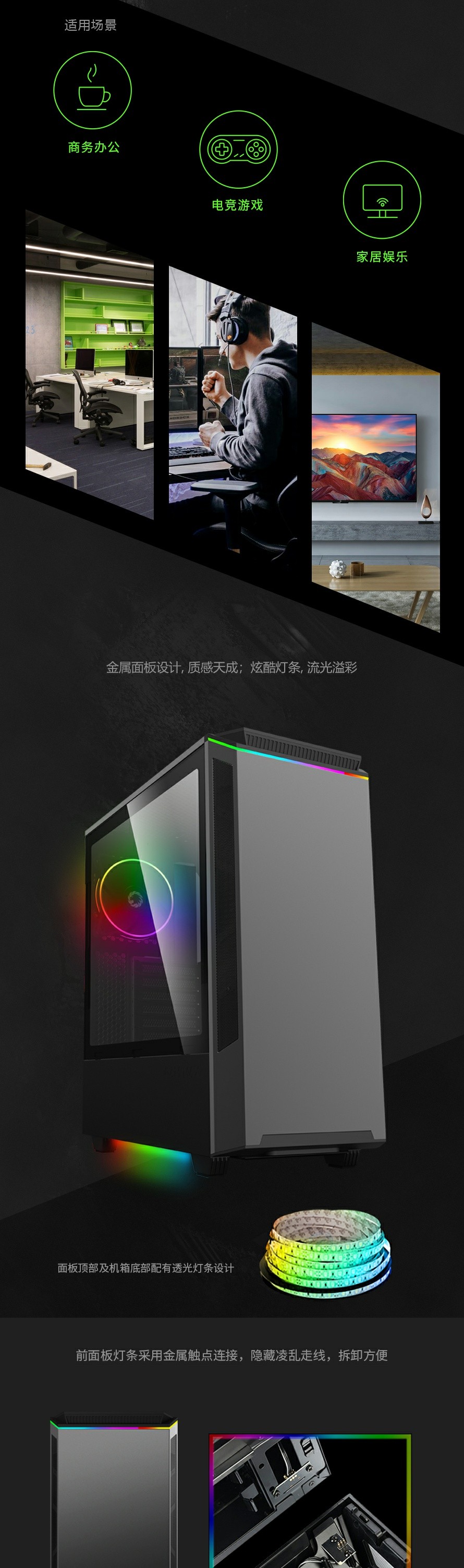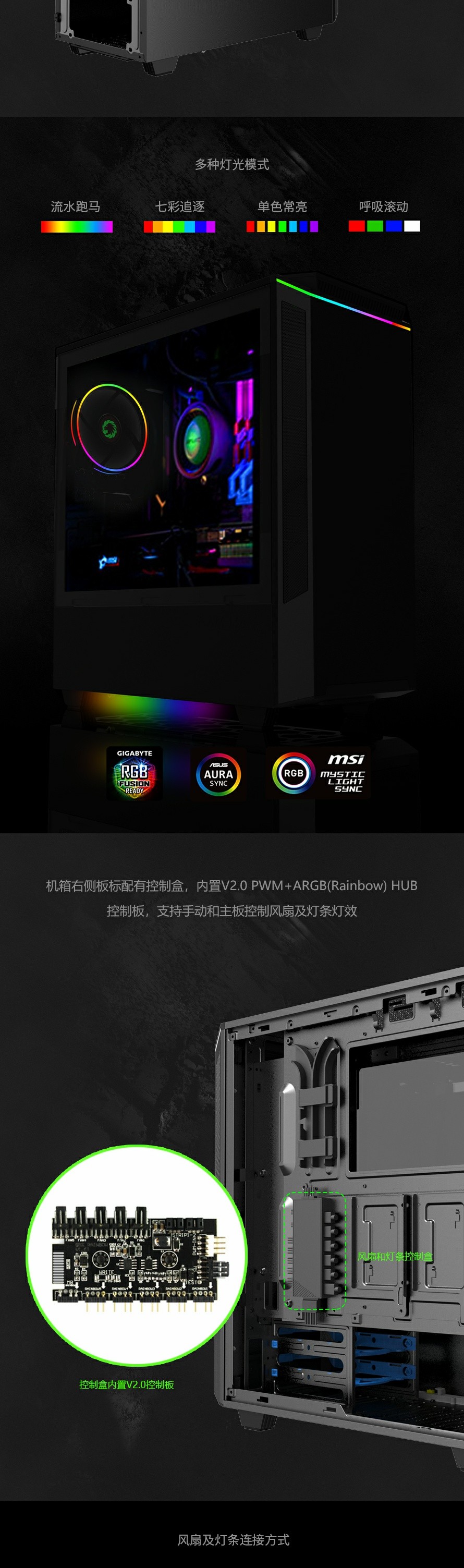 前面板上下可选有ARGB灯条,后部有12cm风扇,您可以通过ARGB HUB轻松控制ARGB照明和风扇。并支持同步主板ARGB发光功能