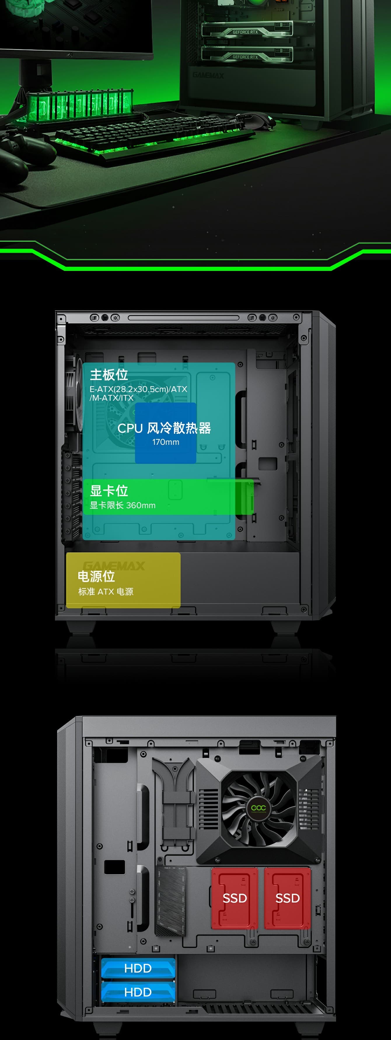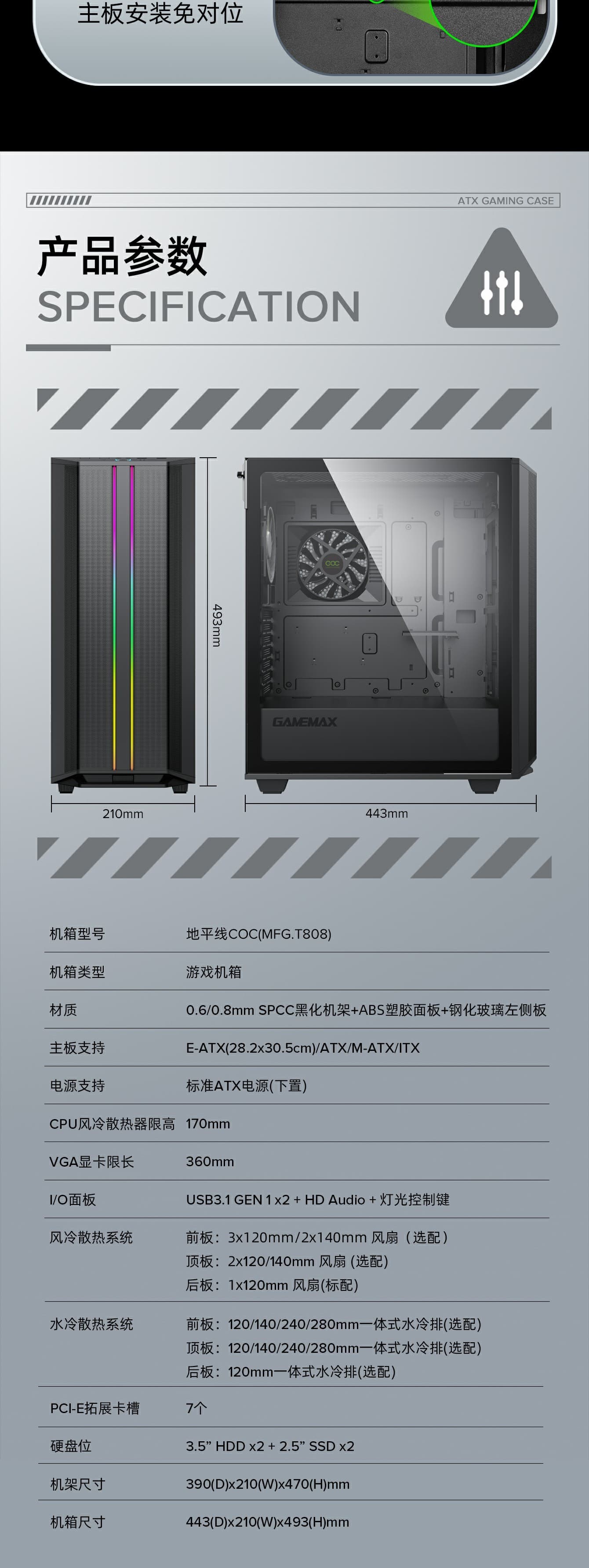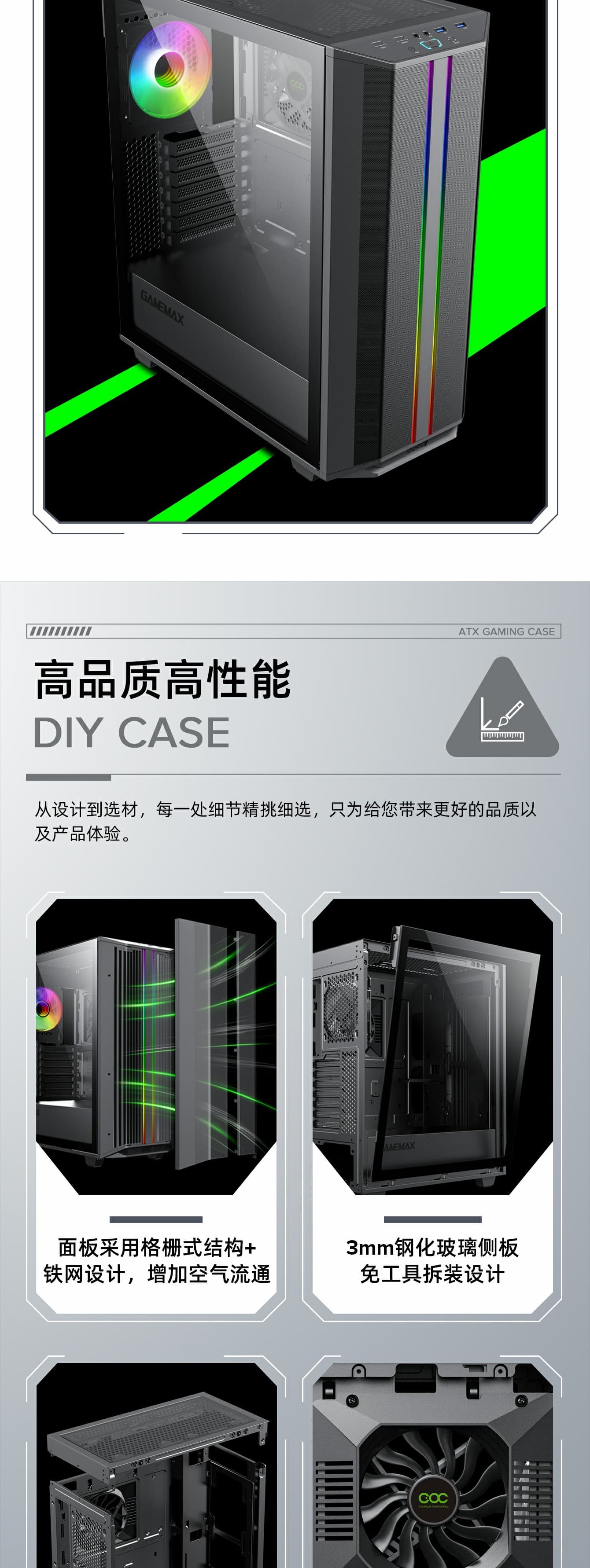 8008中塔电竞机箱,性能卓越,细节精准,电竞级体验升级后的可拆卸顶板,解决了市场上普通机箱的常见问题,满足快速装机维护你的电脑硬件,改善了对硬件配件安装易用性,安装散热器和风扇更加方便。
