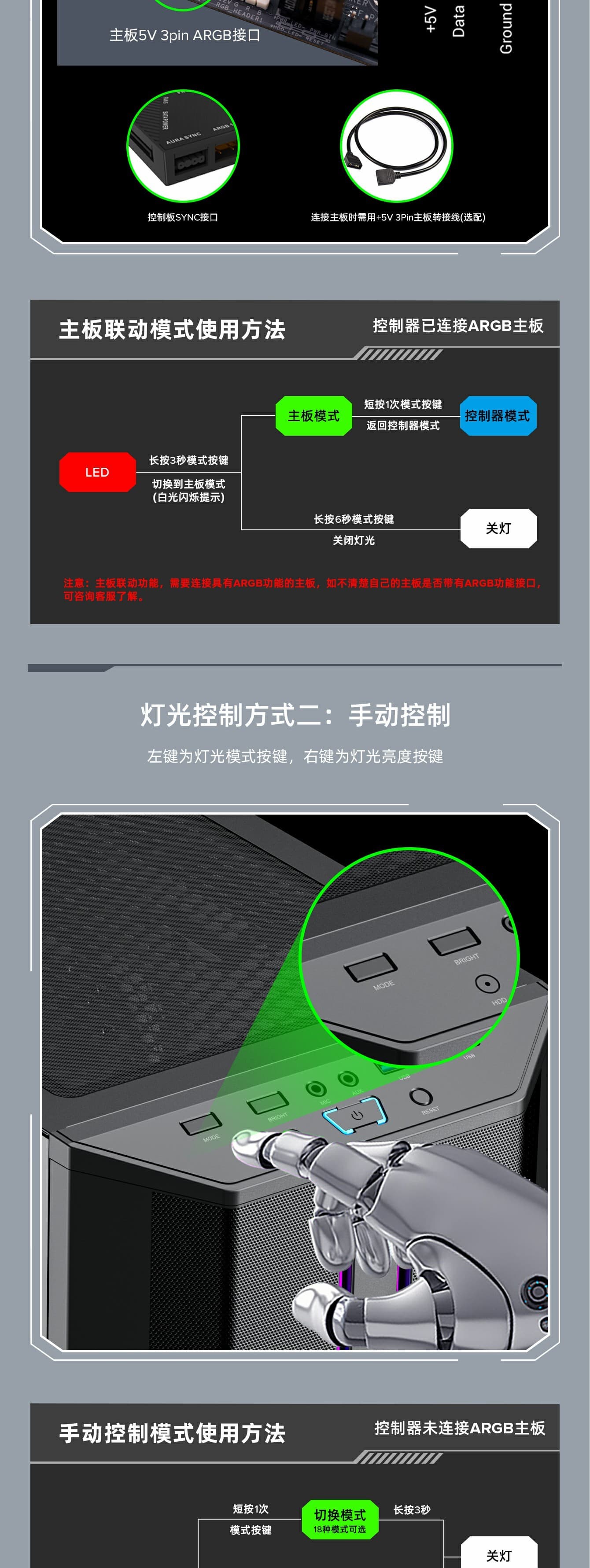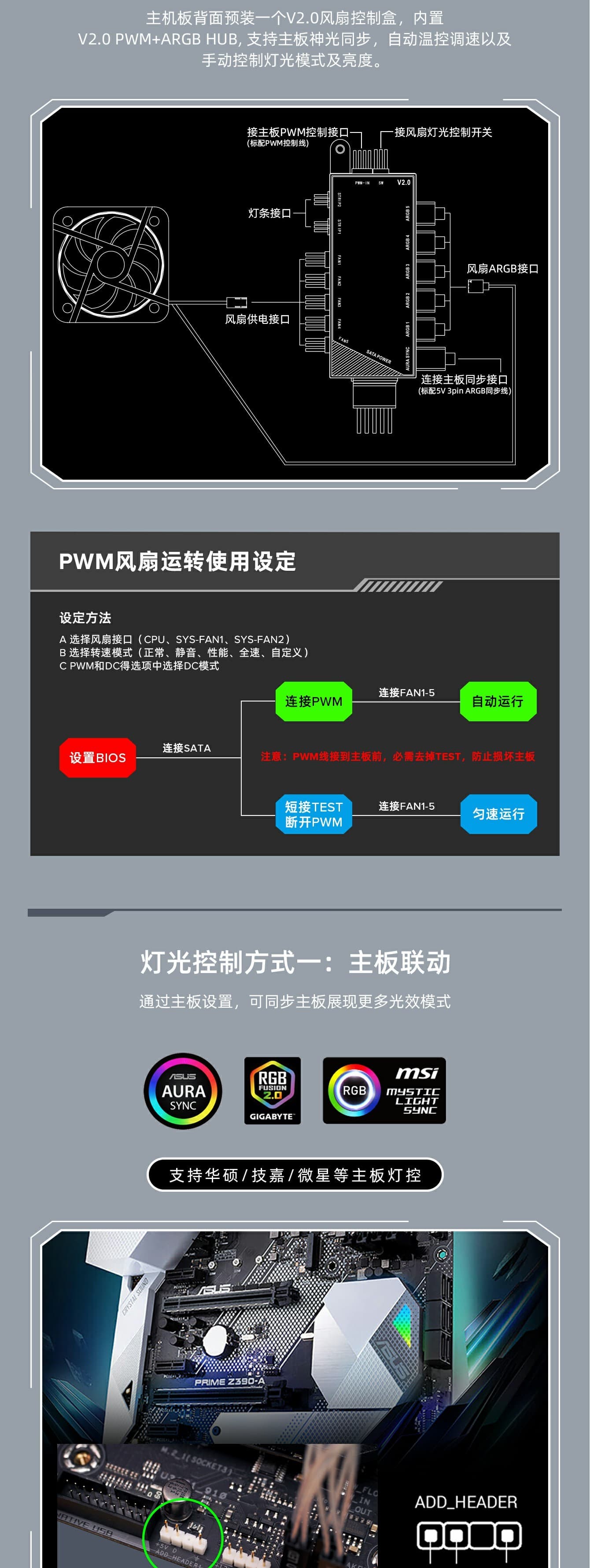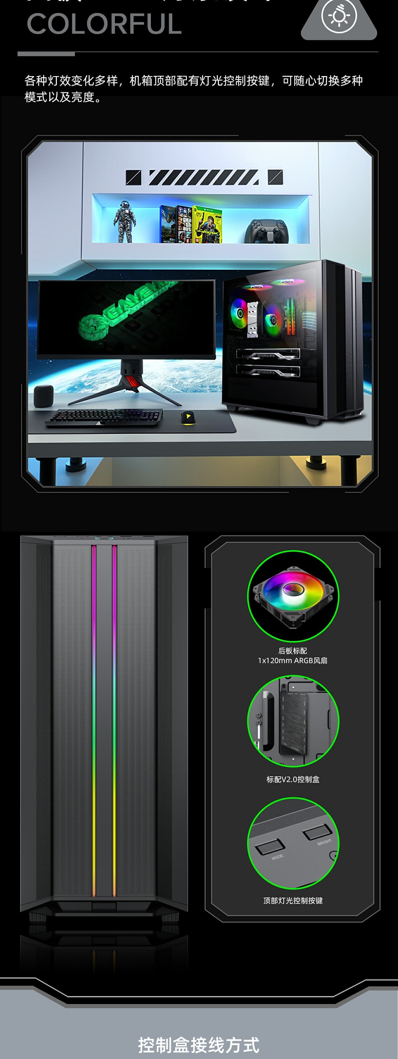 双 ARGB 灯条外观, 配合ARGB HUB 或主板ARUA同步接口控制,提供多种颜色和模式以个性化外观