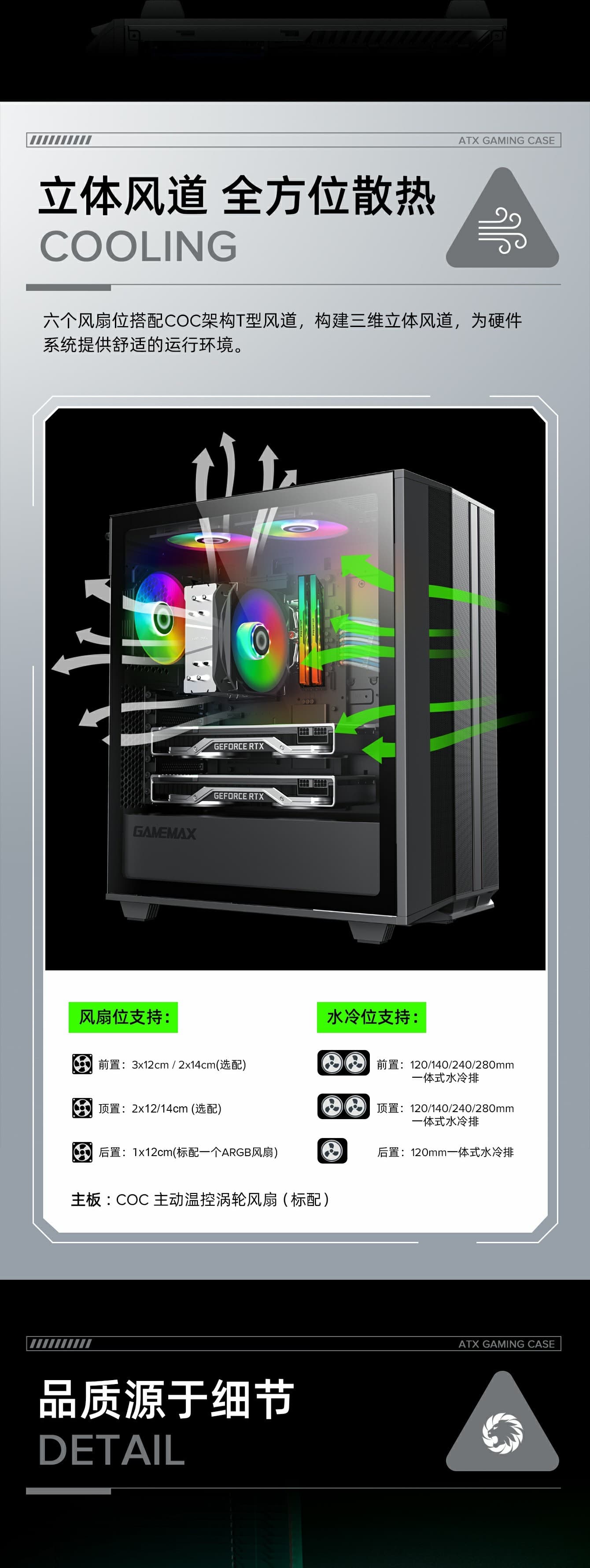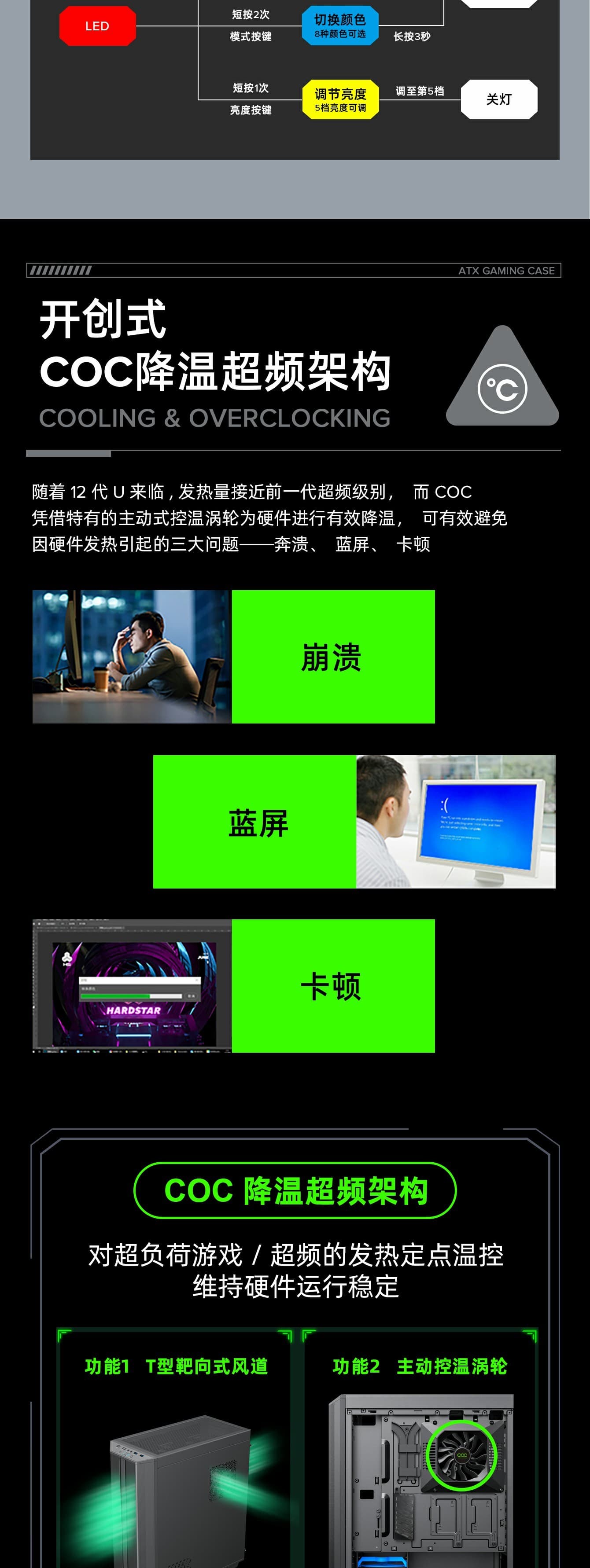 COC(Cooling & Overclocking)涡轮风扇、T型定向风道、主动散热系统、独家专利设计