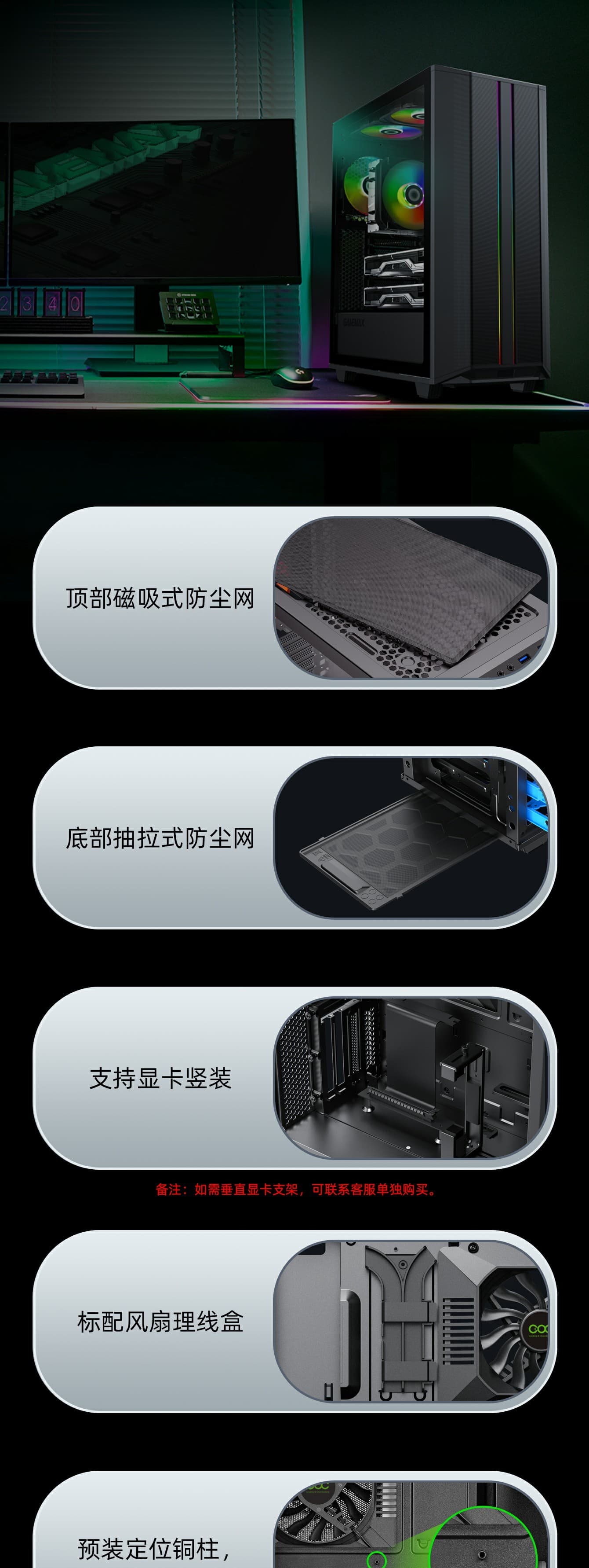 全金属网状前面板一体成型设计,全覆盖防尘小孔设计,聚焦于散热气流。机箱内部大空间, 支持高端显卡及大型散热器