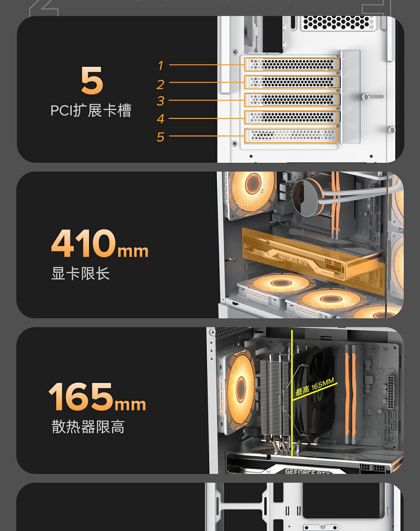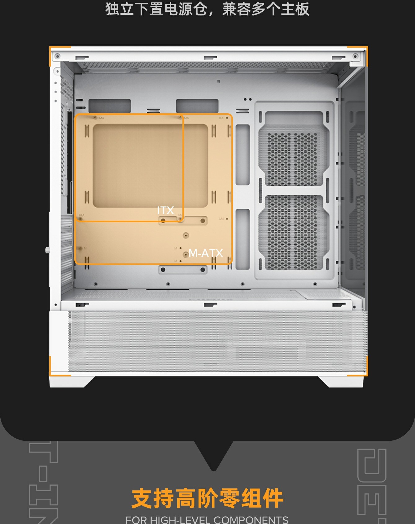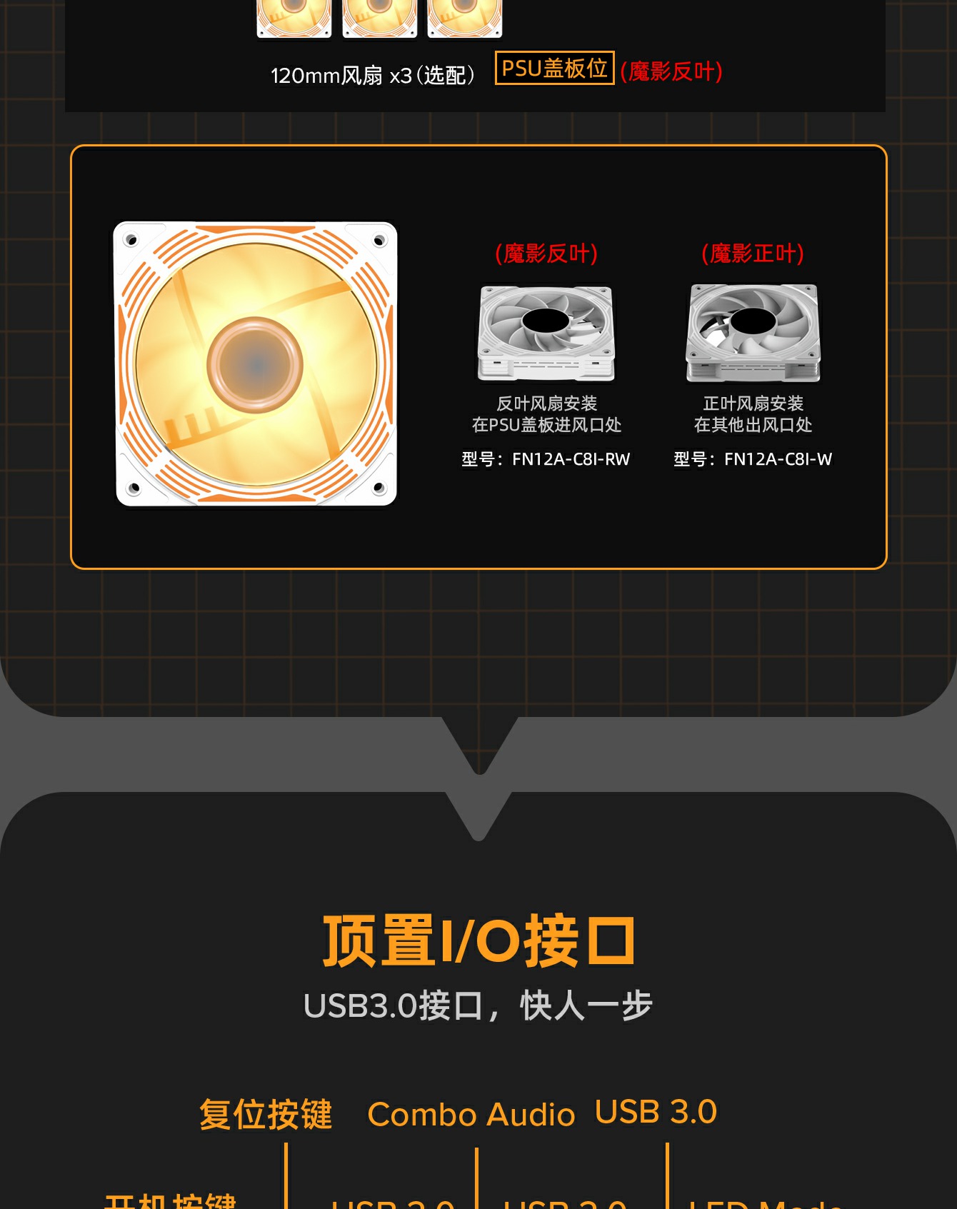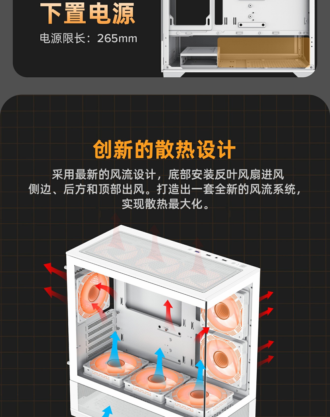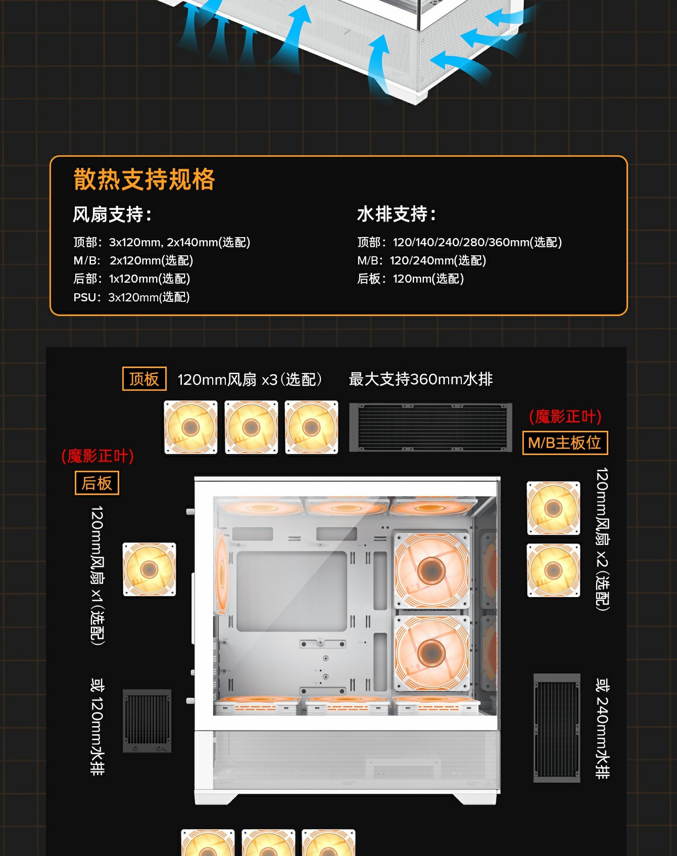 | PSU Cover | 3x120mm (Reverse fan blade)(Fan optional) | |