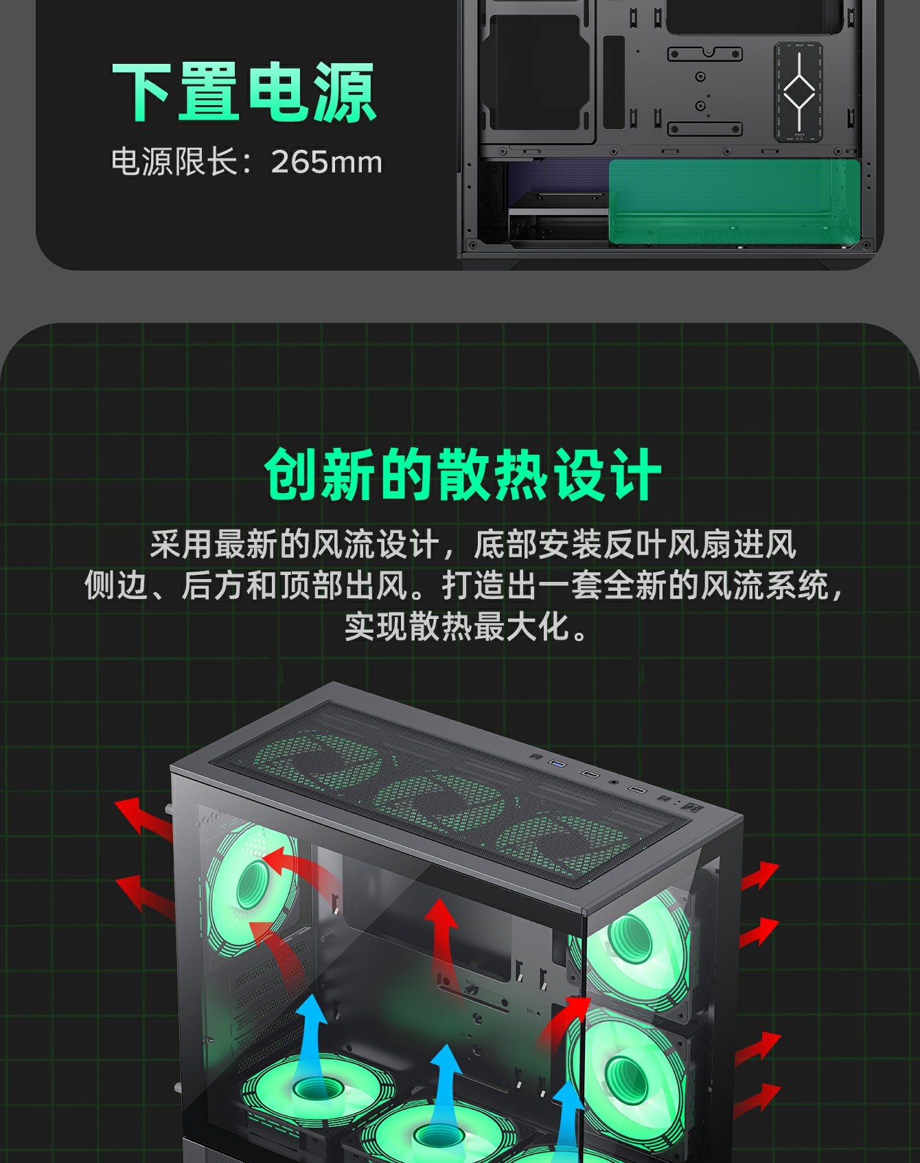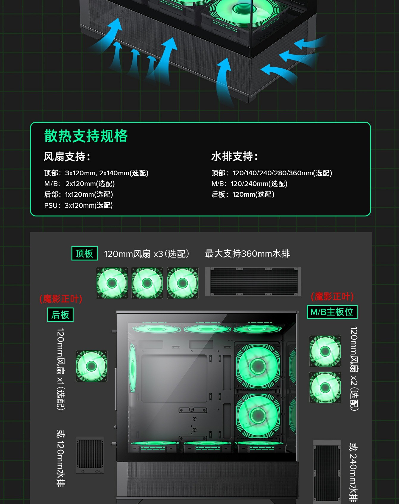 | PSU Cover | 3x120mm (Reverse fan blade)(Fan optional) | |