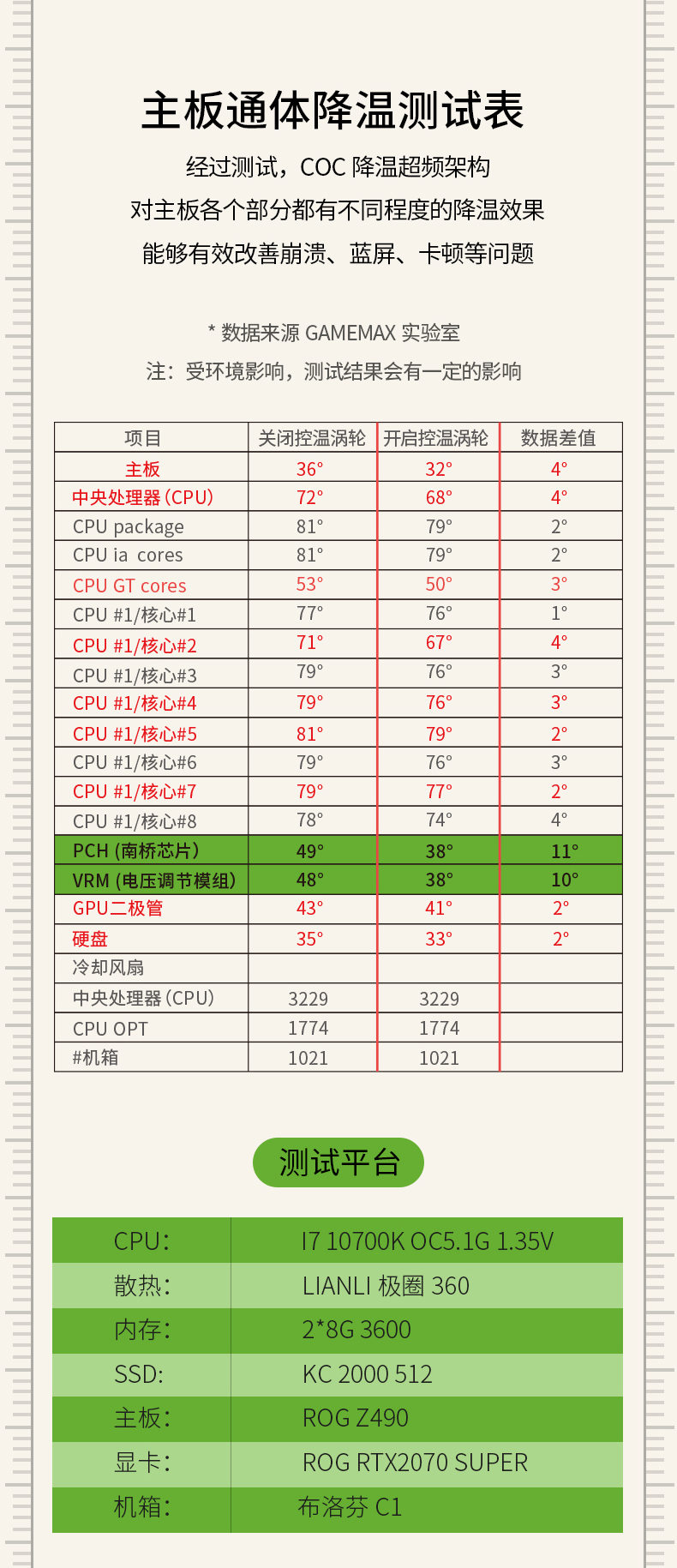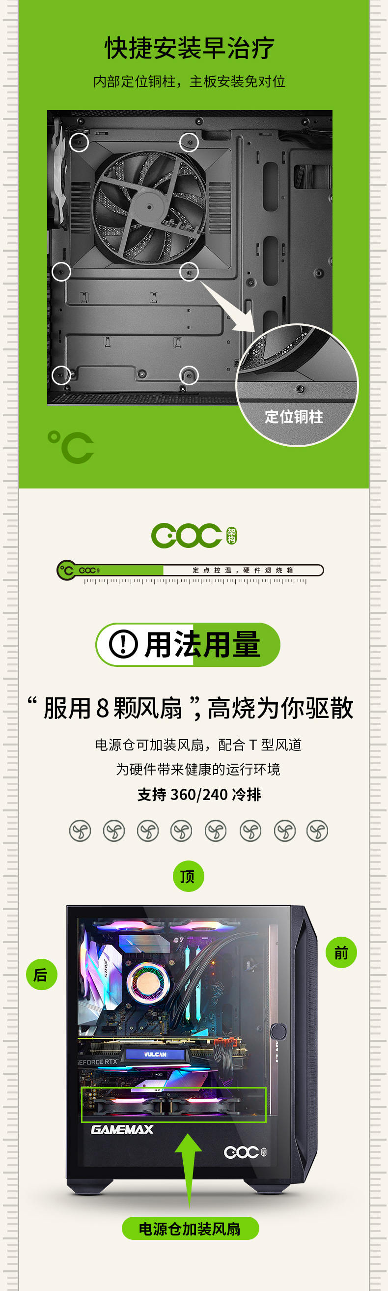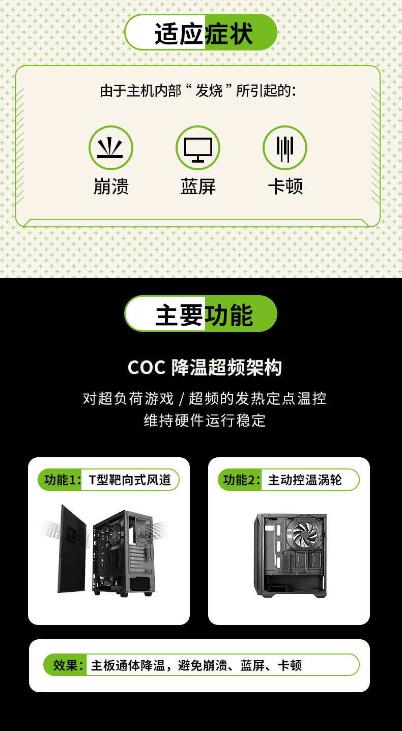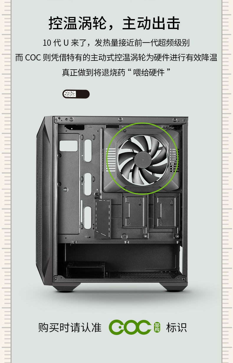 3608 布洛芬C1. 带有COC全新架构。 控温涡轮,主动出击, 10代CPU来了,发热量接近前一代超频级别,而COC则凭借主动式控温涡轮为硬件进行有效降温,真正做对不起退烧药“喂给硬件“