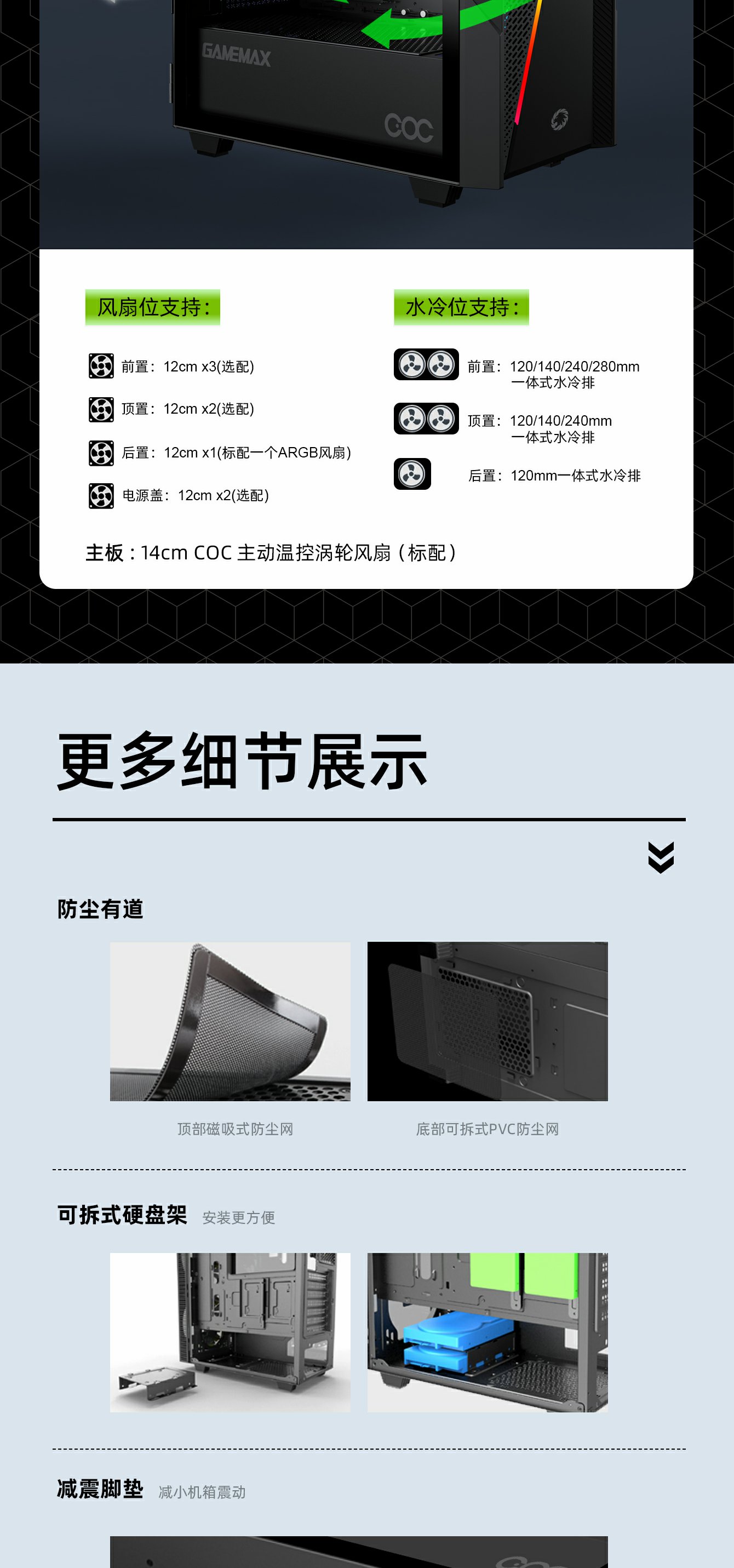 最多可支持8个风扇,电源仓可加装风扇,配合T形风道,为硬件带来健康的运行环境。选配有带有3针ARGB接头的光谱RGB集线器,可直接连接到您的主板,允许您通过主板提供的软件控制风扇和LED灯条同步。