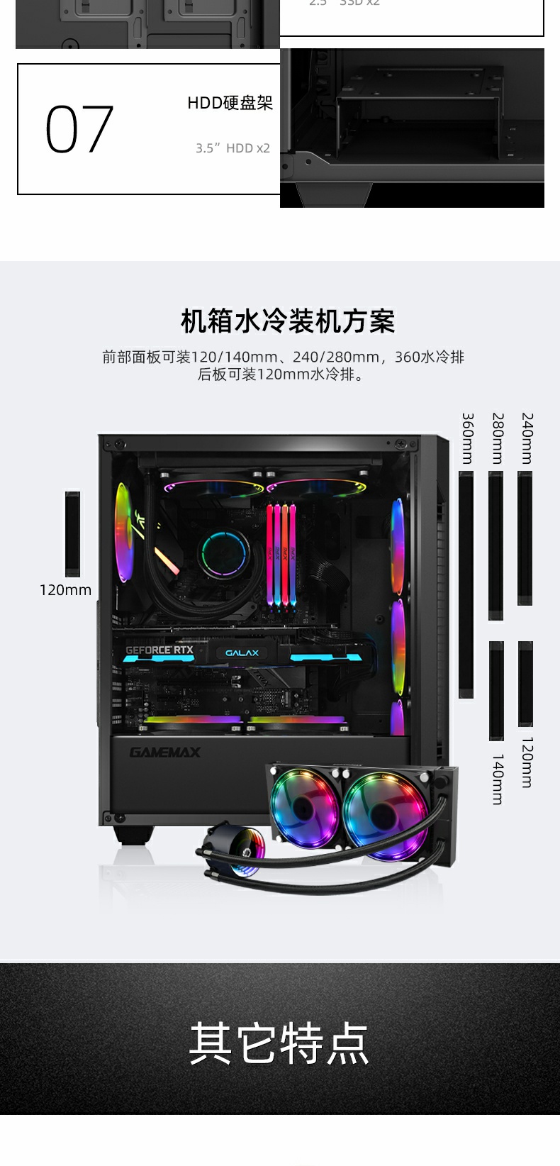 | 水冷 | 前板 | 120mm, 140mm,240mm,280mm,360mm |