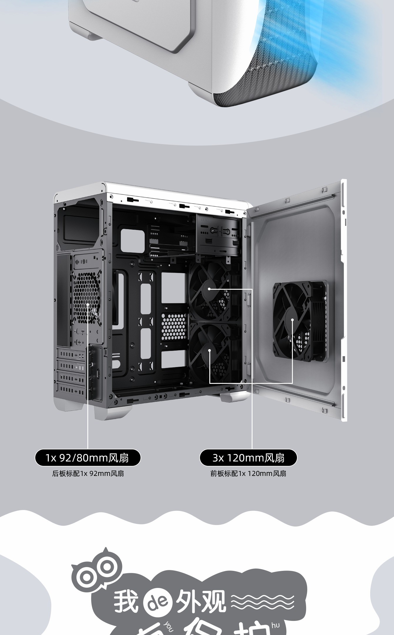 | 散热位支持 | Front | 2x120/92/80mm(Fan optional) |